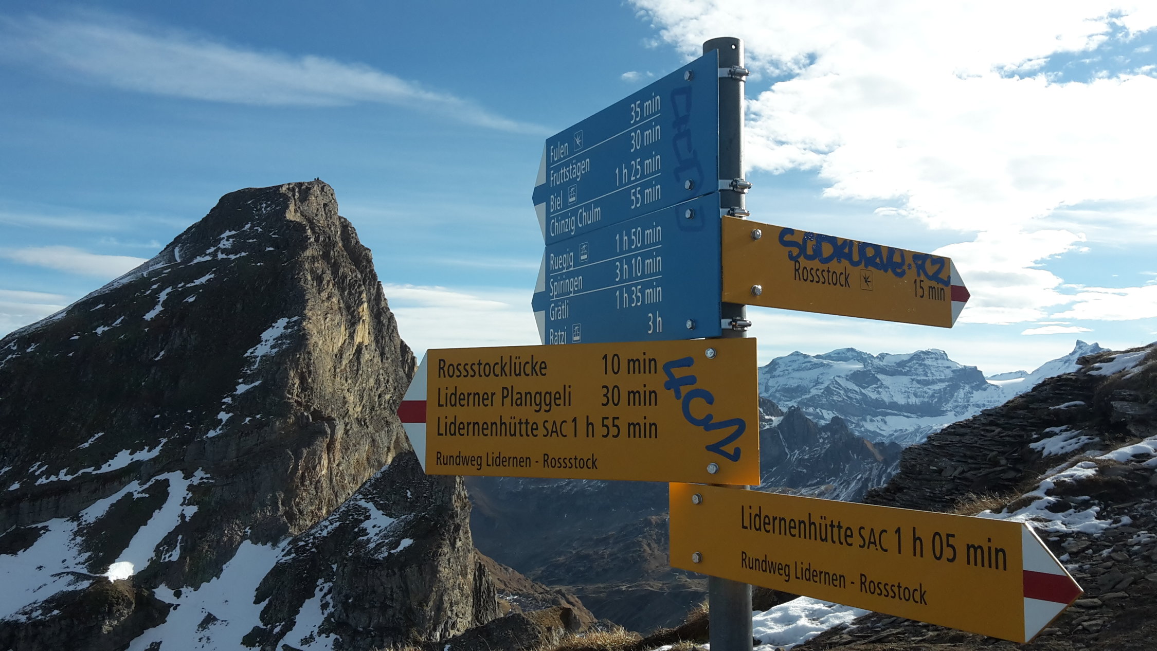 Für das schöne Wetter war das Gebiet überschaubar mit TourlerInnen frequentiert. Leider mussten wir heute etwas sehr Unschönes feststellen. Irgendwelche Fussballfanatiker haben die Wegweiser unterhalb vom Gipfelhang verschmiert.
