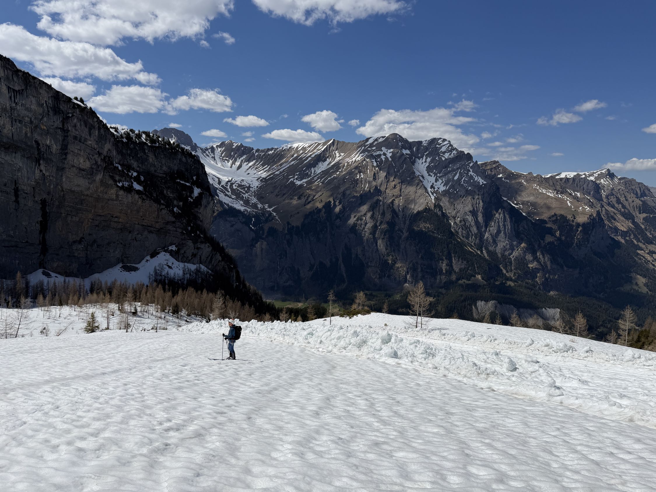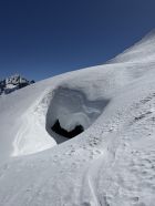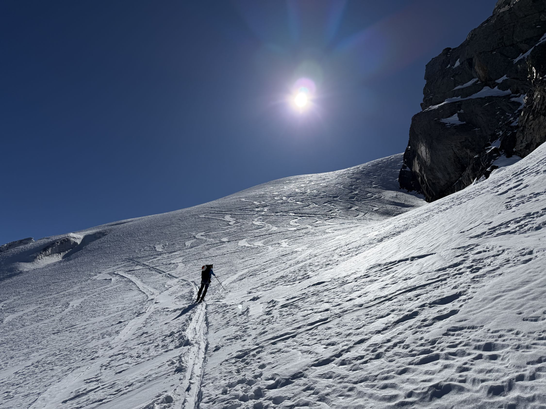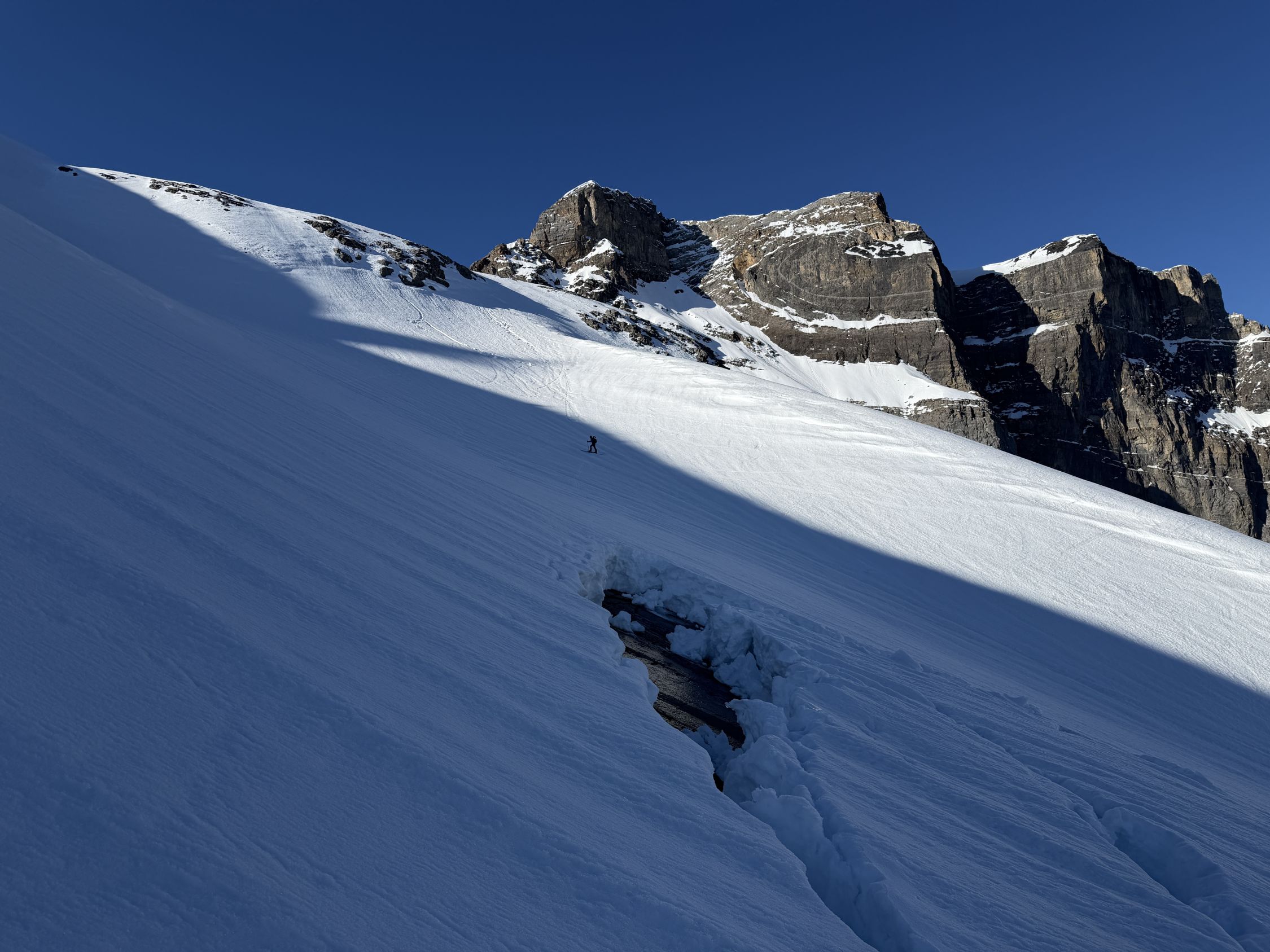 Bei und über der Hütte hat es plattigen Untergrund. Die Gleitschneelawinen kurz vor der Hütte wurden recht gross und sind weit gelaufen. Oberhalb der der Hütte hat es in der Rinne einen beeindruckend grossen Gleitschneeriss. Wir haben uns hier auf der Rippe gehalten wo es ein paar Steine hat.