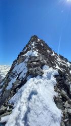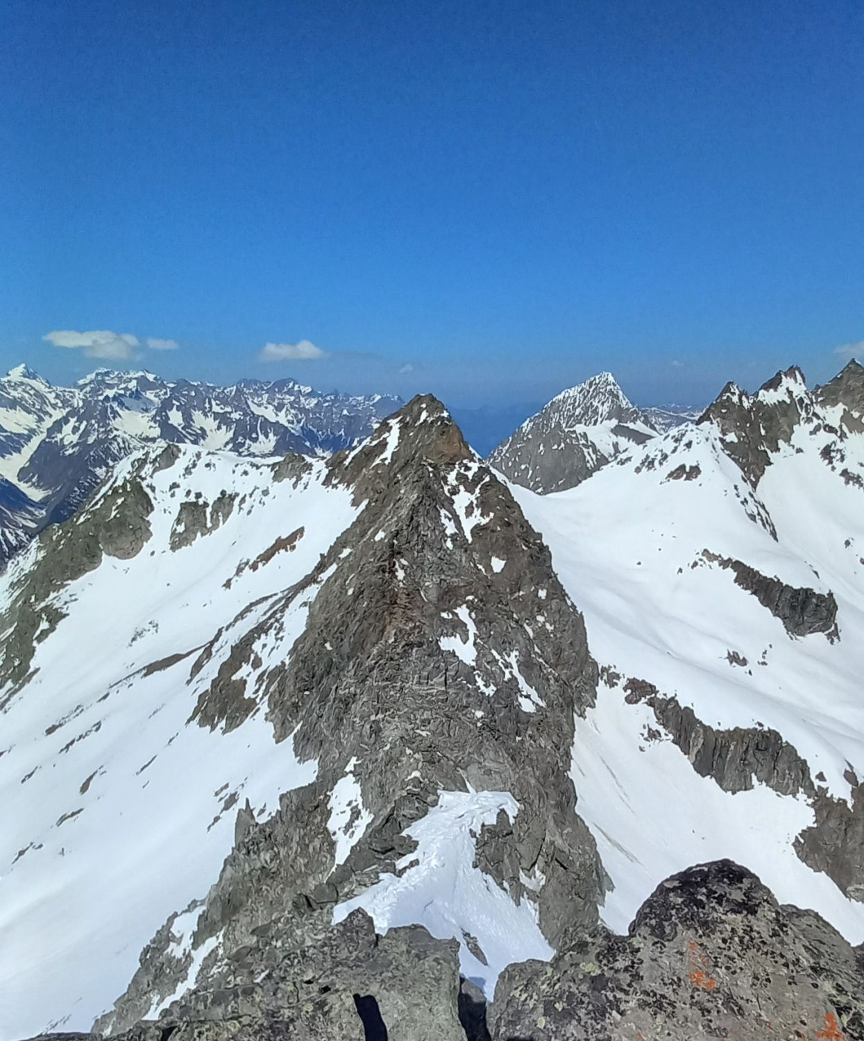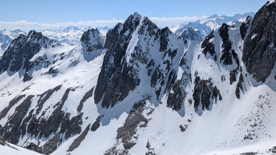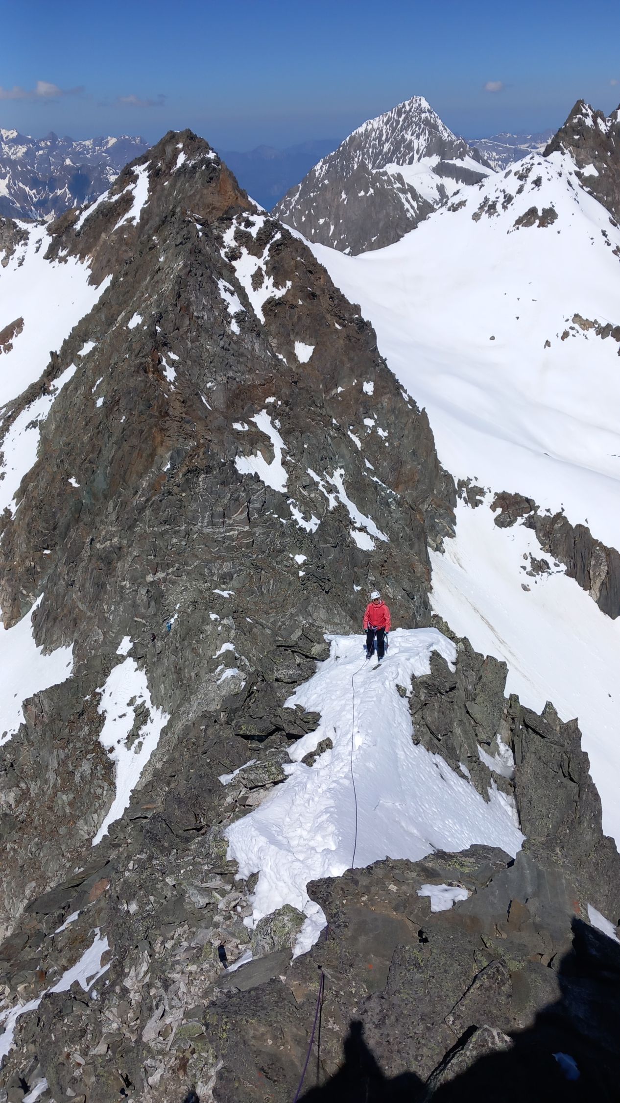 Wir sind den steilen Westhang bis Skidepot mit Ski gegangen, das erfordert eine sehr gute Spitzkehrentechnik, Harscheisen zwingend. Eine Gruppe, wo zeitgleich aufstieg, benutzte Steigeisen und Pickel. Auch kein Seich!