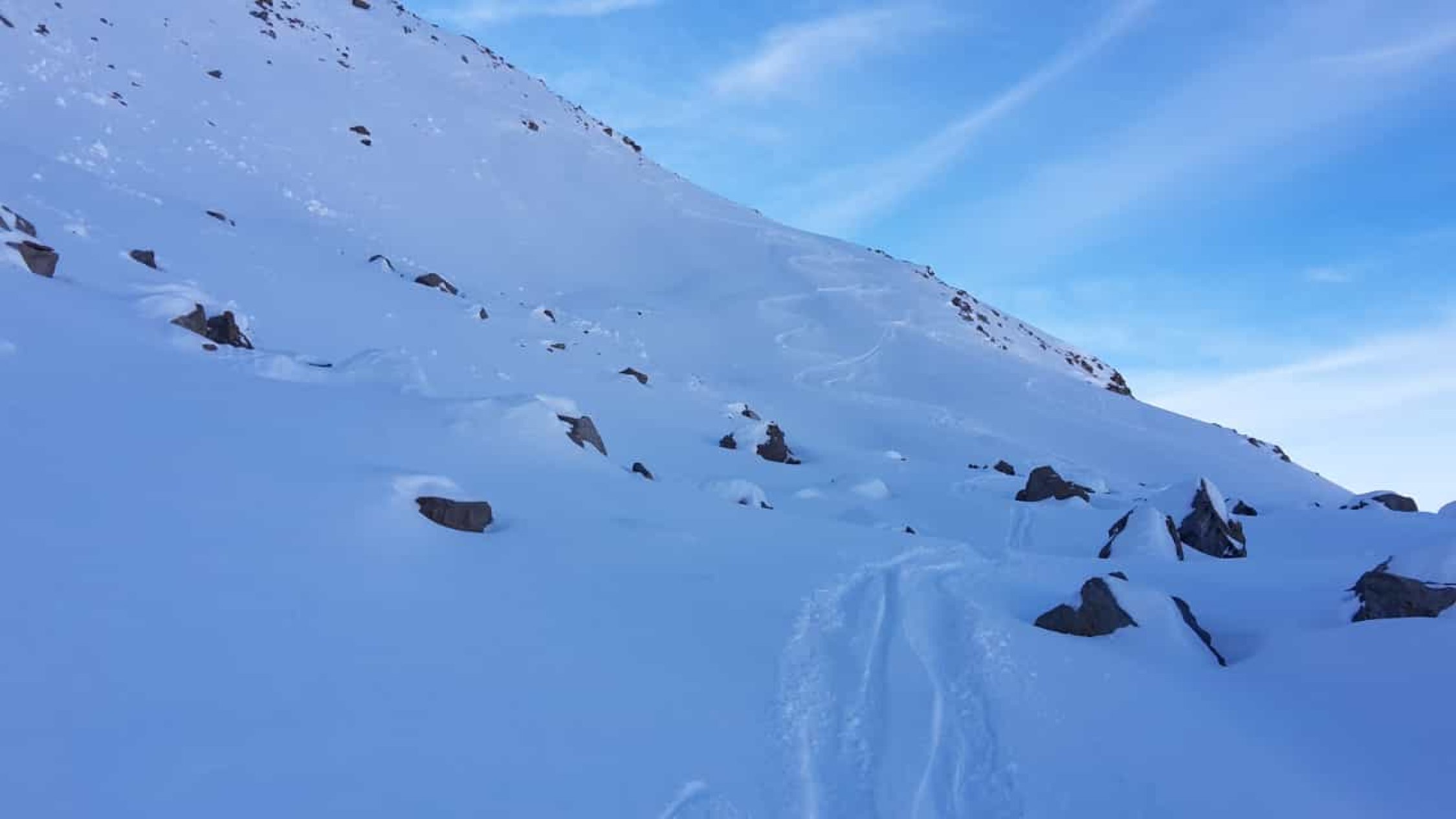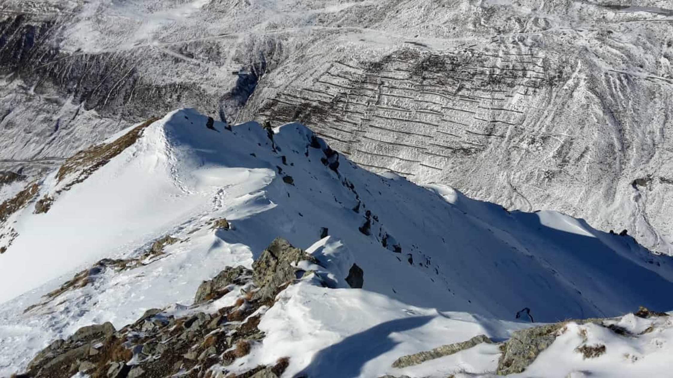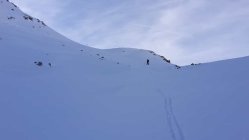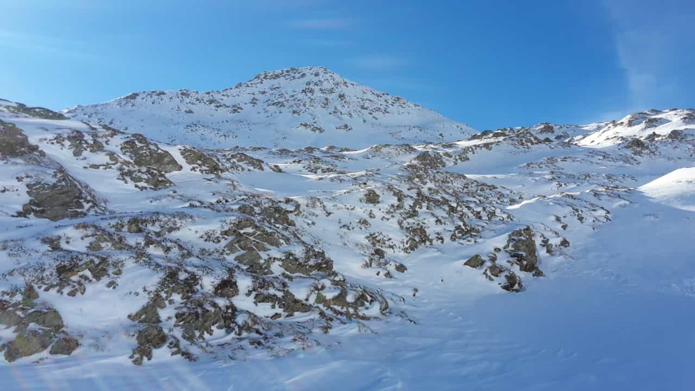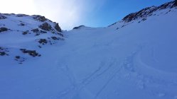 Es hat recht wenig Schnee. Der gefallene Niederschlag der letzten Tage war entäuschend "mager". Auf den ersten ca.150hm müssen die Ski, den Fellen zuliebe, zuweilen mit etwas Bedacht gesetzt werden, da die Unterlage fehlt. Danach wird es zunehmend besser und man kann zügiger aufsteigen. Ab dem Wanderwegweiser auf ca.2600MüM montierte ich die Harscheisen bis zum Skidepot auf ca. 2700MüM. Der Fussaufstieg über den NO-Grat ist ganz gut ohne Steigeisen und/oder Pickel zu bewältigen. Etwas unsicheren TourlerInnen würde ich diese jedoch empfehlen.