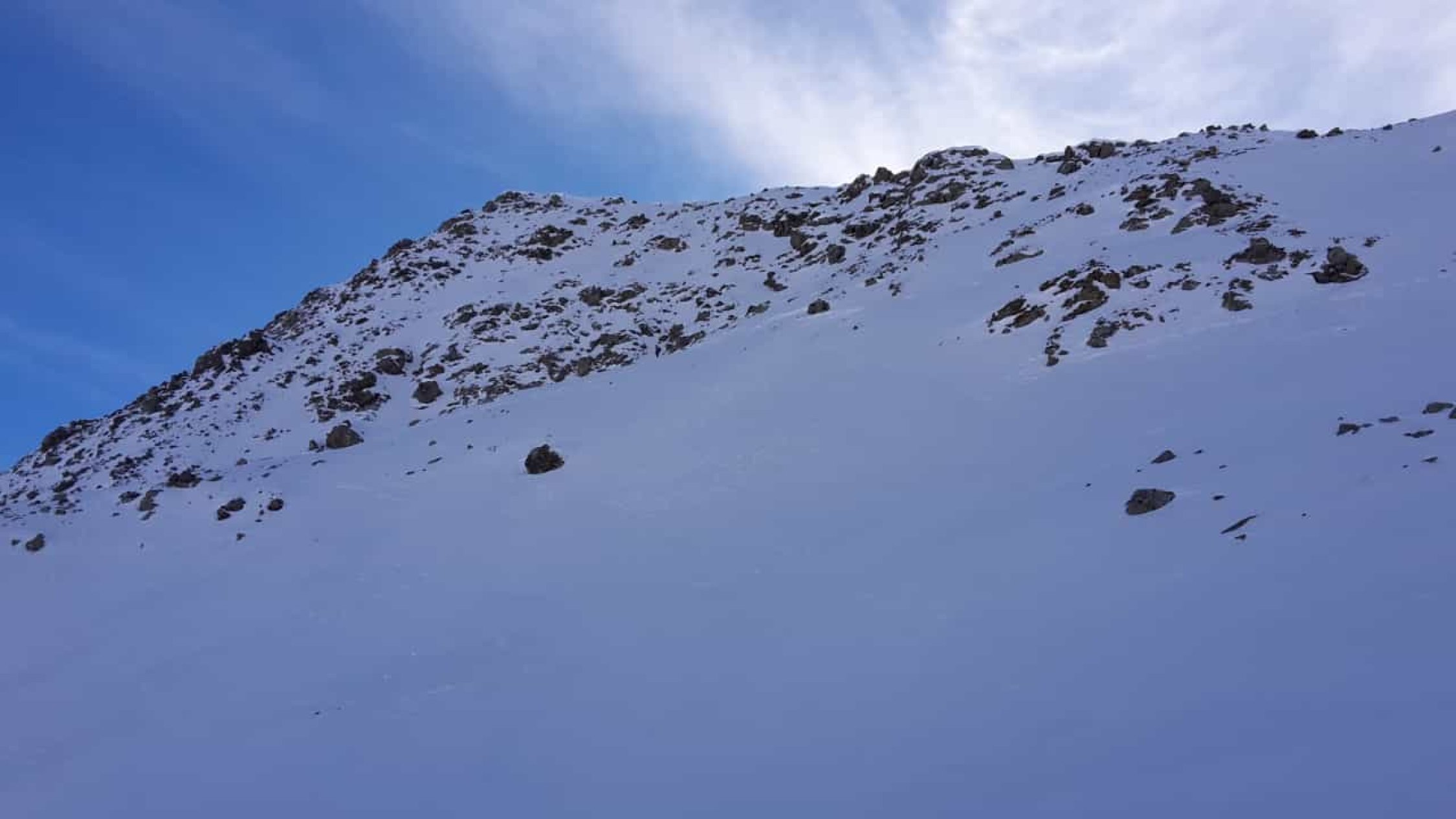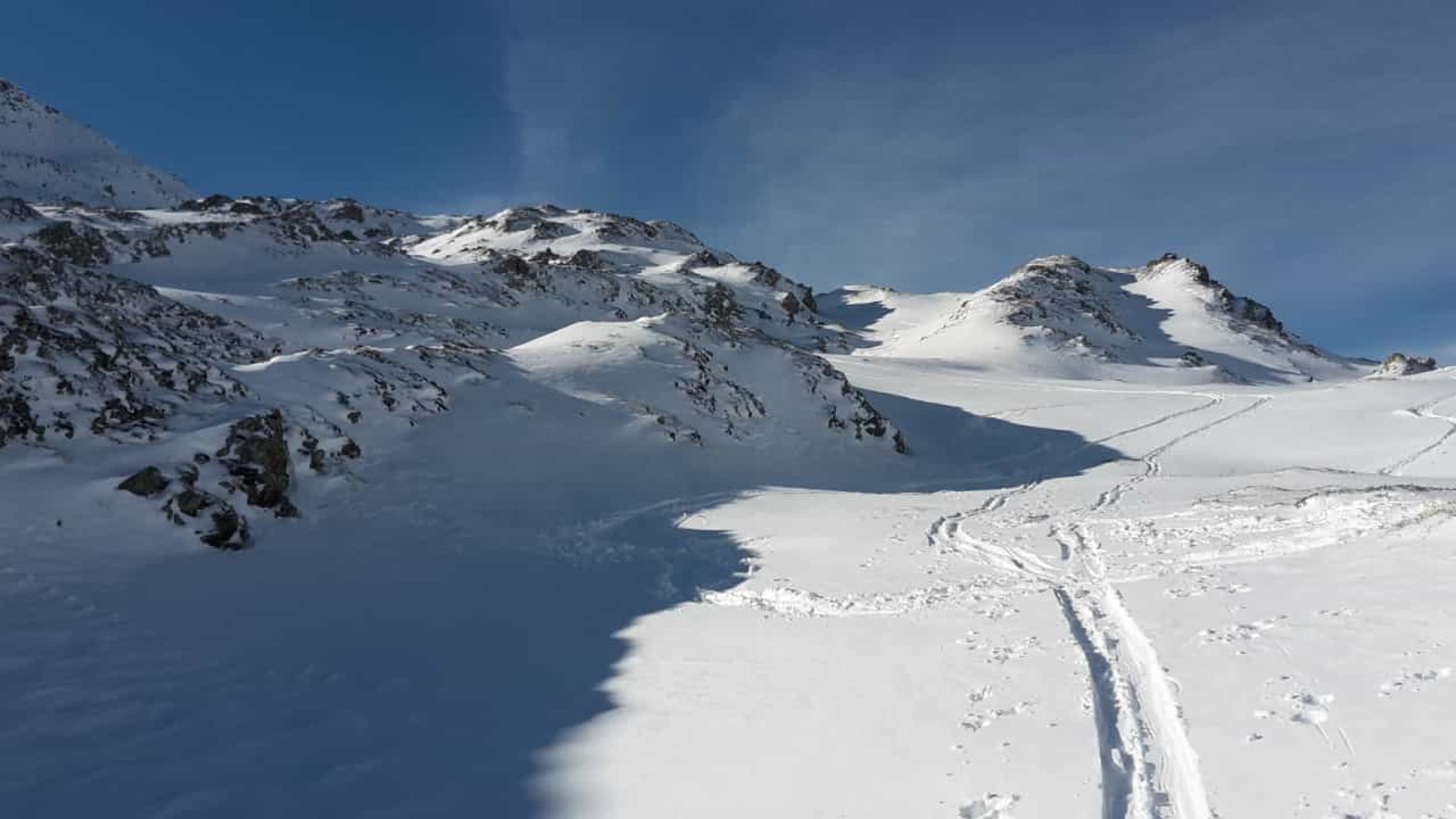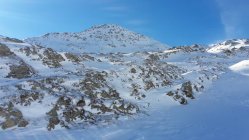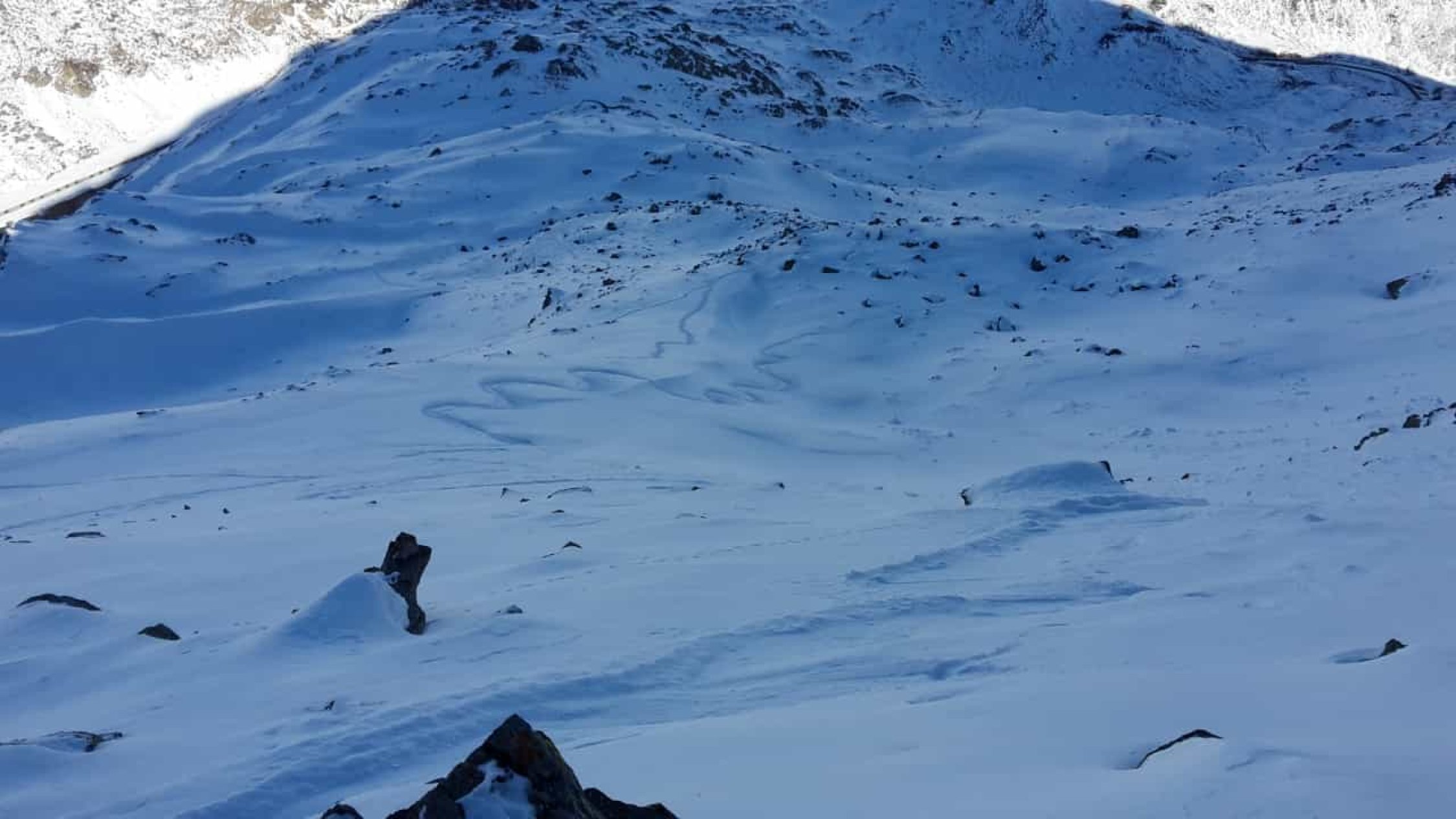 Es hat recht wenig Schnee. Der gefallene Niederschlag der letzten Tage war entäuschend "mager". Auf den ersten ca.150hm müssen die Ski, den Fellen zuliebe, zuweilen mit etwas Bedacht gesetzt werden, da die Unterlage fehlt. Danach wird es zunehmend besser und man kann zügiger aufsteigen. Ab dem Wanderwegweiser auf ca.2600MüM montierte ich die Harscheisen bis zum Skidepot auf ca. 2700MüM. Der Fussaufstieg über den NO-Grat ist ganz gut ohne Steigeisen und/oder Pickel zu bewältigen. Etwas unsicheren TourlerInnen würde ich diese jedoch empfehlen.