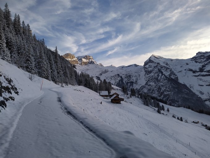 Der Abstieg ging dann um einiges flotter. Kurz vor Sonnenuntergang erreichte ich wieder die Rugghubelhütte. Bis zur Rugghubelhütte sind scheinbar noch einige andere gegangen. Deshalb ab hier auf dem Rückweg bis zum Rigidalstafel sehr gutes Vorankommen. Die Strasse zwischen Ristis un Rigidalstafel wurde während dem Tag befahren, und der Schnee taute zu Matsch und gefror wieder. Kein Traum zum Laufen, aber wenigstens nicht glatt. Der Abstieg nach Engelberg konnte dann mit einer Mischung aus Restschnee, Schlamm und Eis auftrumpfen. Die einsetzende Dunkelheit machte diesen Mix sogar noch pricklender, trotz Stirnlampe.