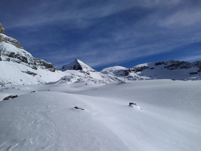 Der Gipfelauftieg zum Engelberger Rotstock (ERS) war heute etwas harzig: minim zu viel Schnee, als das man den Weg leicht erkannt hätte, jedoch zuwenig um genussvoll in Diretissima aufzusteigen. Das Gestein am ERS ist ja nicht gerade von bester Qualität, um ein wenig zu untertreiben. Ich folgte im unteren Bereich mehr oder weniger dem was ich als Weg erachtete und ging oben frei. Pickel und Steigeisen waren hier für mich angenehm, aber eher wegen dem schiefrigen Gestein als wegen dem Schnee.