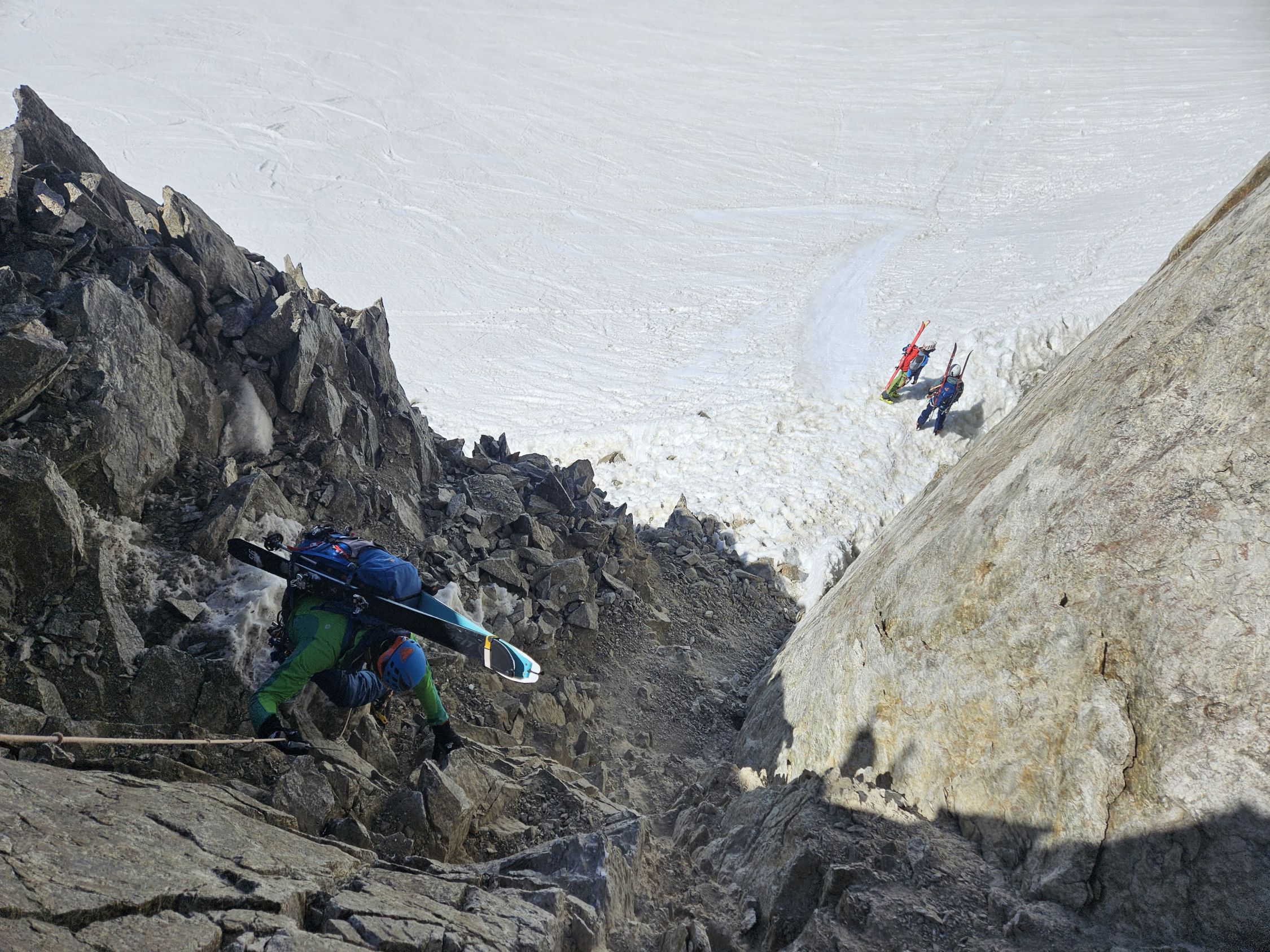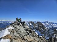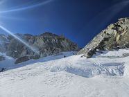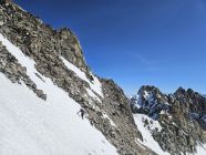 Anschließend ging es zum Col de la Grand-Luy (3416 m), der in beide Richtungen mit Knoten-Seilen gesichert ist. Der Aufstieg war mit 50° extrem steil und teilweise ohne Tritte. Am Aufstieg zum Grand-Luy hingegen lag weicher Schnee, was uns die Sache sehr erleichterte.