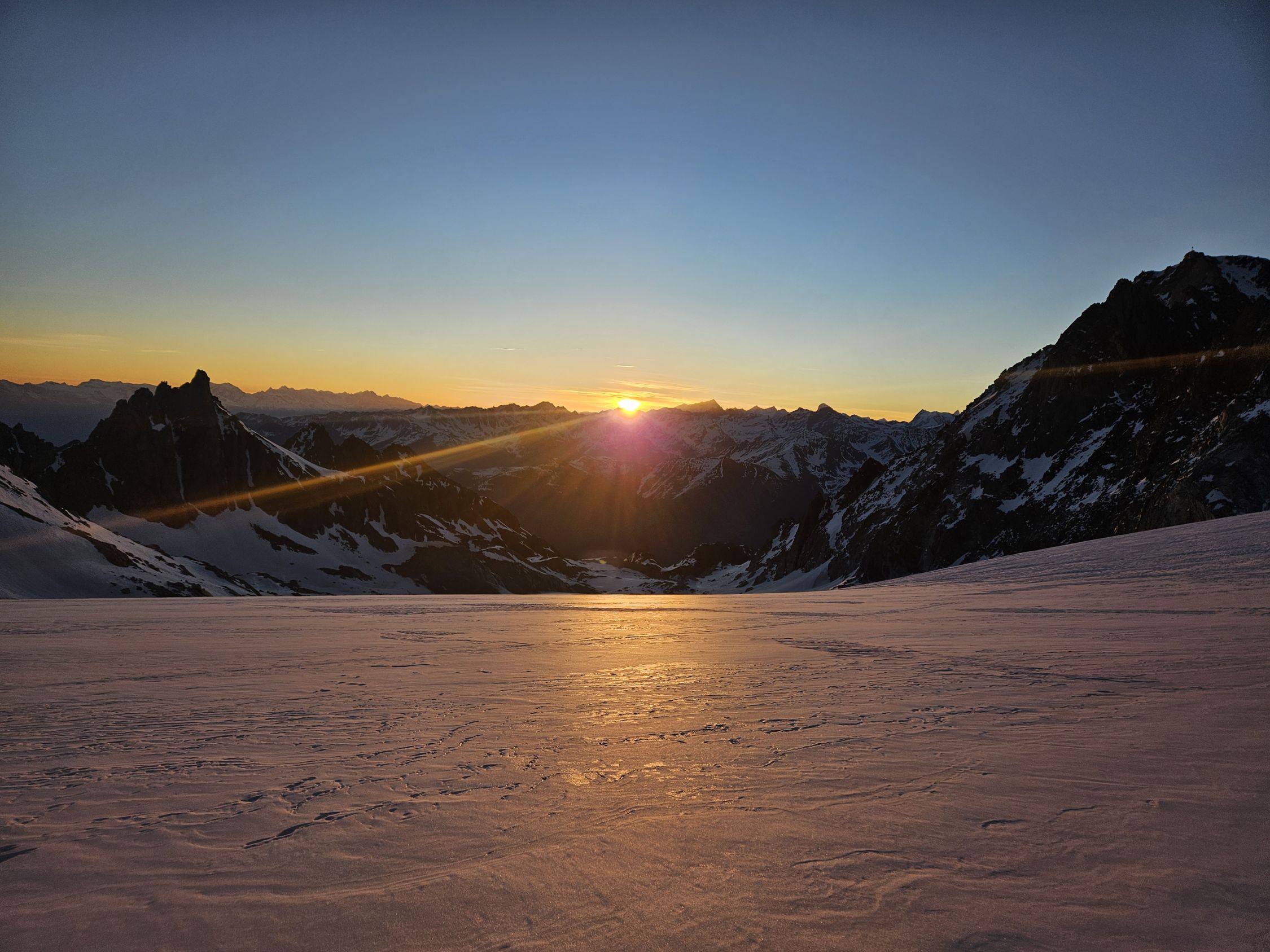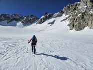 Wir sind von der Cabane du Trient gestartet. Zunächst ging es über den Col des Plines (3294 m) zum Glacier de Saleinaz runter. Der Abstieg vom Col des Plines ist schwer zu finden und unangenehm steil (50°), weil trittarm.