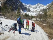 Oben eine Art aufgeschäumter Schnee, der gut fahrbar war bis zur Hälfte, dann vermehrt Sulzschnee. Zweimal mussten wir kurz tragen. Zum Dorf La Fouly war es unter einem Kilometer Tragesteecke.