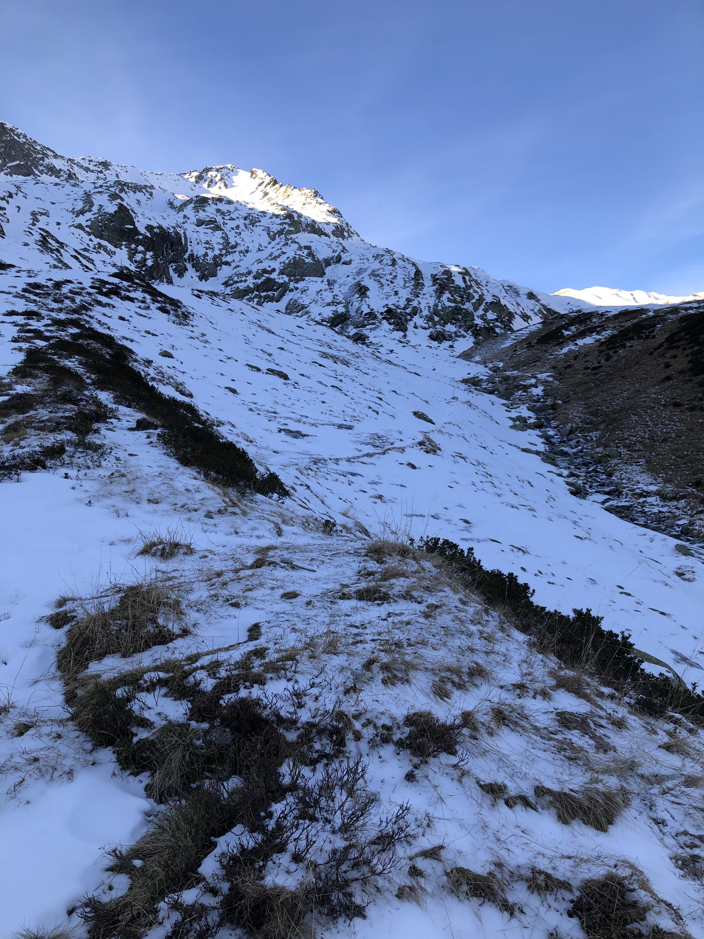 Harte Verhältnisse, Ski können ab Berghaus angeschnallt werden, man muss allerdings die ersten Meter etwas um die Steine herum zirkeln ab 2100 ist das erledigt.