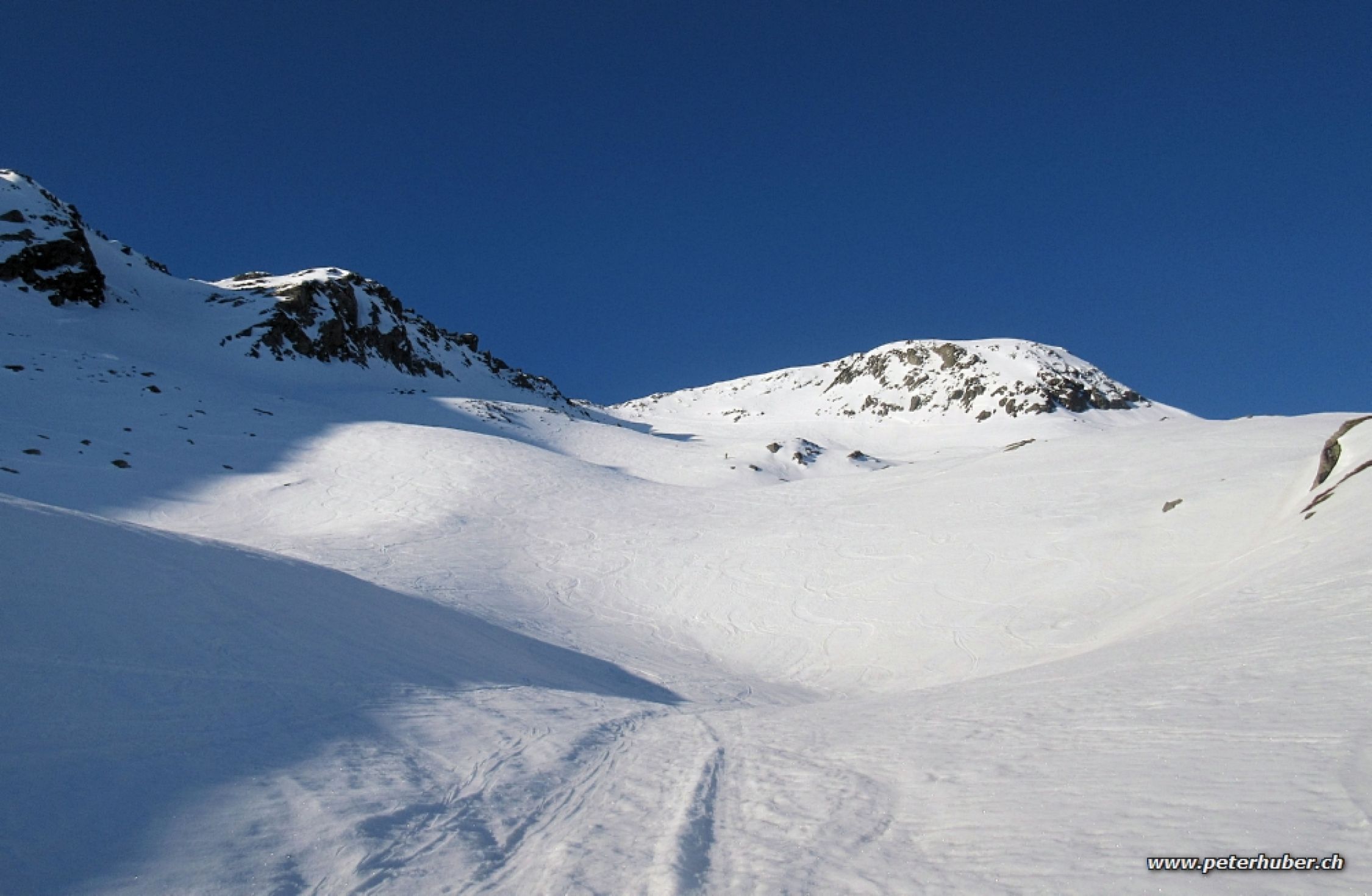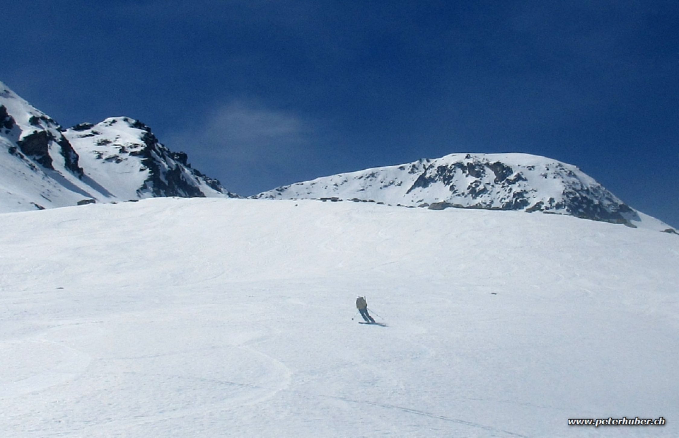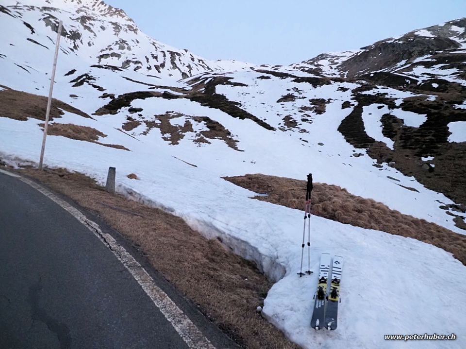 Abfahrt: Start um 11 Uhr beim Skidepot. Oben oft hart mit etlichen alten Spuren. Dann in den stark sonnenexponierten Stellenb weicher. Ab der Umrundung des Lattenhorns stellenweise recht sulzig, schattseitig hart bis zum Zollhaus hinunter. Komischerweise sulzte der Schnee gleich schlagartig auf mit zirka 5 cm Tiefe. Es gab keinen Übergang mit zuerst nur leichtem Sulz.