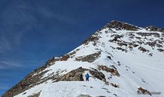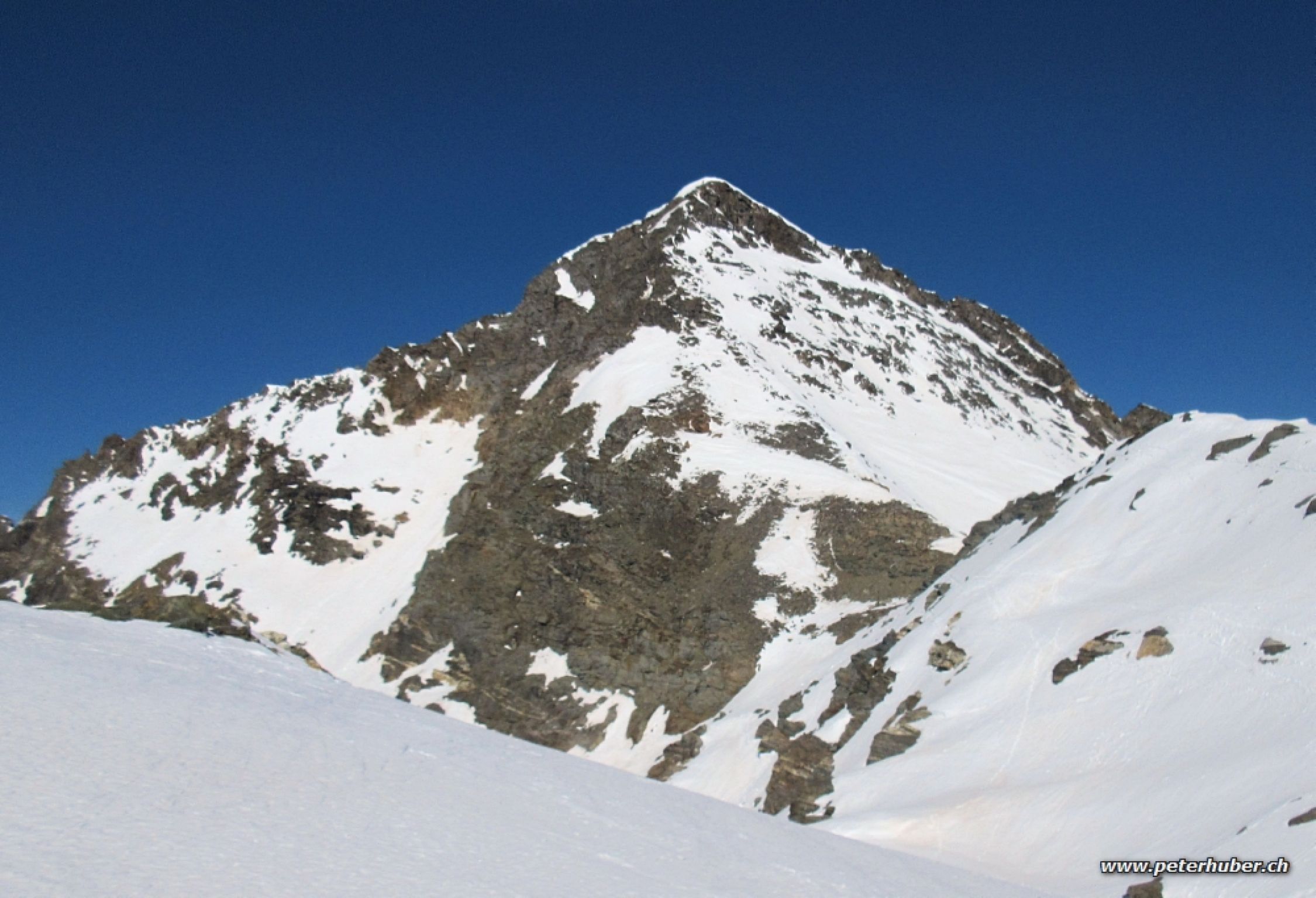 Skidepot bei zirka 3100 m. Mit guten Trittschnee, etwas Eis und über Felsen problemlos zum Gipfel hinauf-.