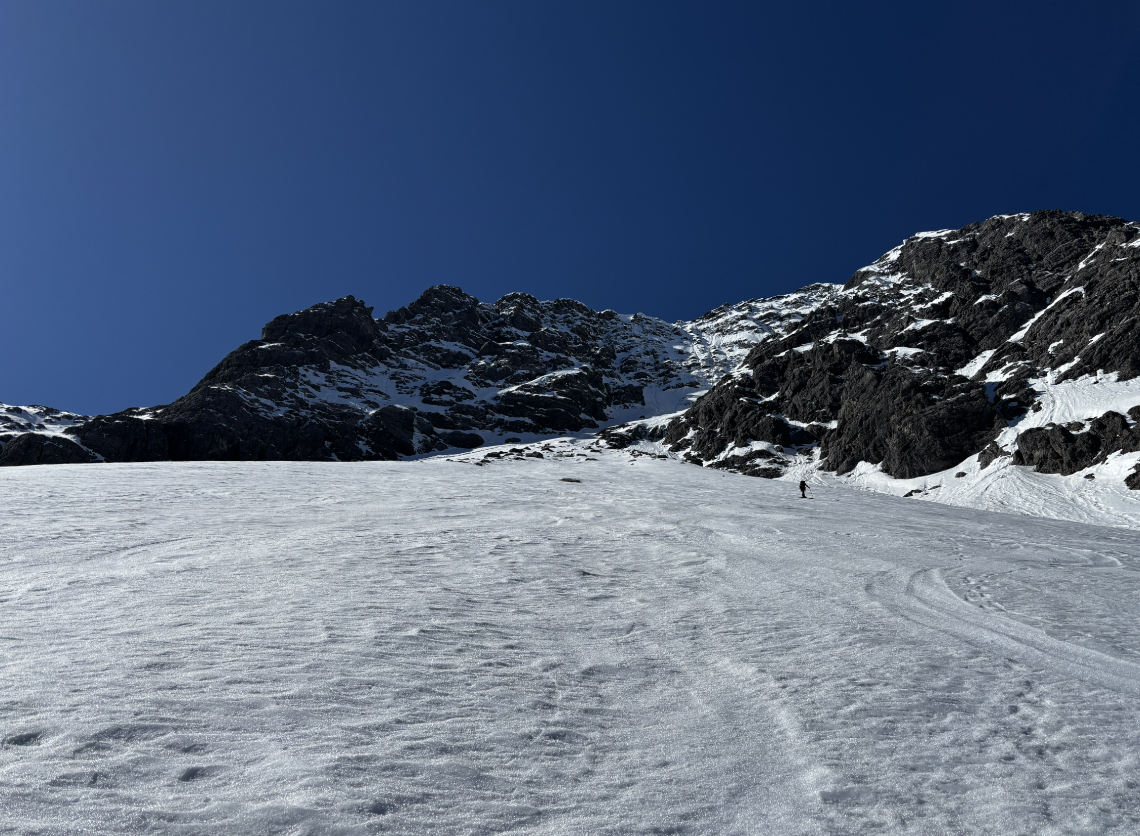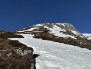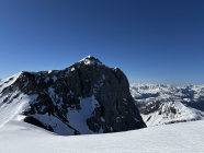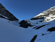 Start ab Parkplatz nähe Fischteich um 7:20 Uhr bei +2 Grad. Es hat noch überrachend viel Schnee auf dieser Höhe und doch muss man im Aufstieg entlang des Stierlochbachs 5-6 kleine Tragestücke in Kauf nehmen. Am Morgen war der Schnee bis zum Stierlochjoch hart gefroren. Der Aufstieg über die Steilstufe zum Joch entsprechend konzentriert zu gehen. Danach warf die Sonne bereits ihre Energie auf die Steilstufe, die schon etwas frühlingshaft ausgeapert ist. Heute und wahrscheinlich noch 2-3 Tage sollte es jedoch ohne Tragepassage gehen. Danach bis zum Gipfel gute Spur.