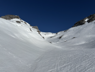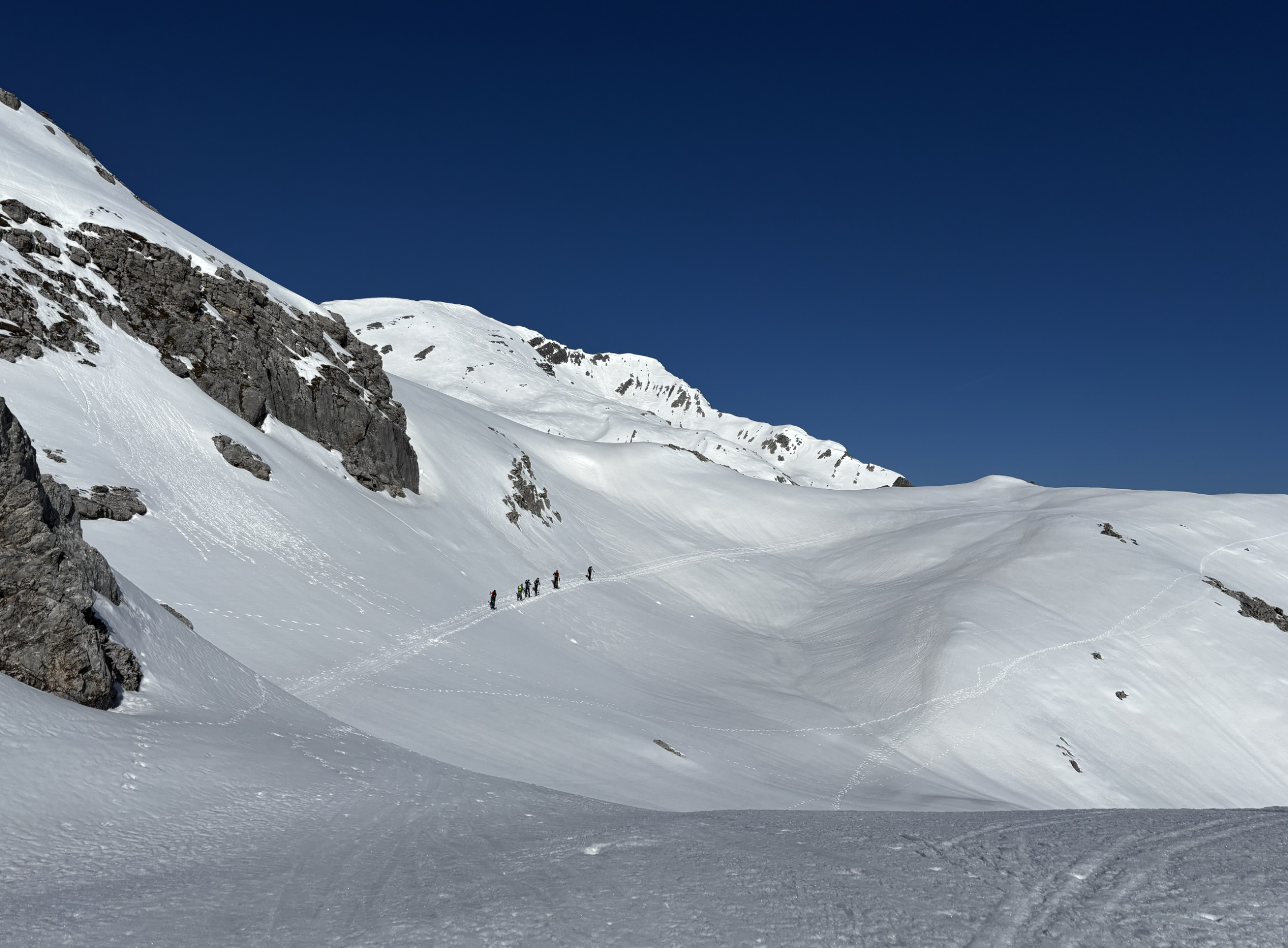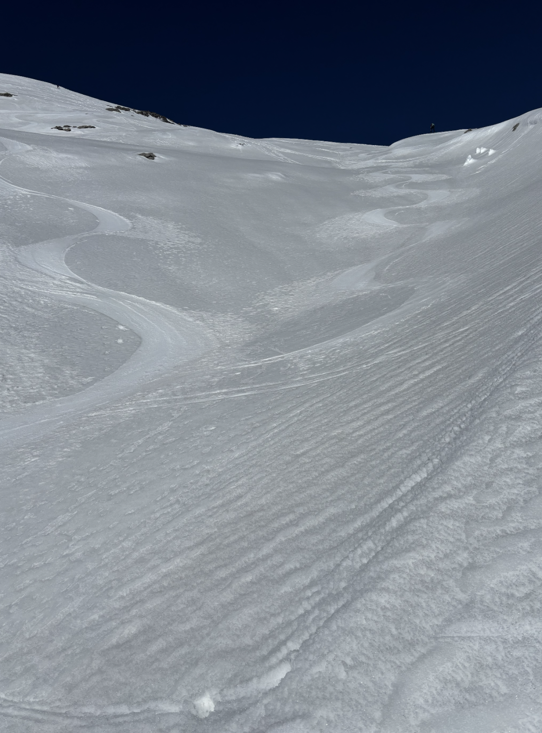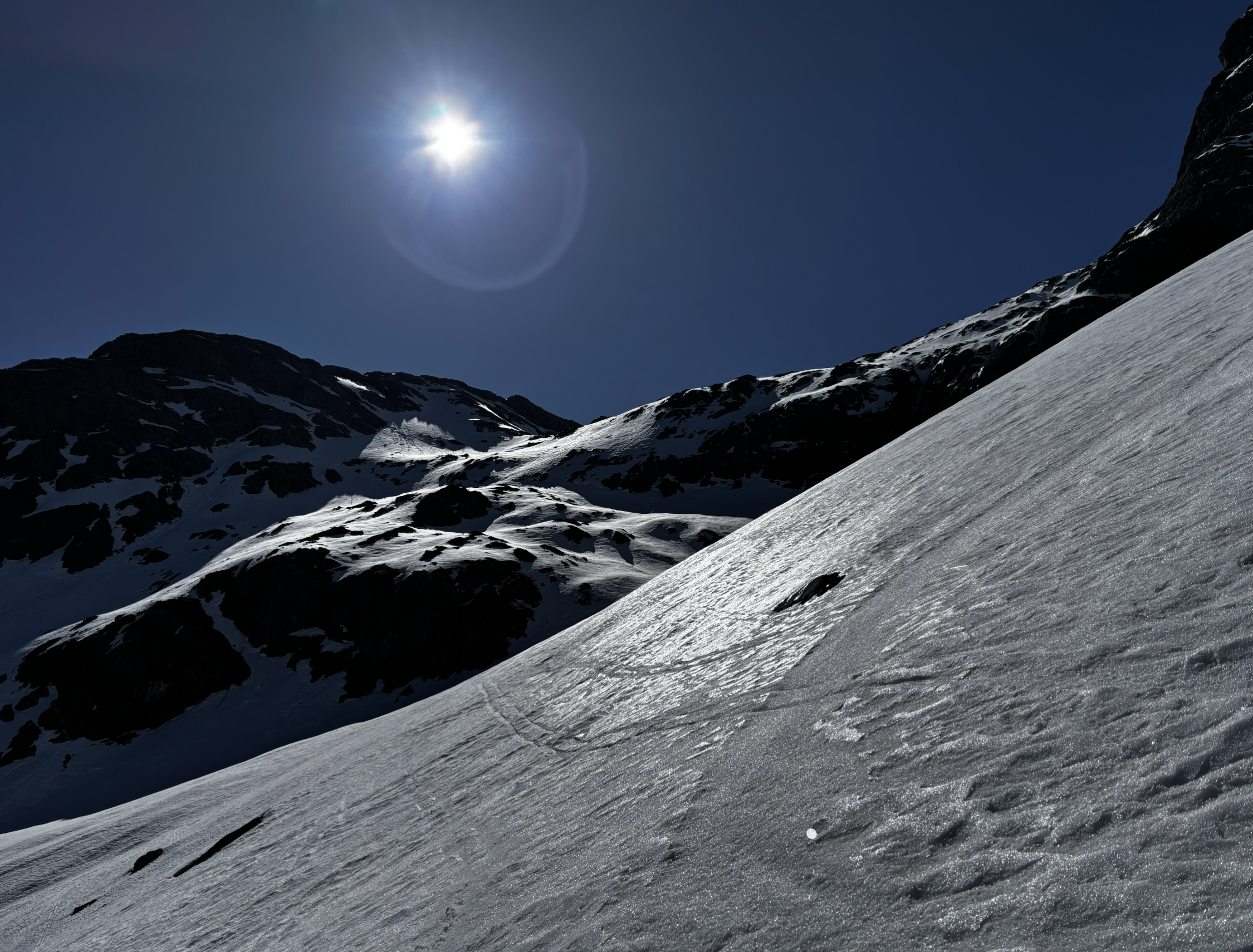 Abfahrt um 9:40 Uhr vom Gipfelhang schöner Sulz. Die Steilstufe vor der Querung zu "auf der Rüfi" war sehr hart und eisig. "Auf der Rüfi" dann bereits an den länger sonnenbeschienenen westlichen Hängen aufgefirnt. Der untere Bereich mit dem alten Lawinenschnee ist dann weniger "lustig" zu fahren. 3-4 Tragestrecken auch hier auf dem Weg über die Loipe zurück.
