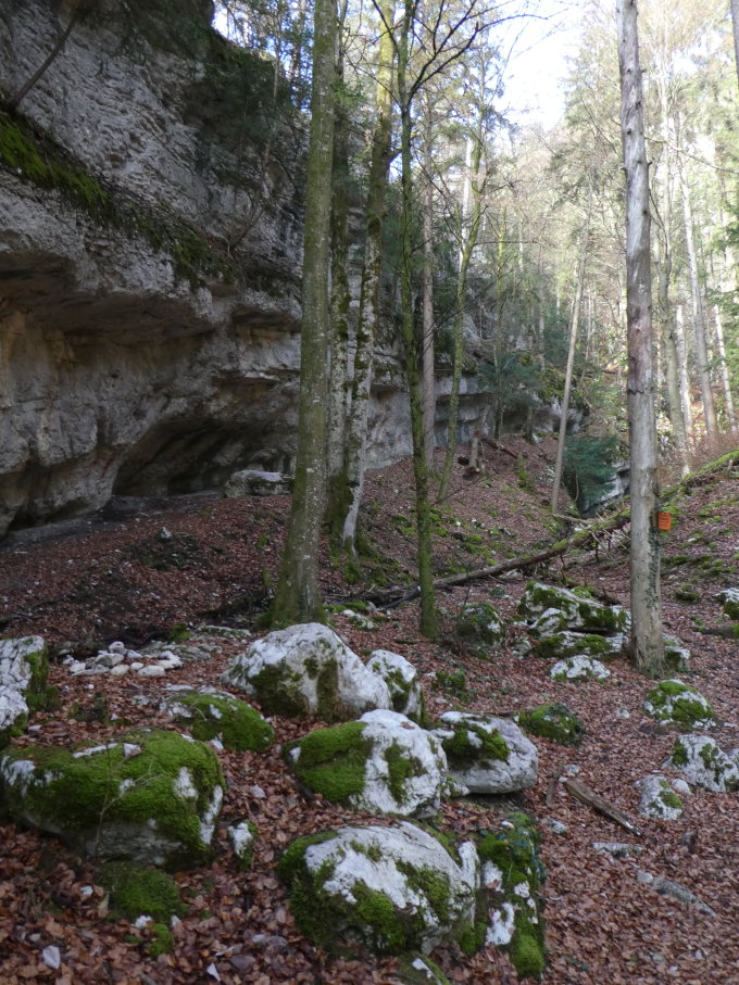 In der Nacht zuvor hat es auch im Jura wenig Regen und ab etwa 1000 Metern etwas Neuschnee gegeben. Wir haben die Route in trockenem Zustand angetroffen, feuchtes Laub und feuchte Wurzeln stellten im Aufstieg kein Problem dar, im Abstieg wären wir die Route aber nicht gelaufen. Ab dem Heereloch waren die Böden in kurzen, schattigen Tritten gefroren und mit Reif überzogen.