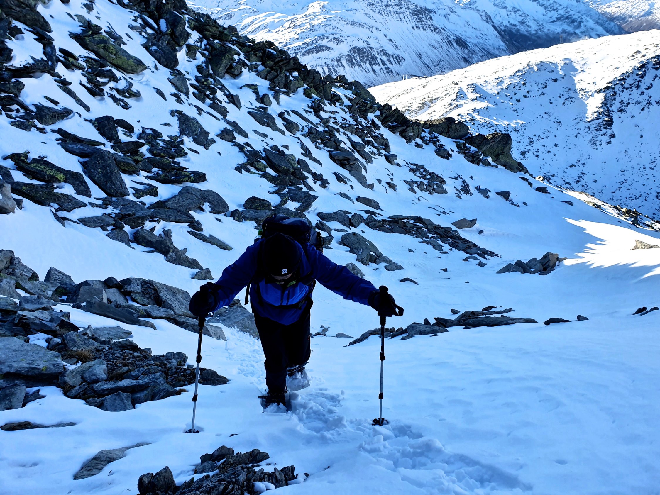 Wie an den meisten Orten, für Skitouren zu wenig Schnee. Wegen den vielen Steinblöcke ab Fellilücke, wird auch der Westhang noch kein Fahrvergnügen bieten, obwohl dort Powder vorhanden wäre….