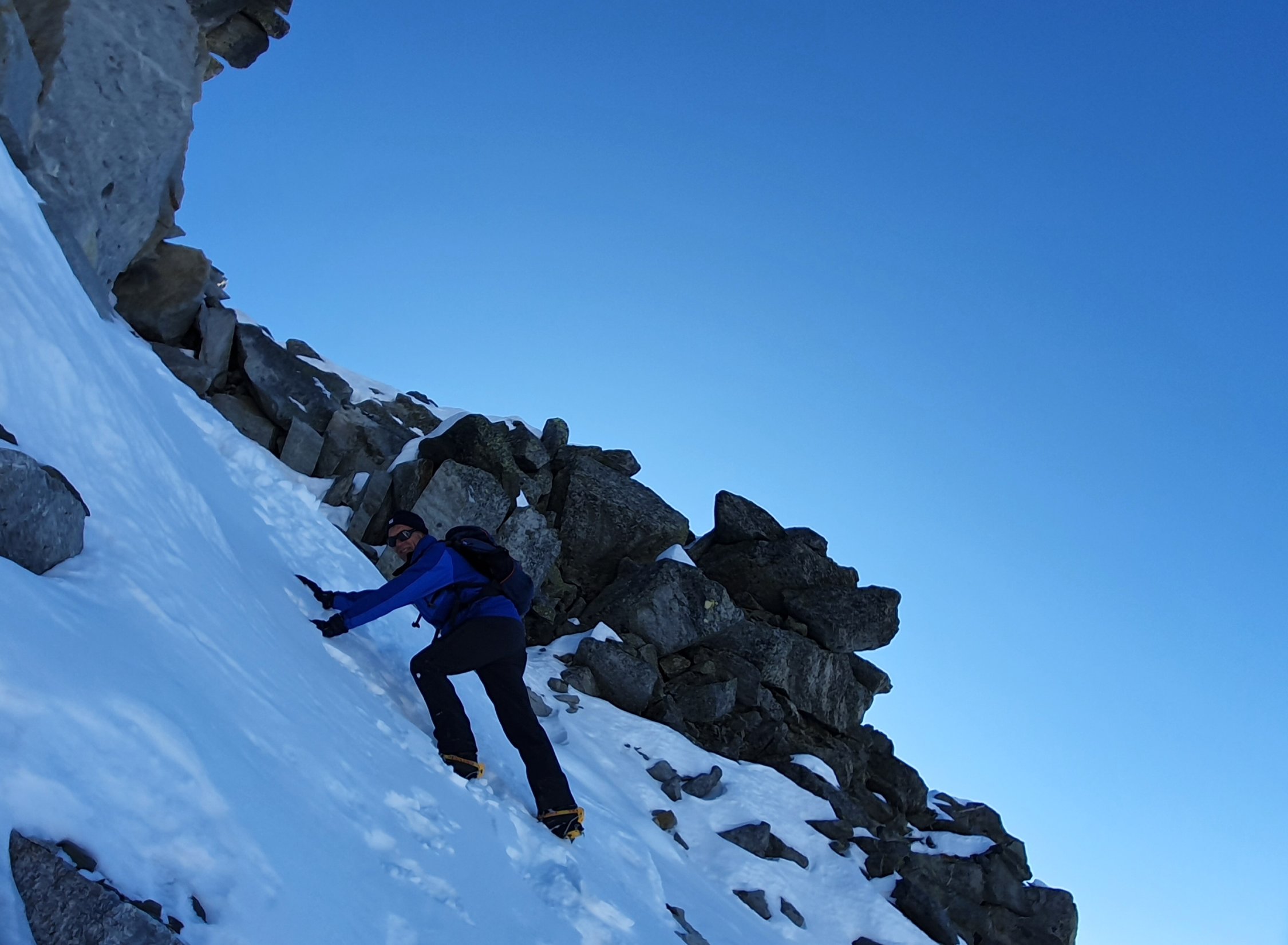 In der Wyssenlücke dann auf Steigeisen und Pickel gewechselt. Der Blockgrat kann an diversen Stellen in der Westflanke umgangen werden (derzeit sichere Lawinenverhältnisse). Der Grat selber mehrheitlich schneefrei.