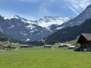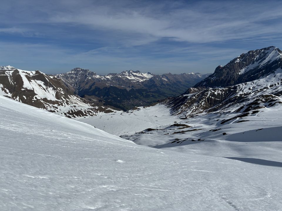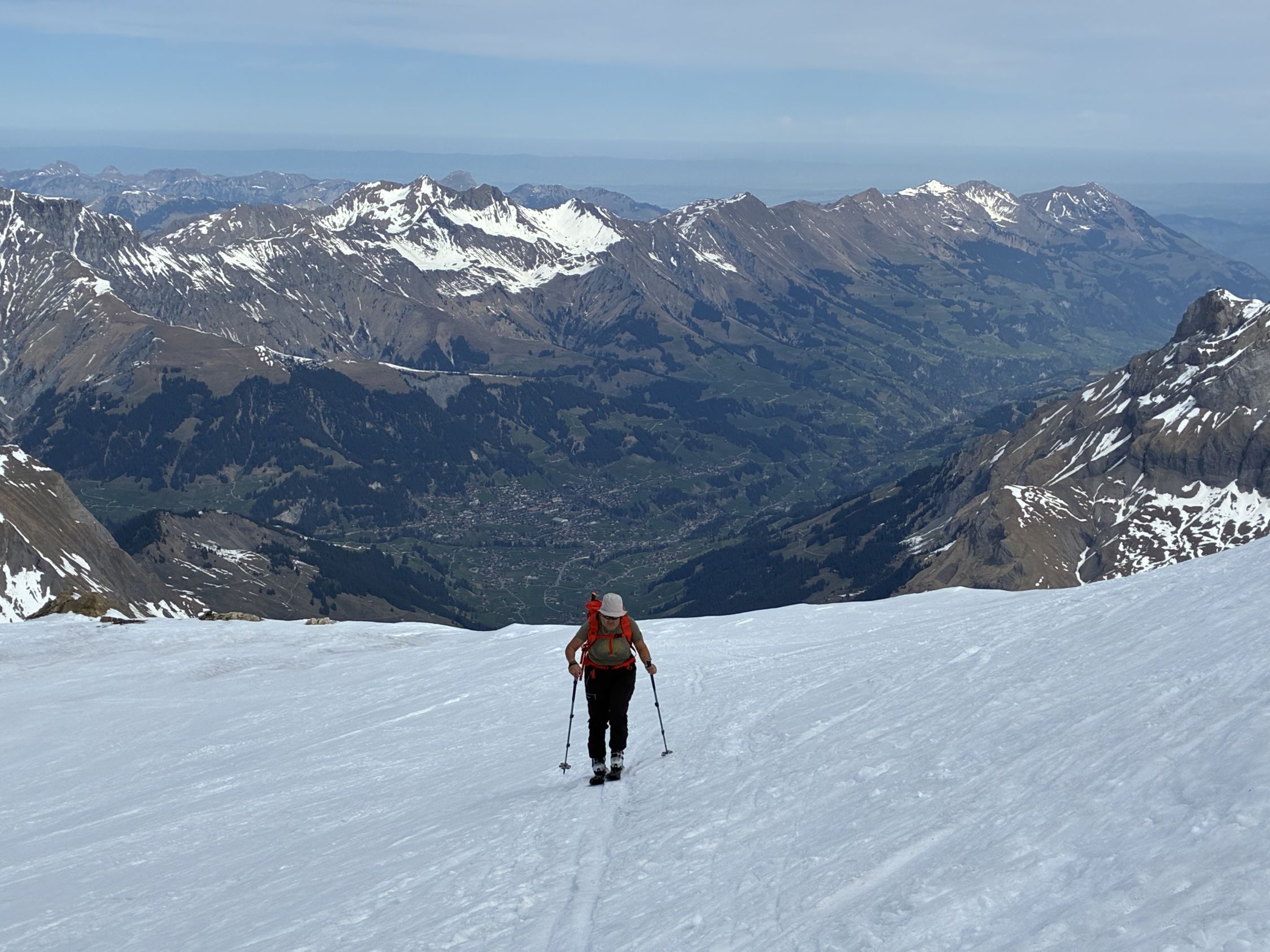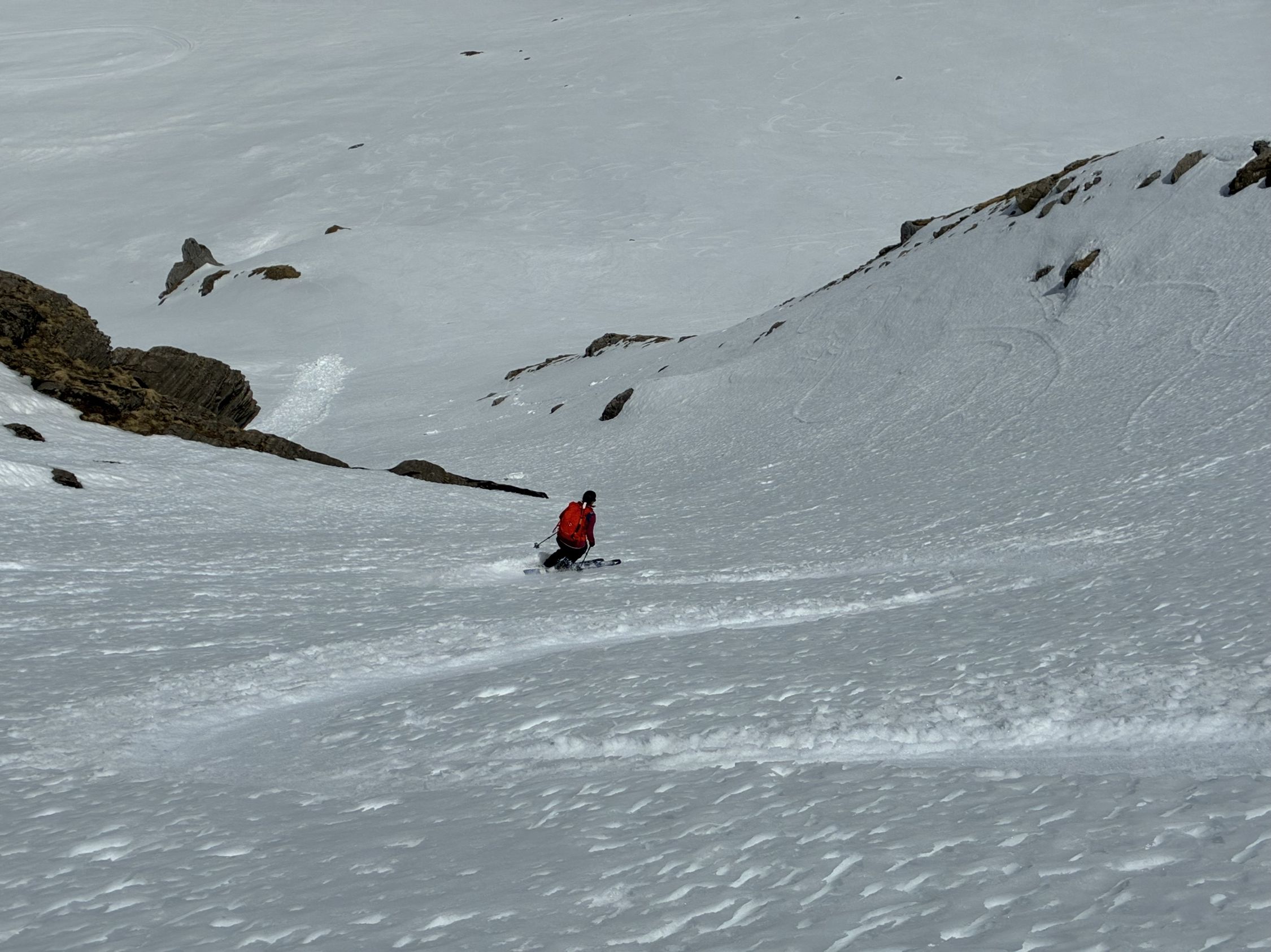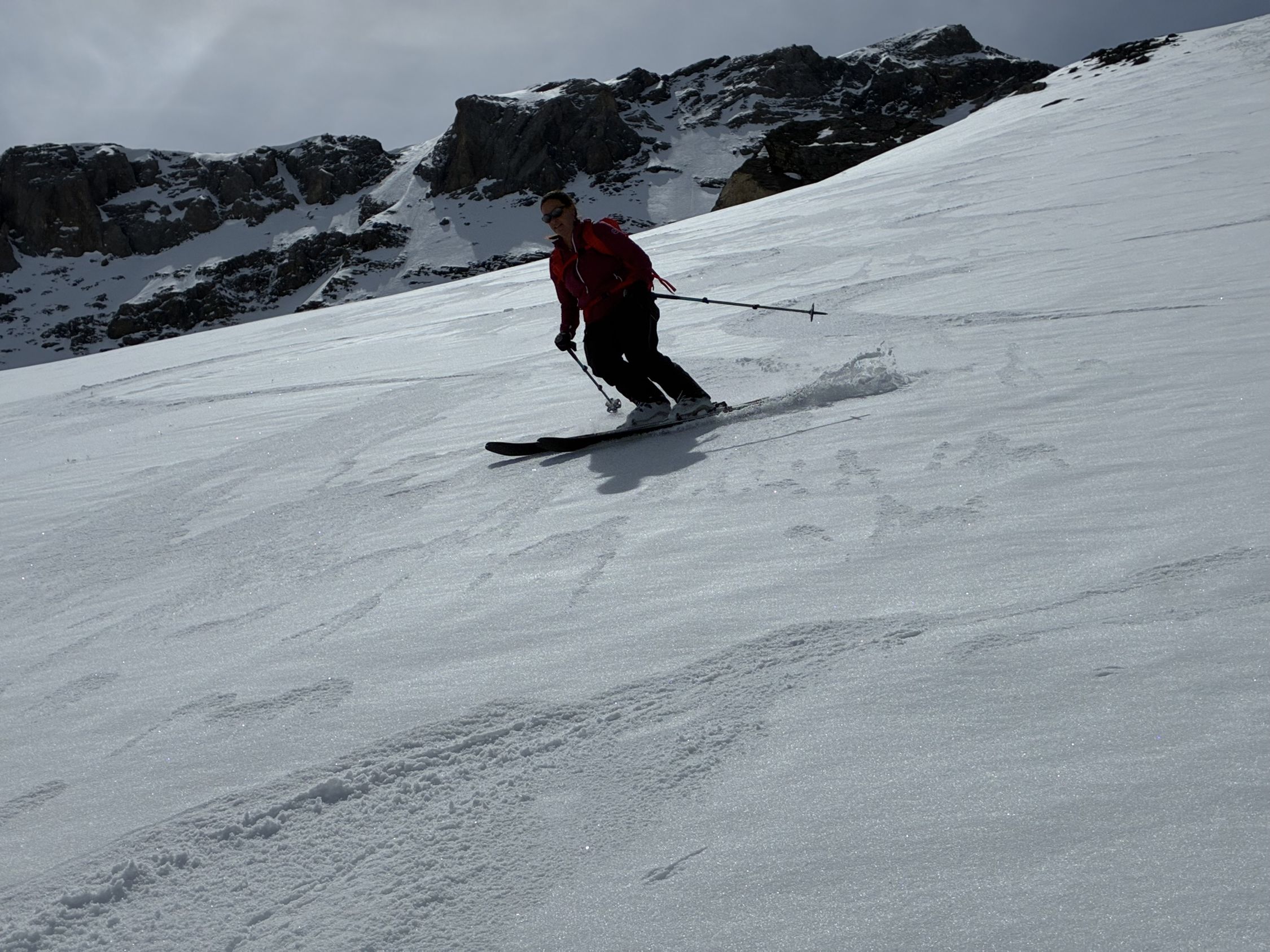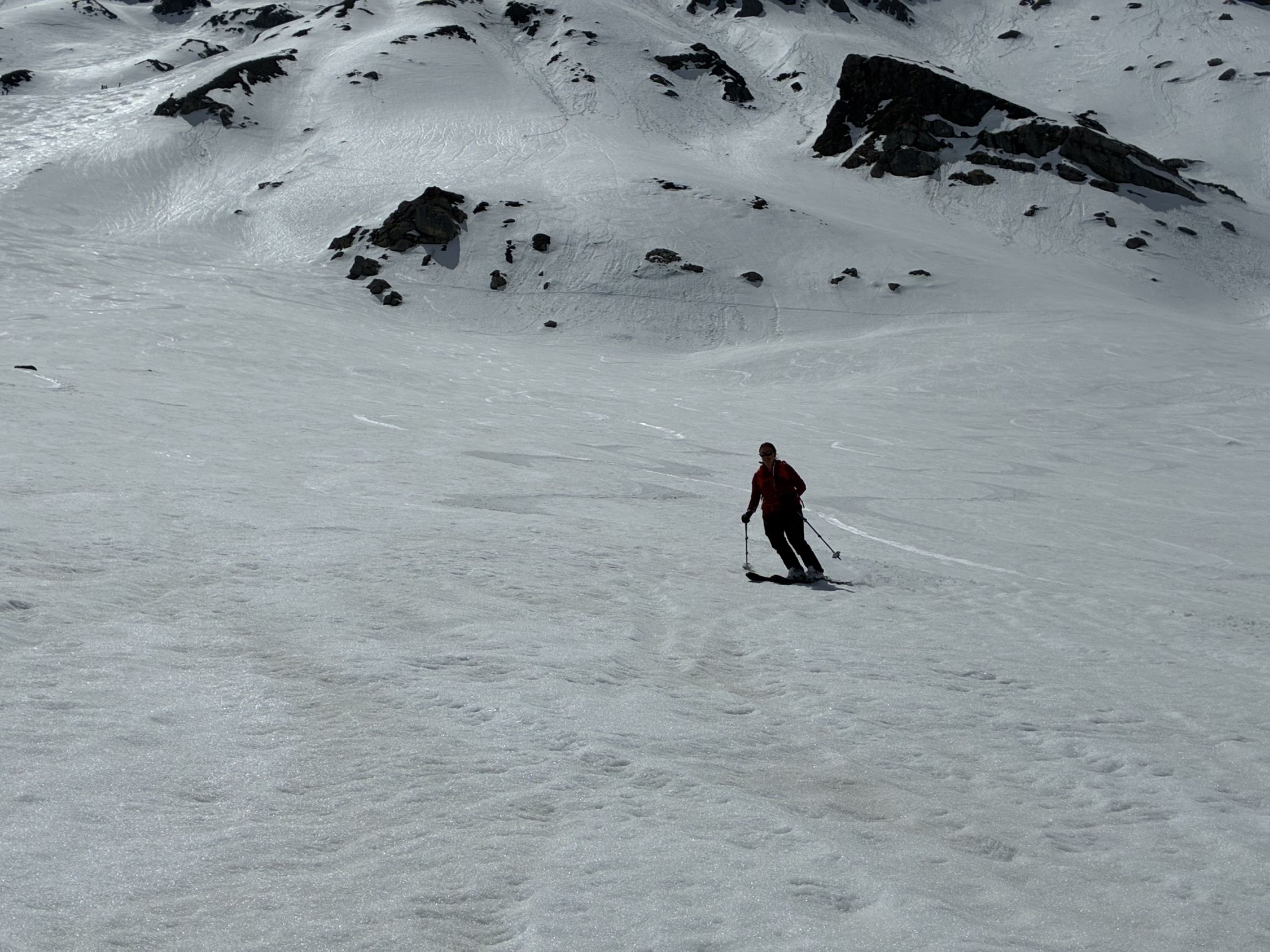 Abfahrt um 12.30 Uhr zuerst noch recht hart. Beim Frühstücksplatz auf der oberen Spur alles problemlos mit Ski an den Füssen hinunter. Dann links um den grossen Stein (P. 2752) und auf traumhaftem Sulz mehr oder wenig in der Falllinie die steilen Hänge direkt hinunter zur Engstligenalp. Besser kann es eigentlich nicht sein…