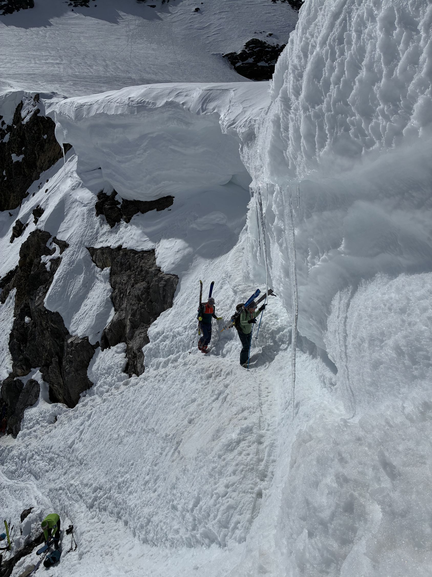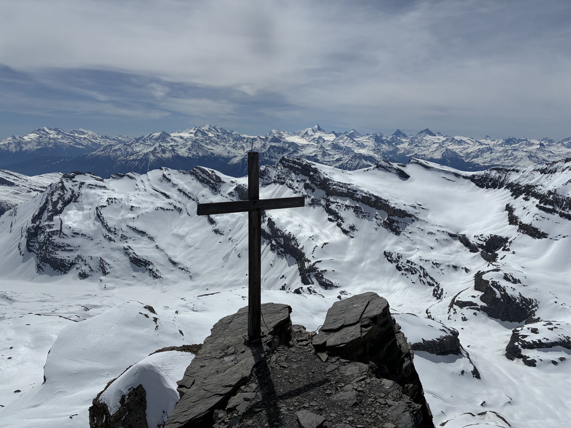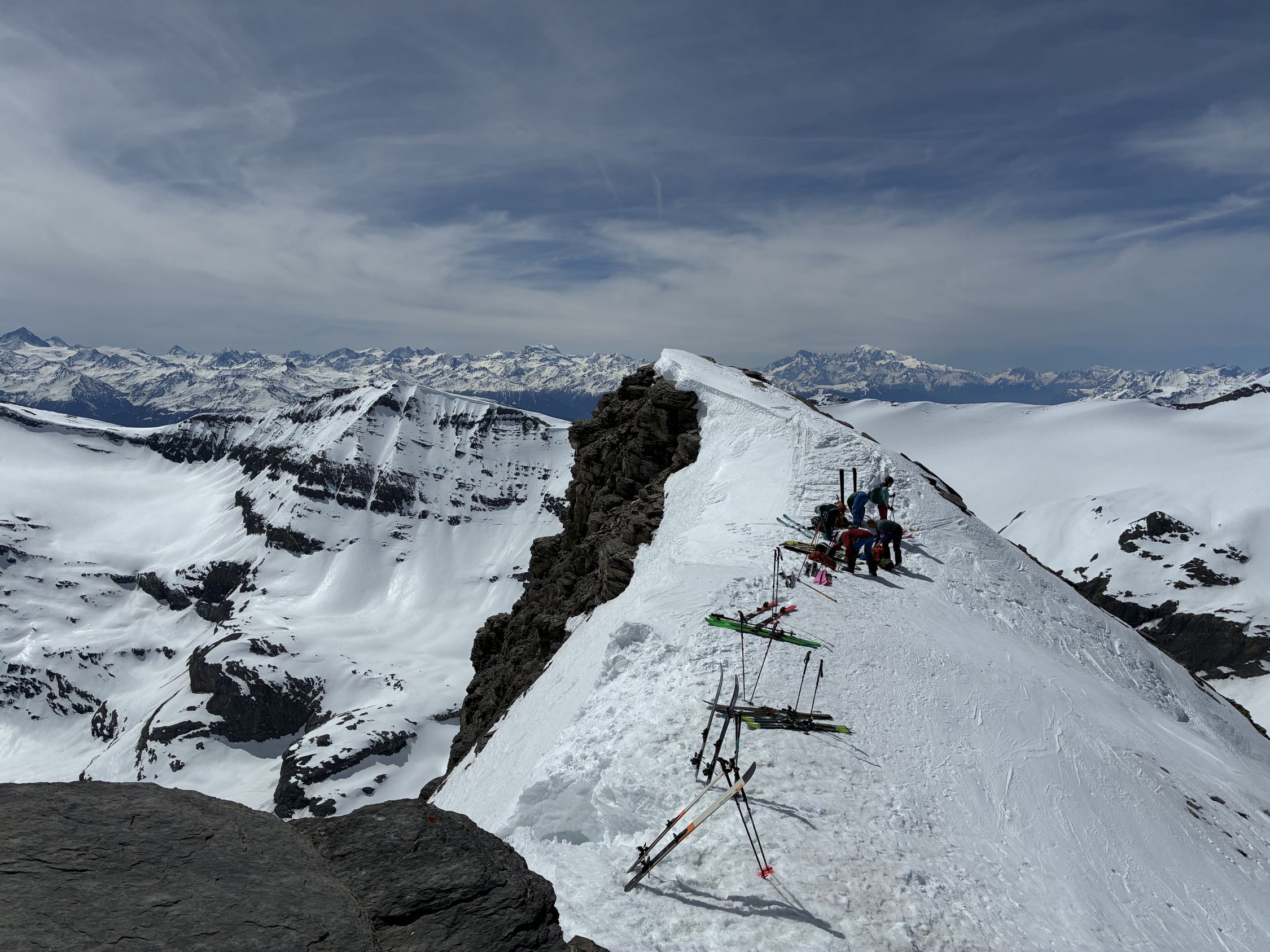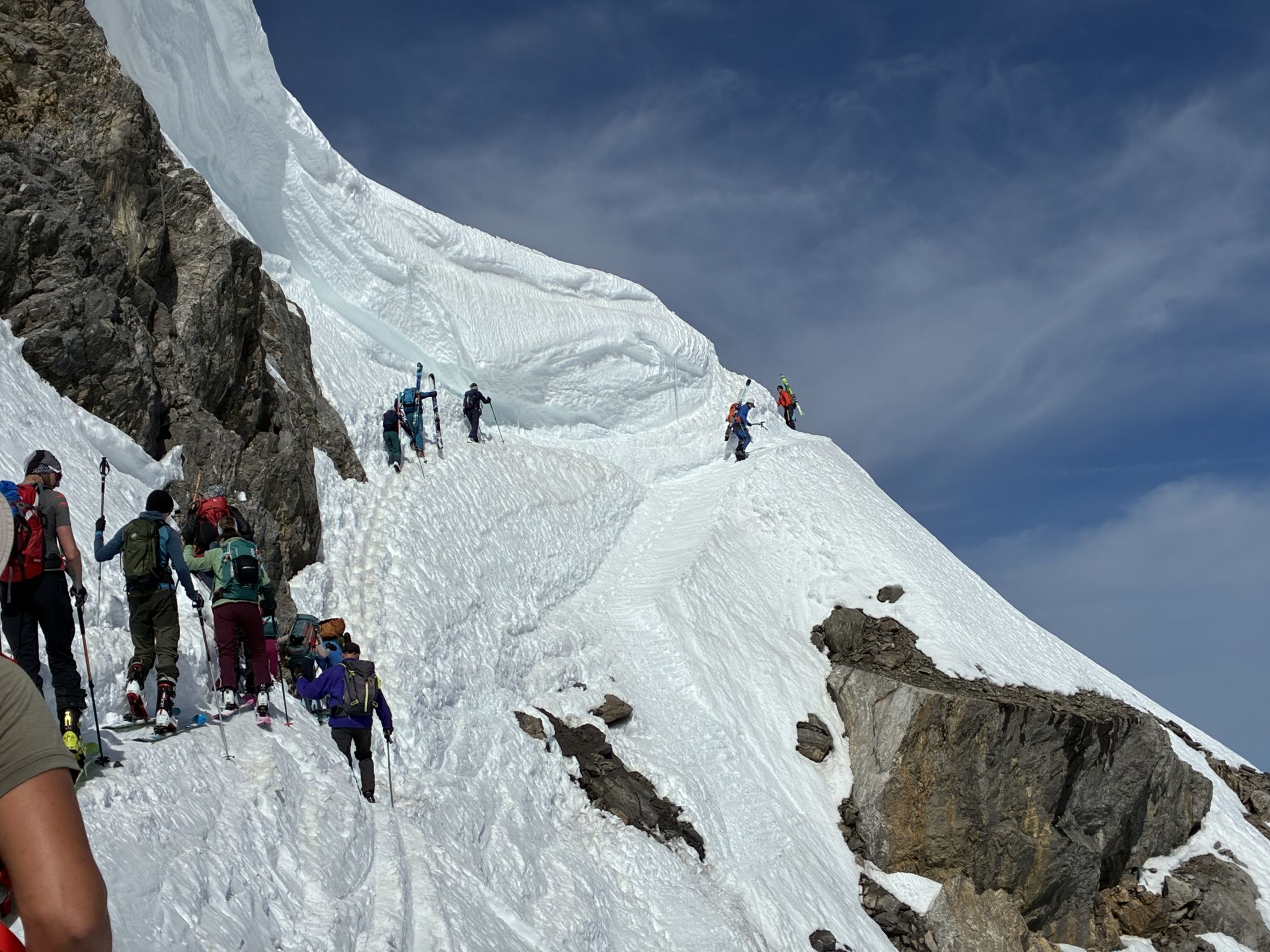 Von der Bergstation des Skilifts auf guter Spur (= ohne Harscheisen) zum Frühstücksplatz. Dort etwas Stau und ein paar Minuten Wartezeit. Zu Fuss in guten Tritten mit aufgebundenen Skiern hoch. Oberhalb des Frühstücksplatzes mit Harscheisen Richtung Gipfel.