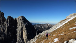 Blick in die Runde: Griesner Kar ganz schön weiß, für Skier langts natürlich nicht. Beschneiungsanlagen laufen bereits. Ansonsten, wie nicht anders zu erwarten, nordseitig Schnee und kalt, südseitig mollig warm und wenig Schnee. Wenig los im Gebiet.