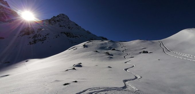 Start bei der Wägerhütte um 6.30 Uhr. Bis auf 2450 müM kaum Schnee, nun den Altschneefeldern folgend zum Grat. Bei den Jöriseeen Pulverschnee auf harter Unterlage und zum Gipfel mit Steigeisen gespurt.