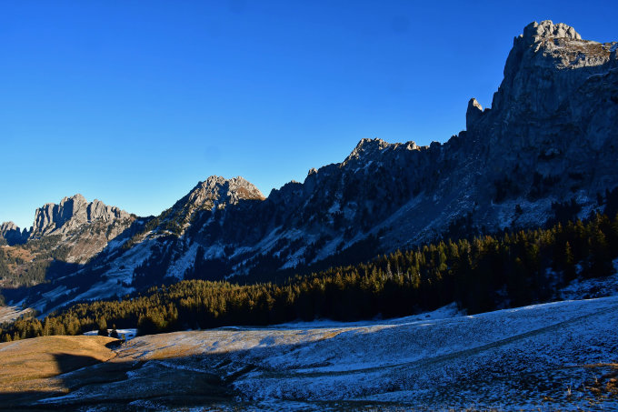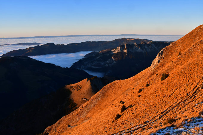 Die Stimmung einfach magisch. Leider geht es schnell vorbei aber unsere schönen Bergen zeigen immer wieder interessante Farbenstimmungen. Das ich dafür den Weg zurück nach Gros Mont mit Laternenlicht suchen musste, war es aber mehr als wert. Im dunkeln war der Weg runter teilweise kaum zu finden, aber glücklicherweise war das Terrain relativ einfach.