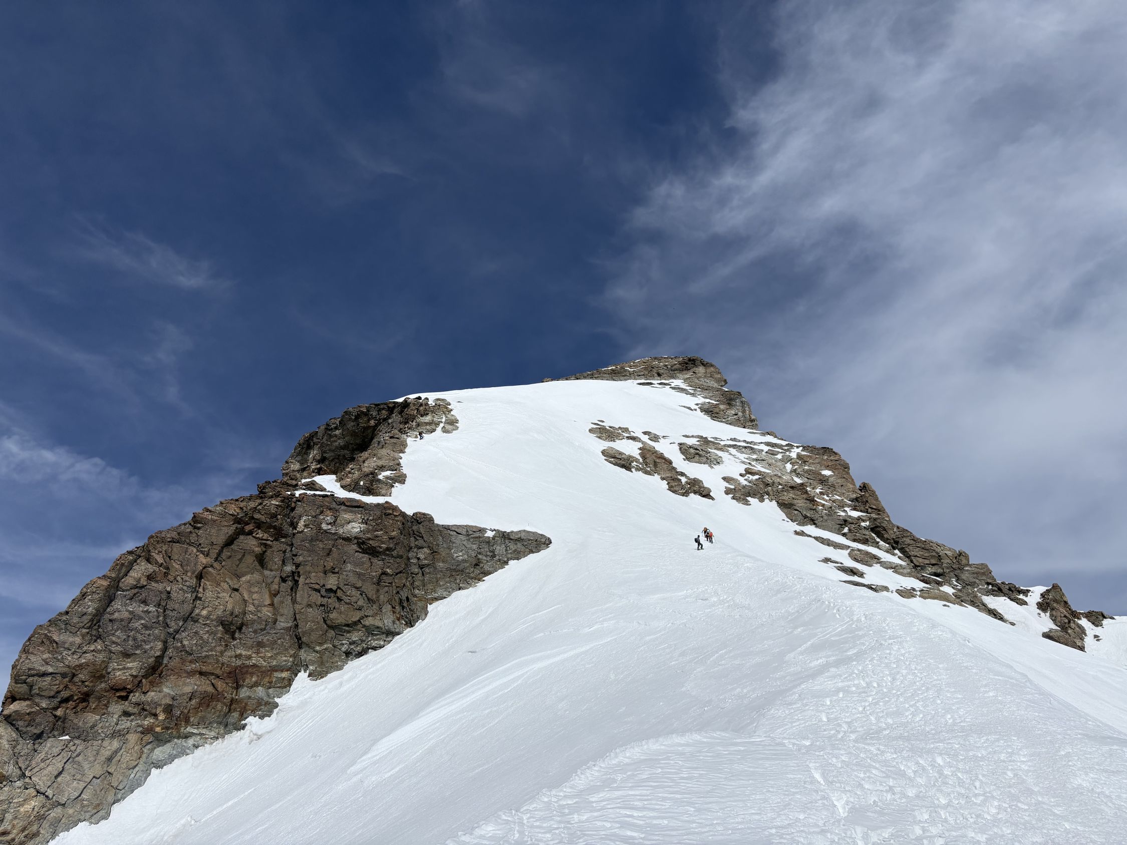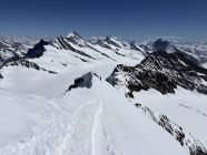 Beim südseitigen Aufstieg zu Punkt 3507 fehlt es an Schnee (auch der Gletscher ist m.E. nicht so gut eingeschneit). Praktisch alle sind mit Steigeisen aufgestiegen, abgefahren ist dort niemand. Ein kurzes Stück muss man heikel durch Felsen traversieren. Als ich vor 6 oder 7 Jahren dort aufstieg, konnte man praktisch alles problemlos mit Ski machen.