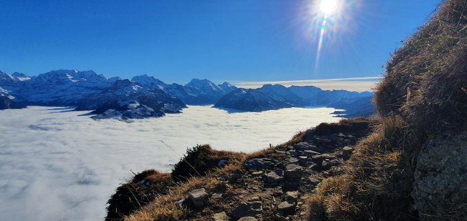 Bis Schwandegg im Nebel, Weg leicht matschig aber gut zu gehen. Ab Schwandegg über den Wolken und alles trocken durch Sonneneinwirkung. Letzter Tag Niesenbahnsaison, dementsprechend viele Leute am Gipfel.