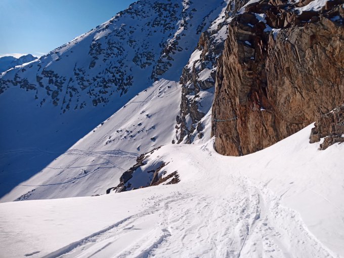 Erstaunlich gute Verhältnisse, Rückweg unterhalb Corvatsch, dann Abfahrt über die Piste nach Surlej.