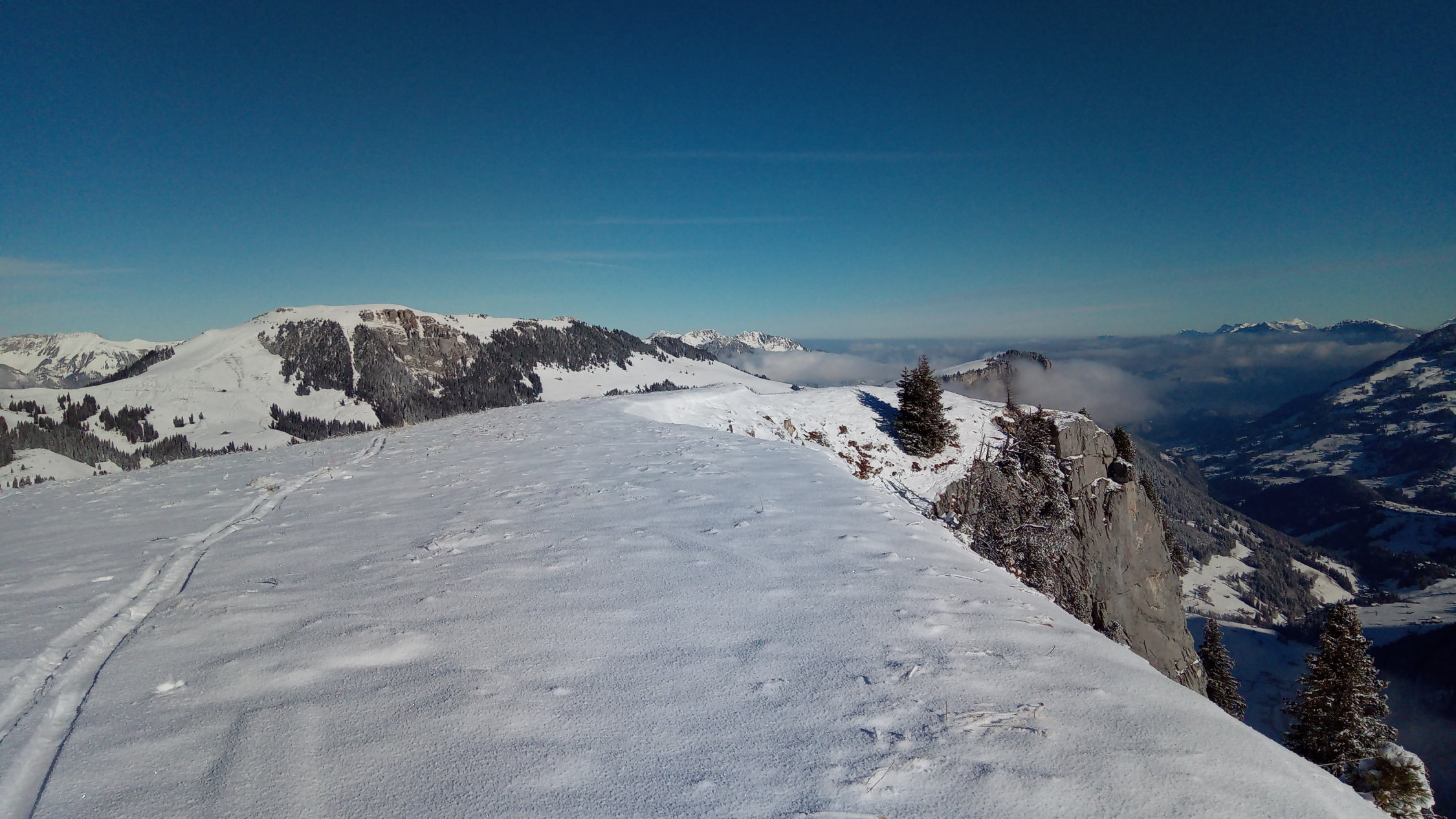 Also ich bin mit den Skis bis zum Gipfel. Soweit sogut. Zur "Abfahrt": Den Gipfelhang runter ganz ok. Im Wald habe ich dann kurz getragen. Zuviele Steine, Büsche, Stämme und Äste. Der grosse Hang dann bis zur Sennhütte und bis Gründlisgraben auch ganz ok. Kuurz vor der Hütte P.1436 dann wieder kurz getragen, kratz kratz... Der Hang zum Parkplatz habe ich auf, resp. knapp neben der Strase umfahren. Schneeauflage war grenzwertig.