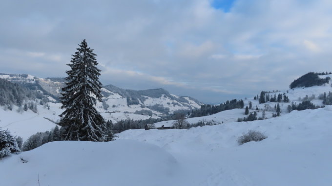 Beim Start in Libingen noch bewölkt mit Tendenz zu Auflockerungen. Temperatur knapp im Minusbereich. Nach Jonenholz war der Alpweg schneebedeckt. Die Schneedecke reichte bis max. 15 cm, in verwehten Bereichen am Kamm stellenweise 30-40 cm. Ab der Chrüzegg riss die Bewölkung auf. Eine Märchenlandschaft unter strahlend blauem Himmel. Im Kammbereich teils kalter Wind.