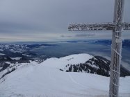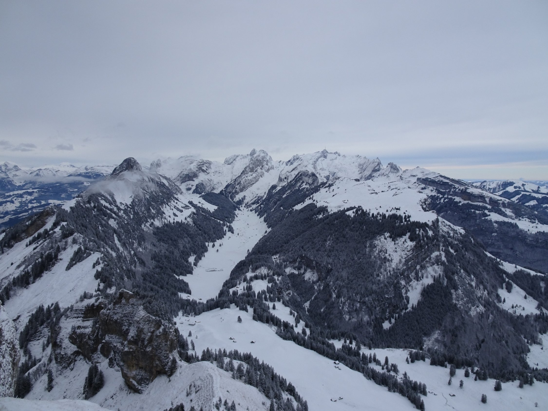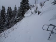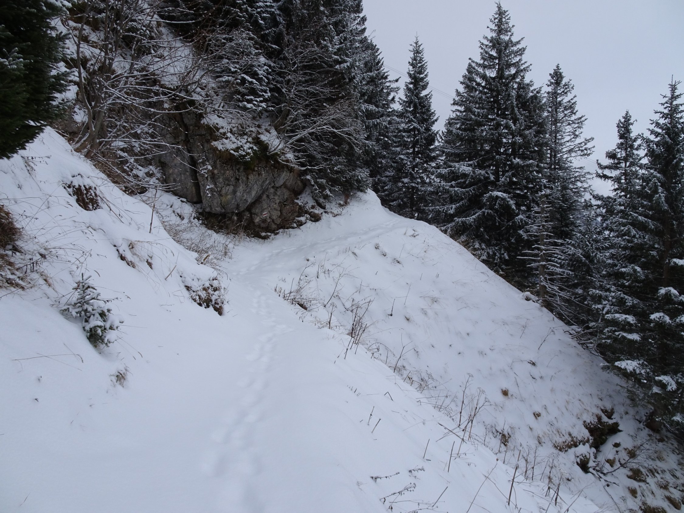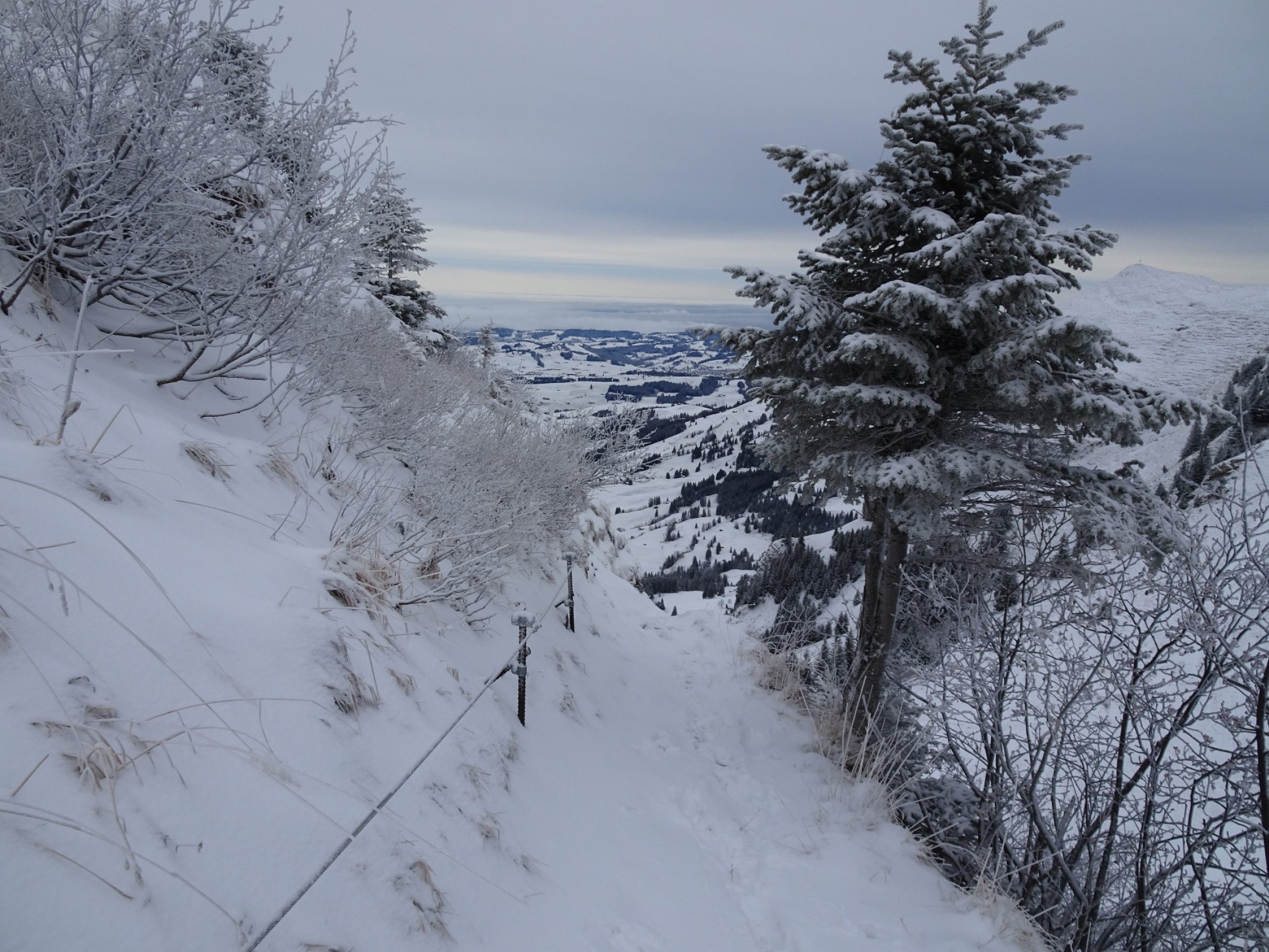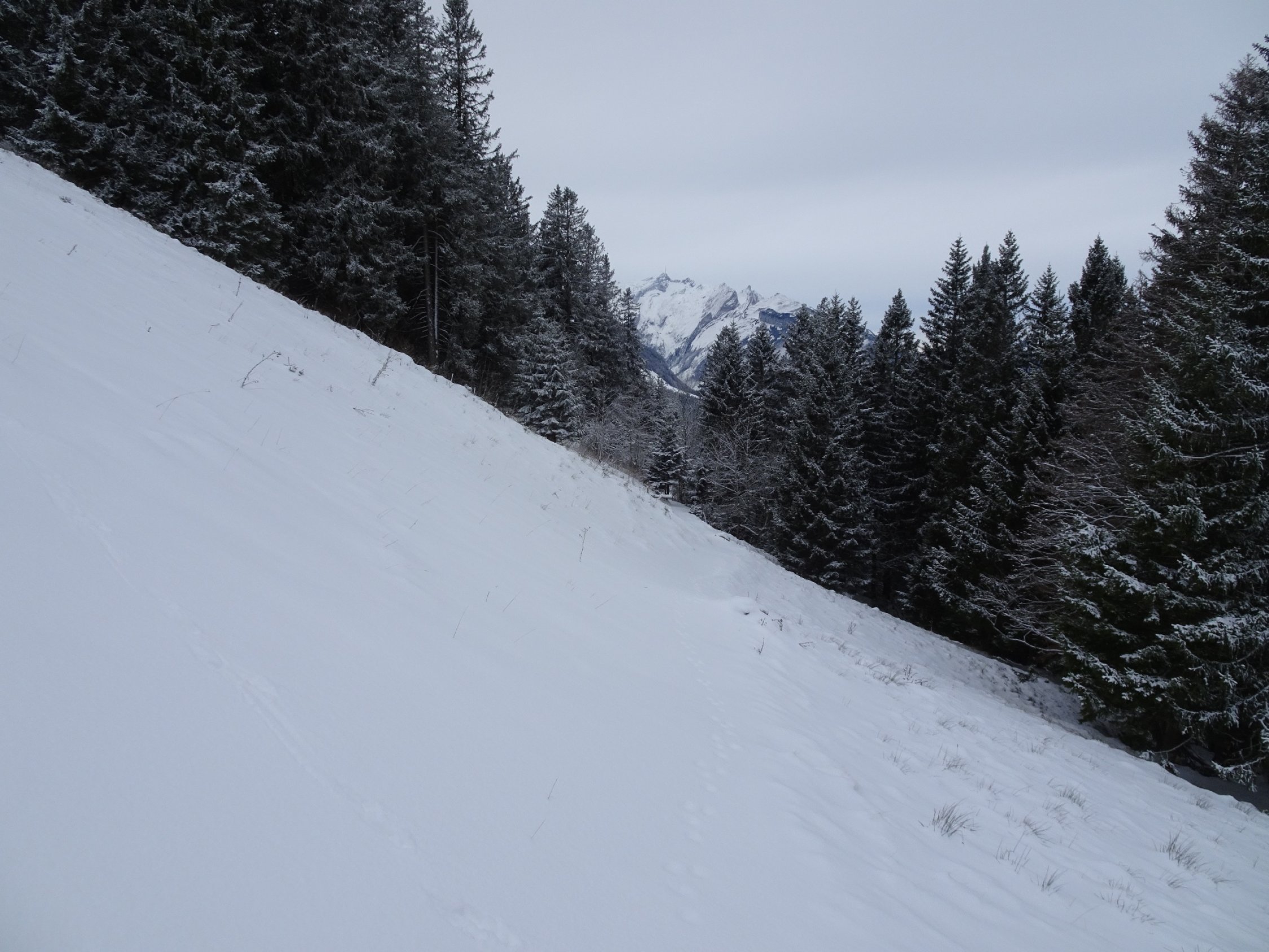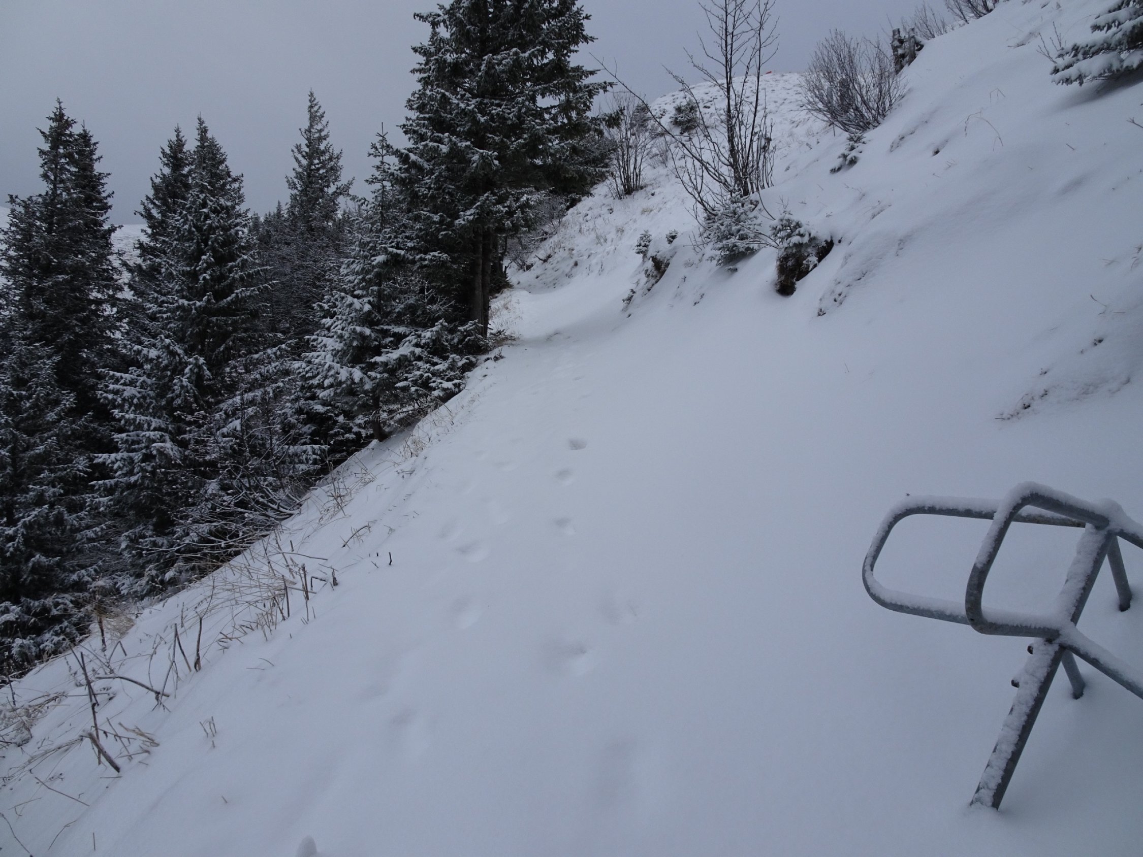 Bis zum Ruhesitz nur etwas Pulverschnee auf gefrorenem Untergrund. Weiterweg meist Neuschnee auf gespurter Unterlage. Am Kamorgrat wenig Neuschnee ohne Unterlage. Abstieg vom Kamor bis kurz vor der Waldschneise meist Pulver auf gefrorenem Untergrund oder Pulver auf verdeckter Eisunterlage. Am meisten Schnee kurz vor der Waldschneise und bis etwa hinunter zur Alp Fulen vorgefunden.