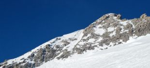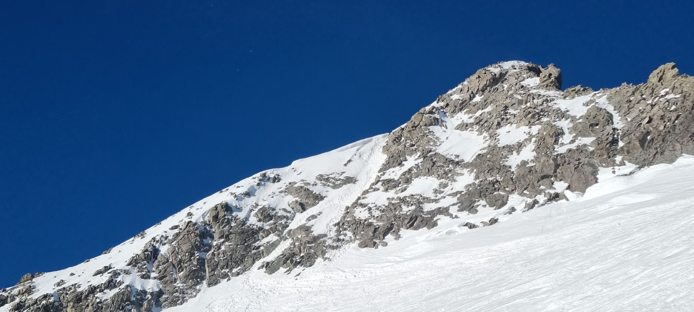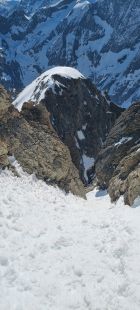 Insgesamt sehr gute Verhältnisse auf dem Gipfelaufstieg - wir sind den direkten Winteraufstieg im guten Trittschnee hochgegangen und den Normalweg über den Grat und das versteckte Couloir runter.