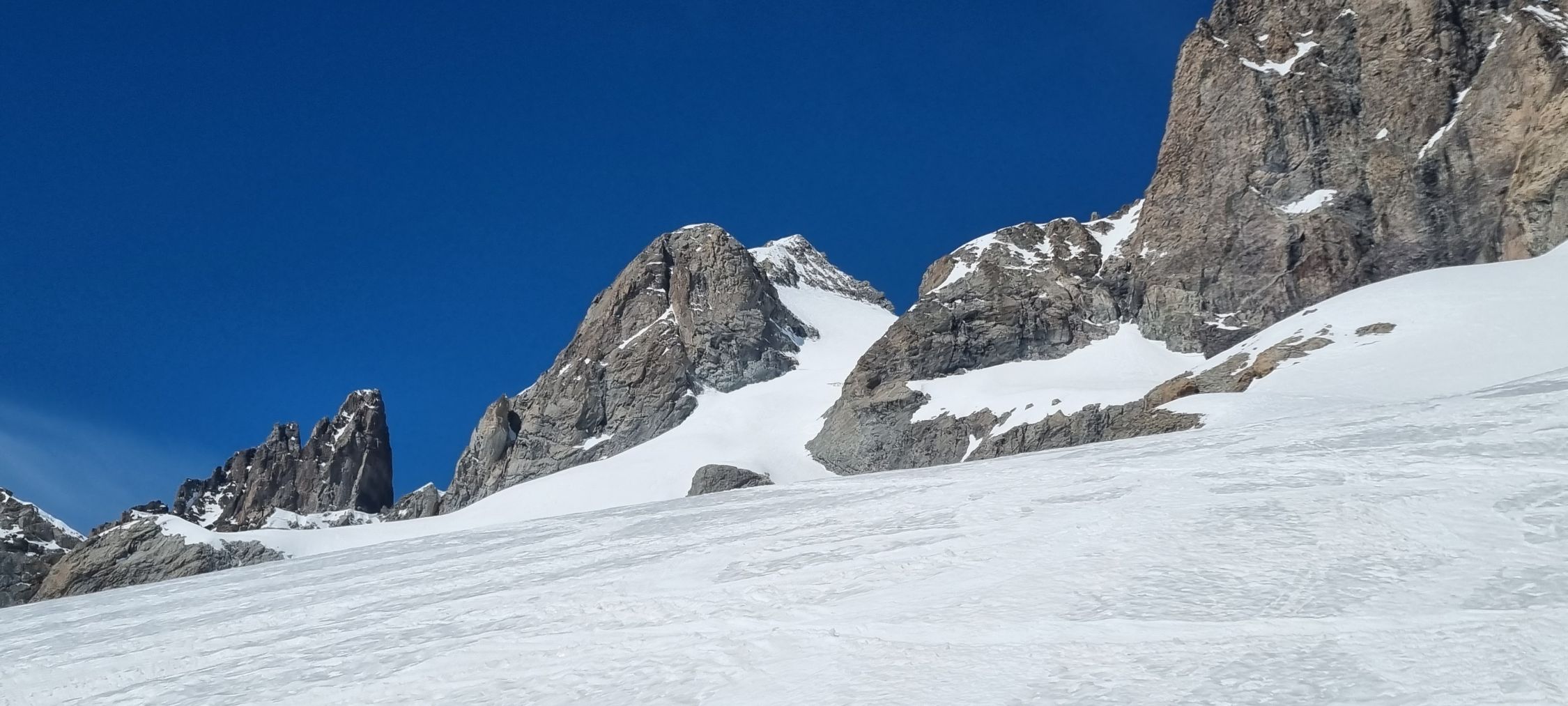Gipfelaufstieg bleibt noch länger gut, evtl. apert der Winteraufstieg aus. Der Übergang Col de la Casse Déserte wird im Mittelteil noch trockener bzw eisig werden. Die Abfahrt am linken Ufer der Séracszone wird noch heikler, wenn eisig bzw wenn sich der Spalt weiter öffnet. Der Übergang Col de la Grande Ruine wird im Aufstieg unangenehmer wenn aper, ist aber an sich nicht steil. Die Abfahrt zum Refuge du Pavé bleibt noch länger gut. Der Abstieg in der Séraczone vom Col du Pavé zur Promontoire wird bei Ausaperung heikler.