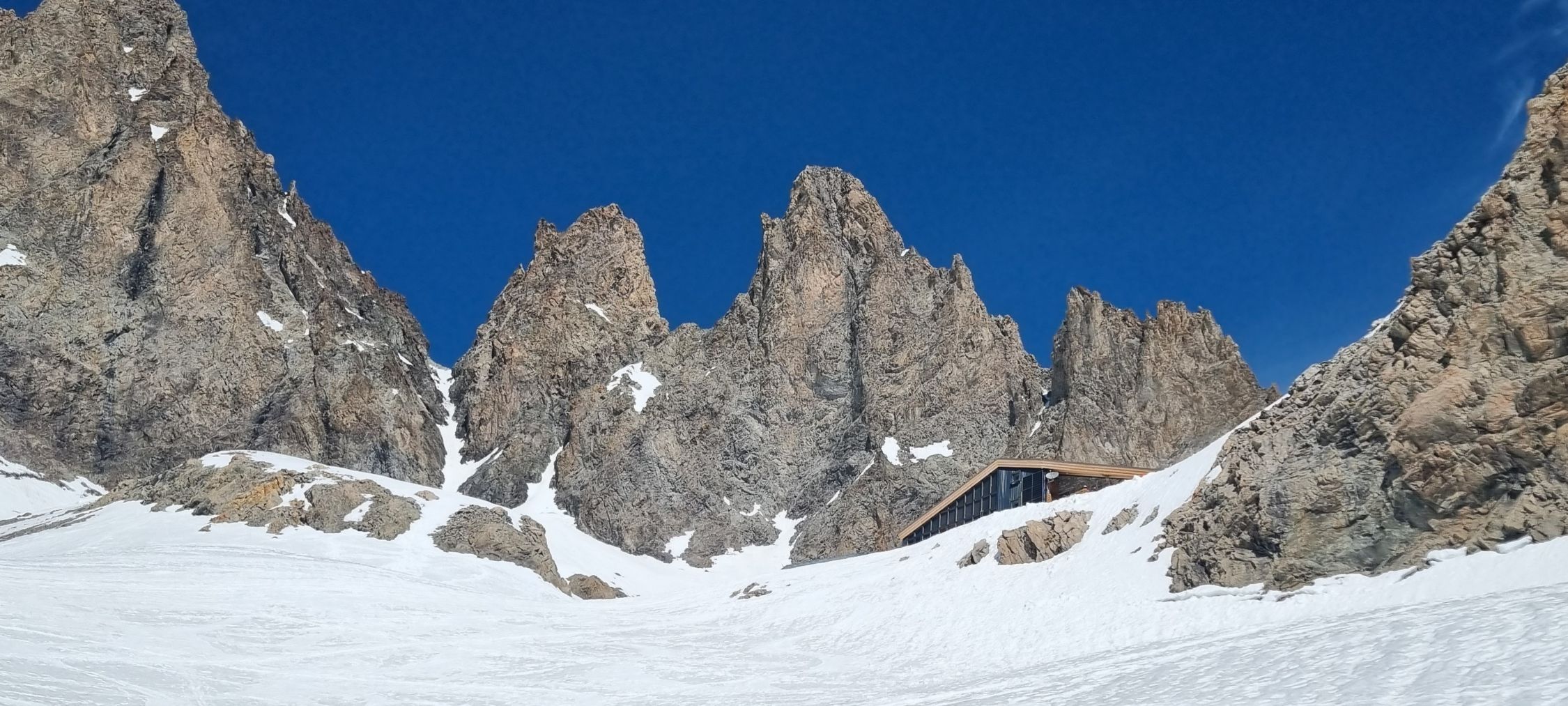 Wir sind dann nicht der üblichen Durchquerung zur Promontoire gefolgt, sondern sind an der nächsten Rippe gleich rechts gequert und wieder hoch zum Col de la Grande Ruine, zuerst mit Ski, dann zu Fuß leicht ohne Steigeisen, auf der anderen Seite gute Abfahrt, dann querend zum Refuge du Pavé abgefahren (die alte Blechbarracke wurde durch ein neues interessantes Bauwerk ersetzt).