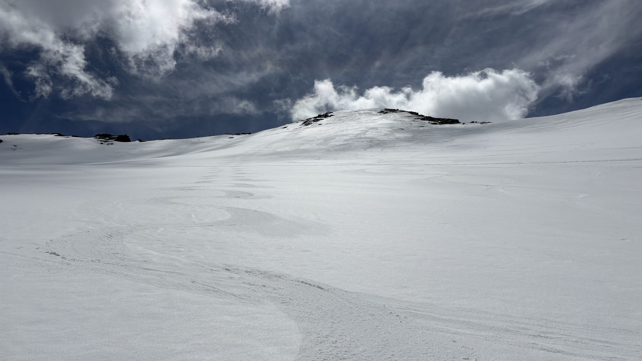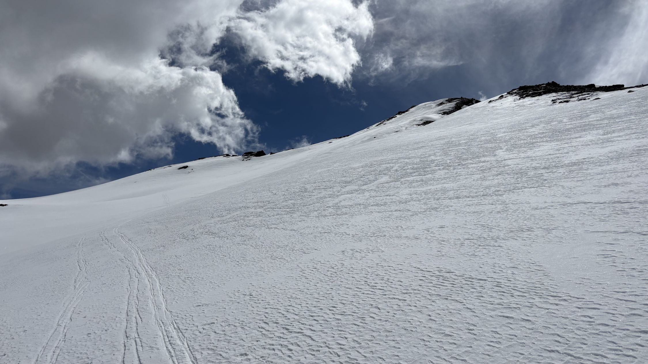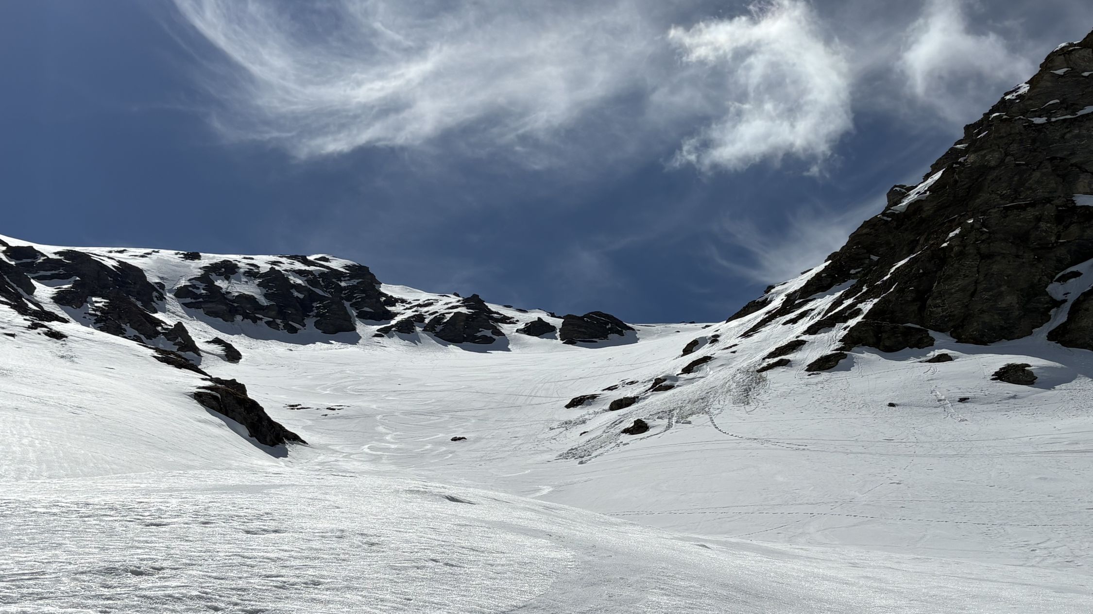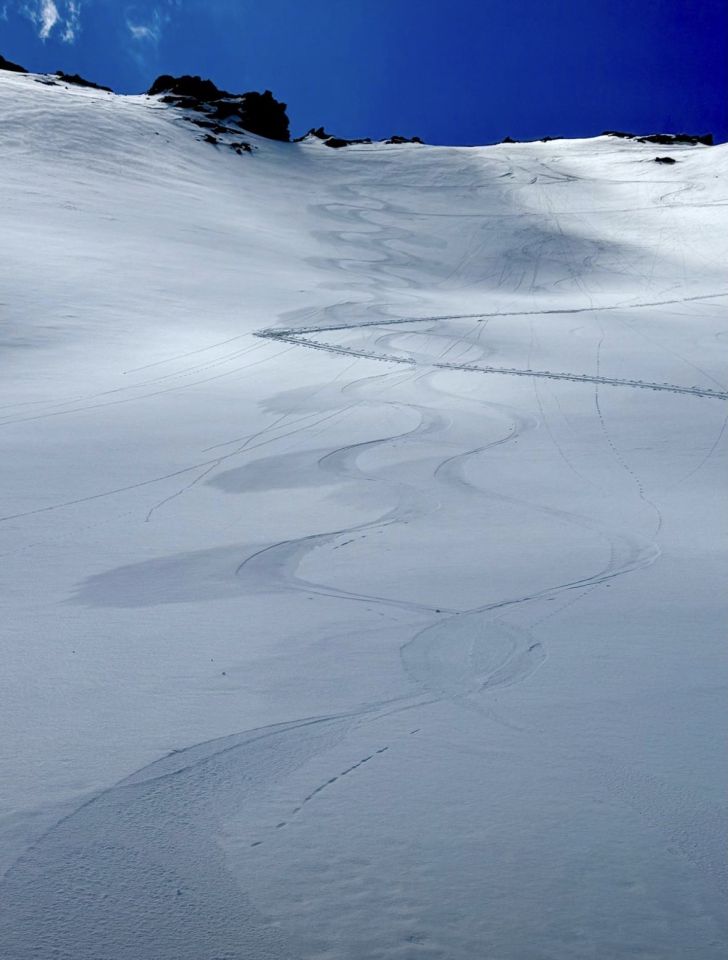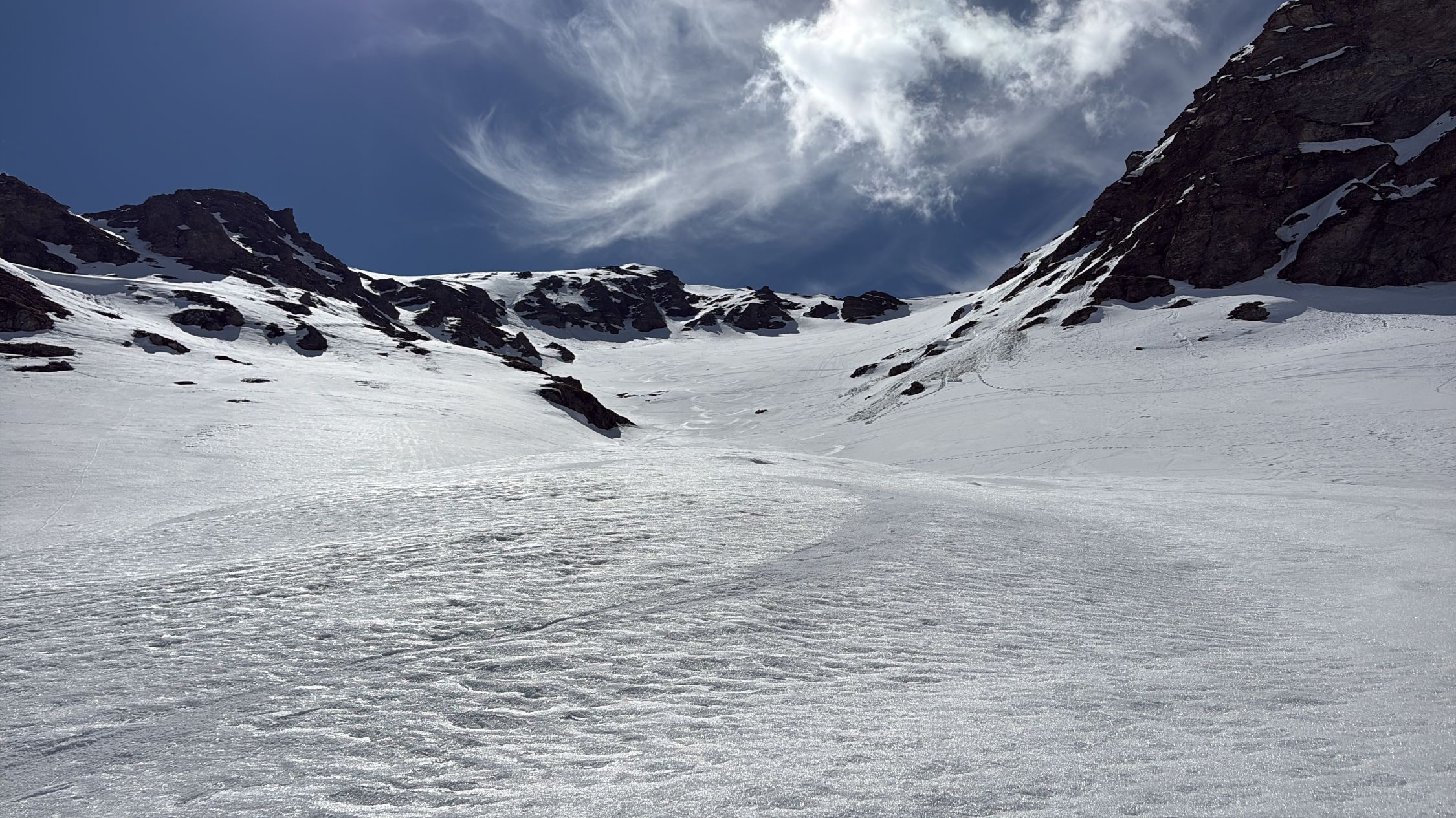Die ersten 200 Hm waren wie erwähnt guter Knusperpulver, danach rasch auf die W-Seite gewechselt und 10 Schwünge in Sahne-Sulz, und wieder in die N-Seite hinein. Das Flaschenhals-Couloir zeigte sich von der besten Seite: Schön aufgesulzt, griffig, rauschend, die schönsten 300 Höhenmeter folgten.