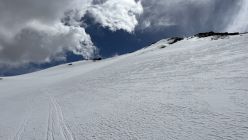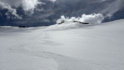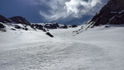 In 15 Minuten hatte ich das Flaschenhals-Couloir gemeistert und nun folgte eine lange aber stetig steigende Querung unter den Gipfel, wobei der Schnee immer knuspriger wurde.
