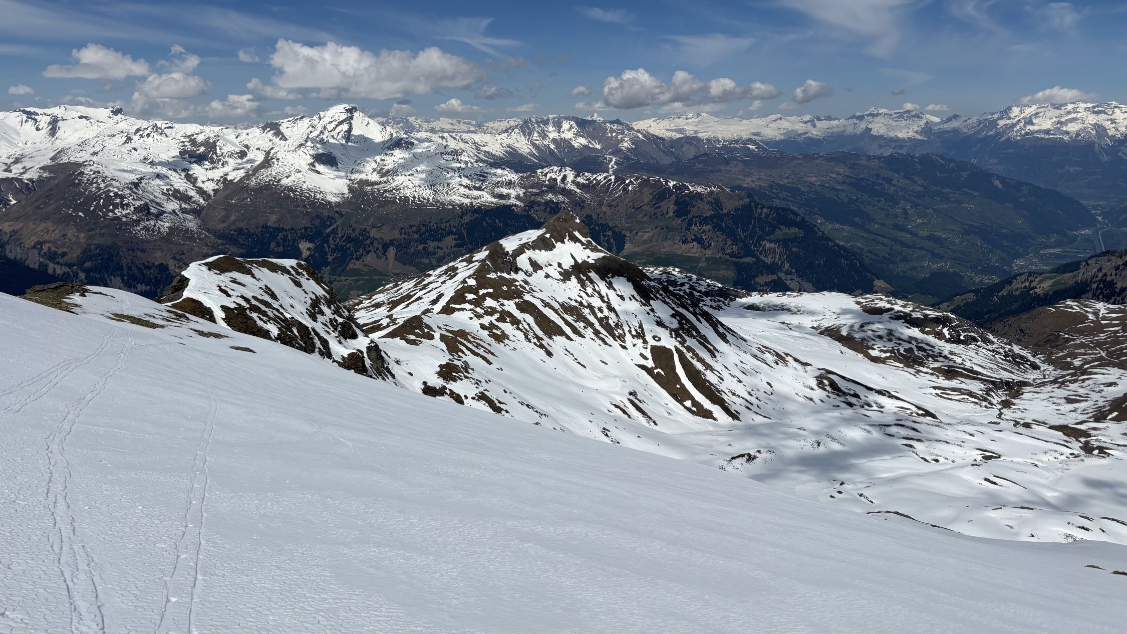 Immer in meinem Blickfeld, die N-Flanke des Piz Curvers. Wann sind die Bedingungen für Bike‘n Ski am besten?