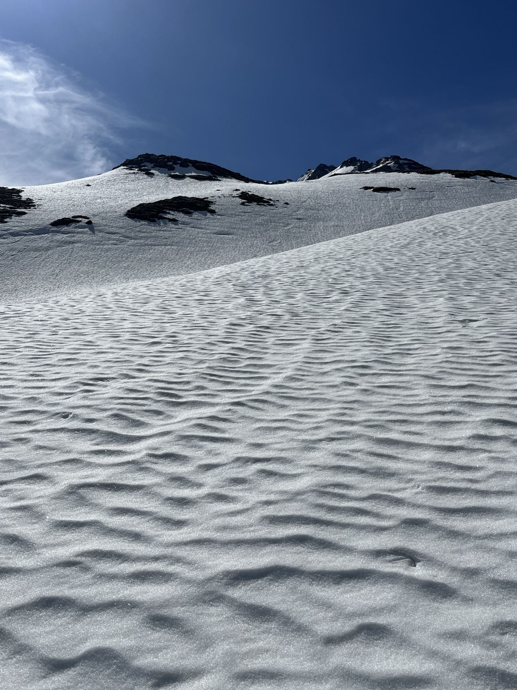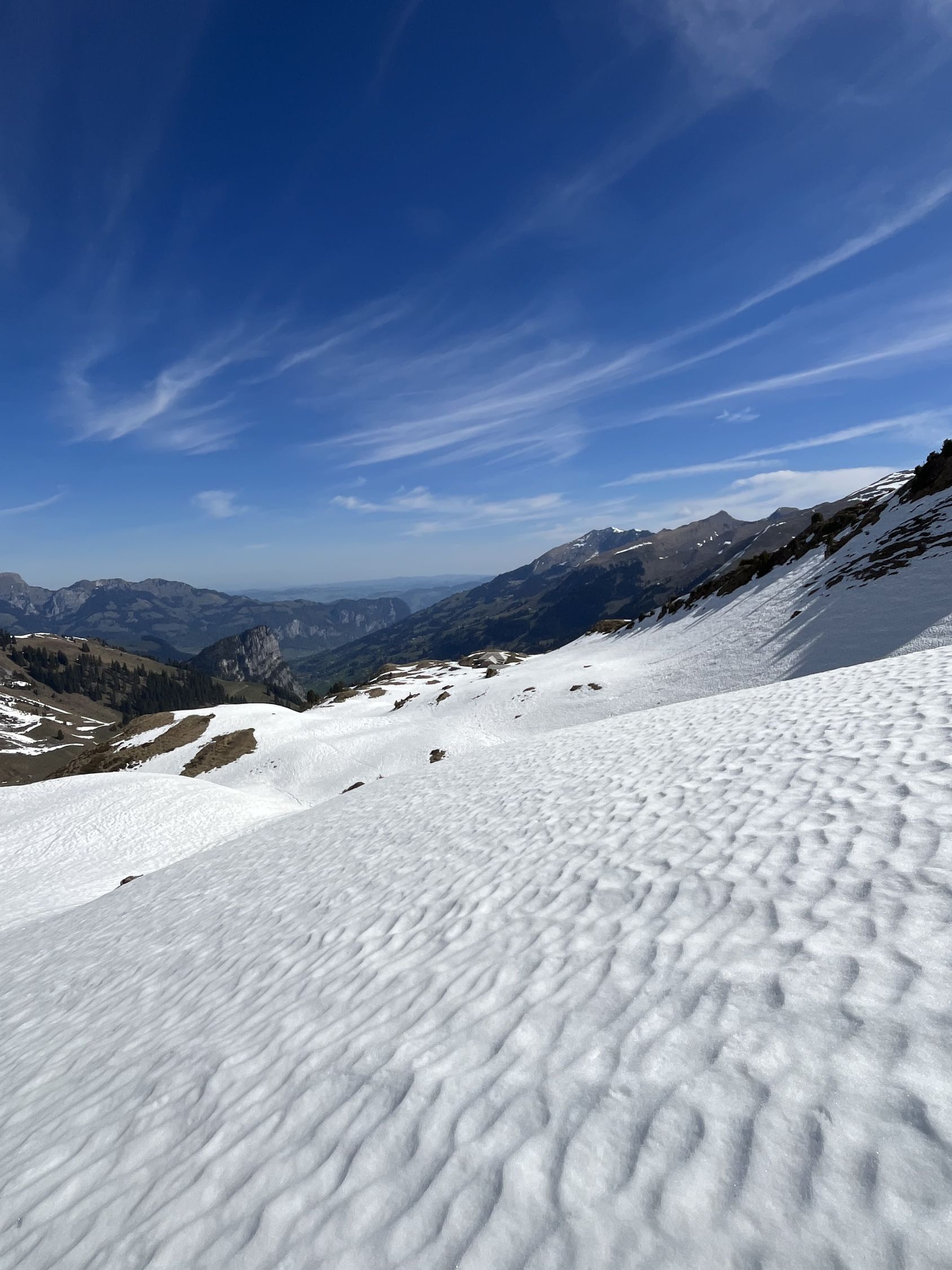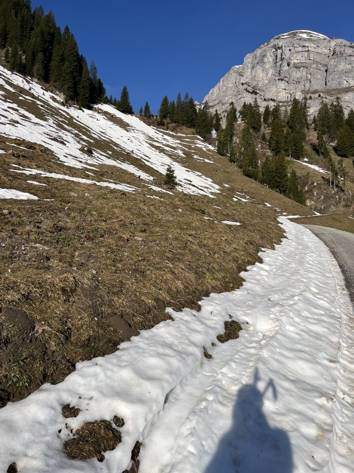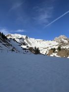 Von dort Direktaufstieg auf den Grat nächst Cheibehorn. Schöner Sulzschnee bis etwas unterhalb Alp Bütschi. Dannach Nasschnee und zu wenig Schnee bis zum Auto.