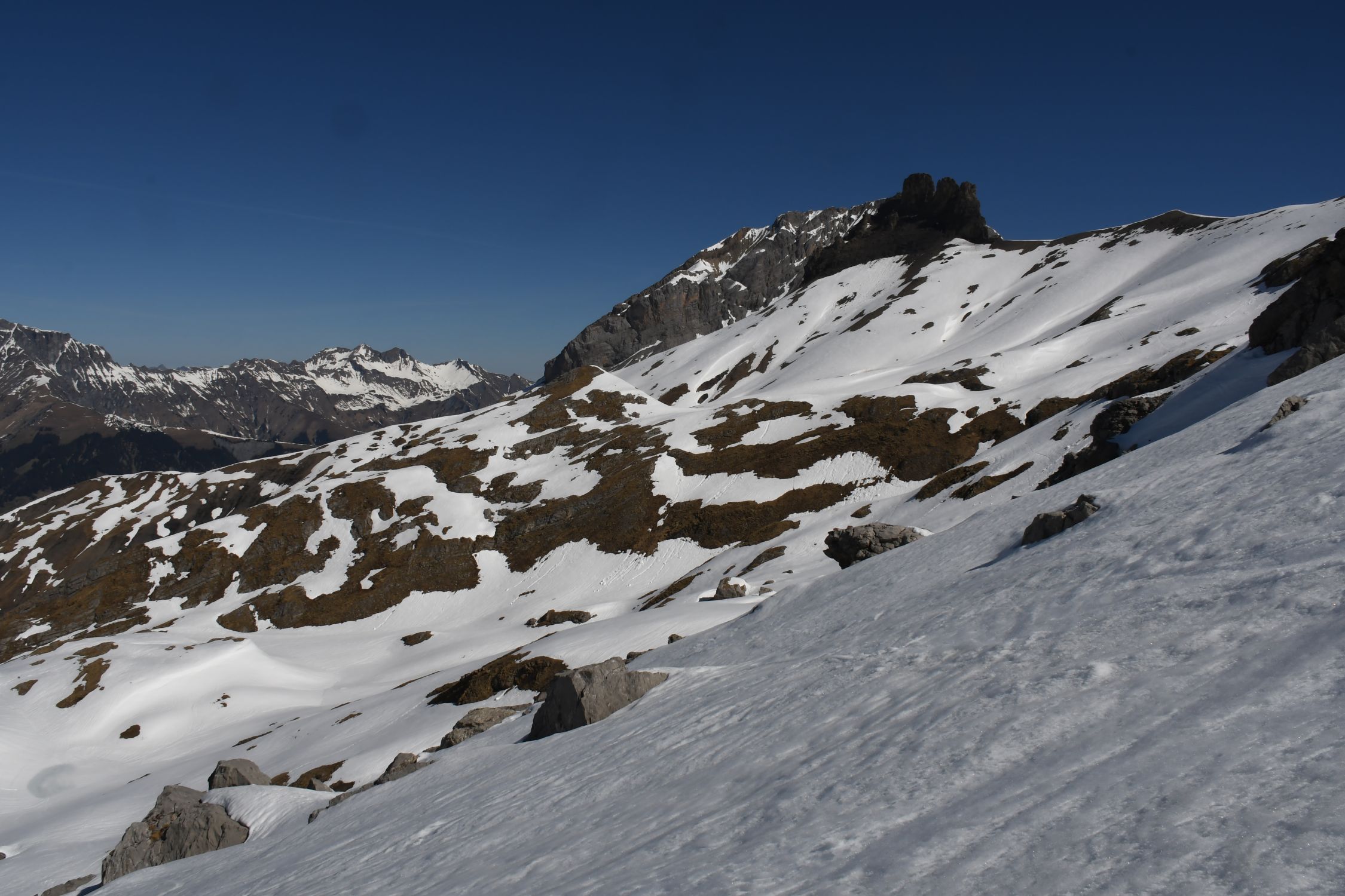 Ganz gute und vor allem sichere Verhältnisse. Vom Dossenlift über ziemlich harten Schnee teils mit Hilfe von Harscheisen hochgestiegen. Es macht Sinn nicht zu früh loszulegen damit man bei der Abfahrt den Sulz geniessen kann. Am Gipfel wie üblich eine tiefe Spur.