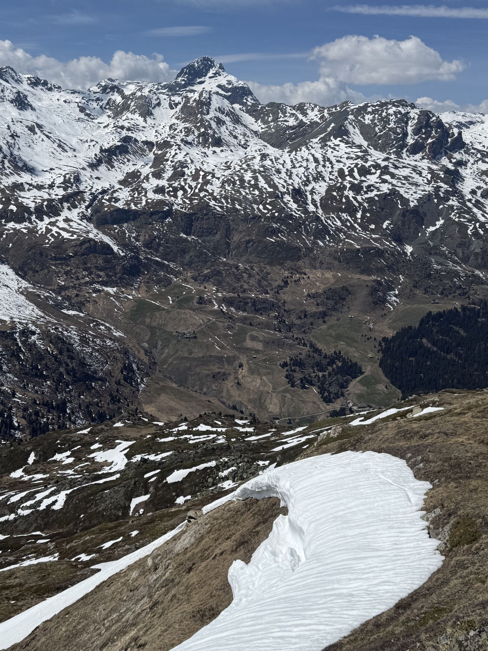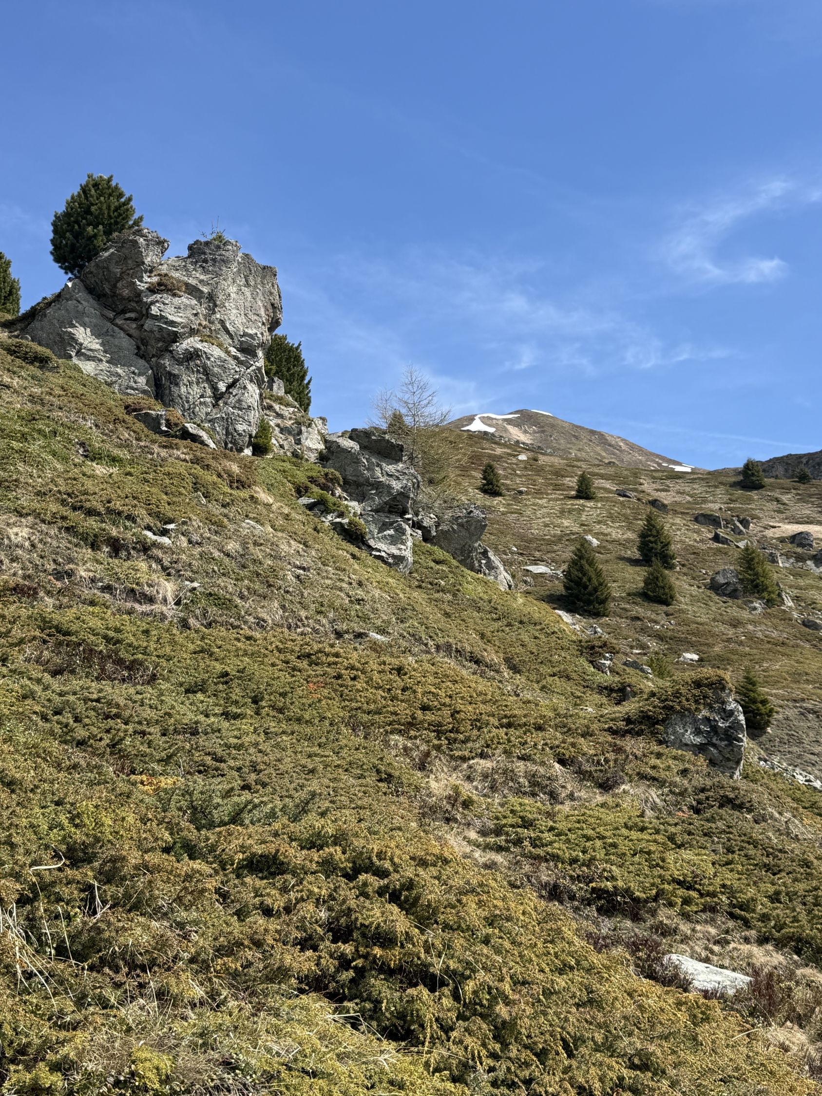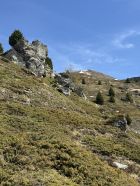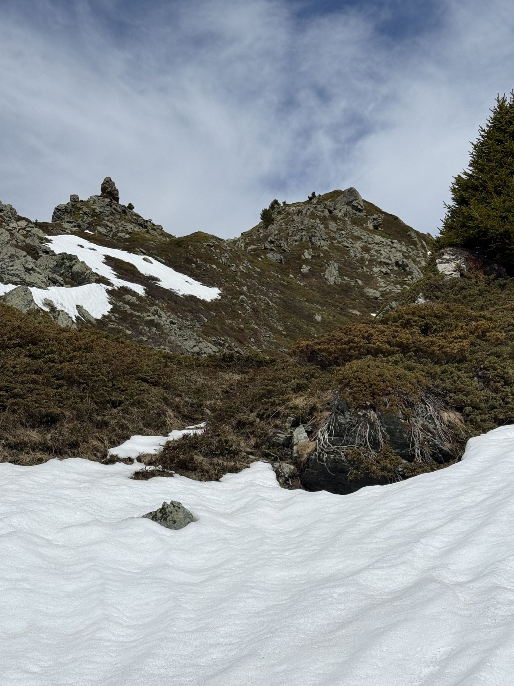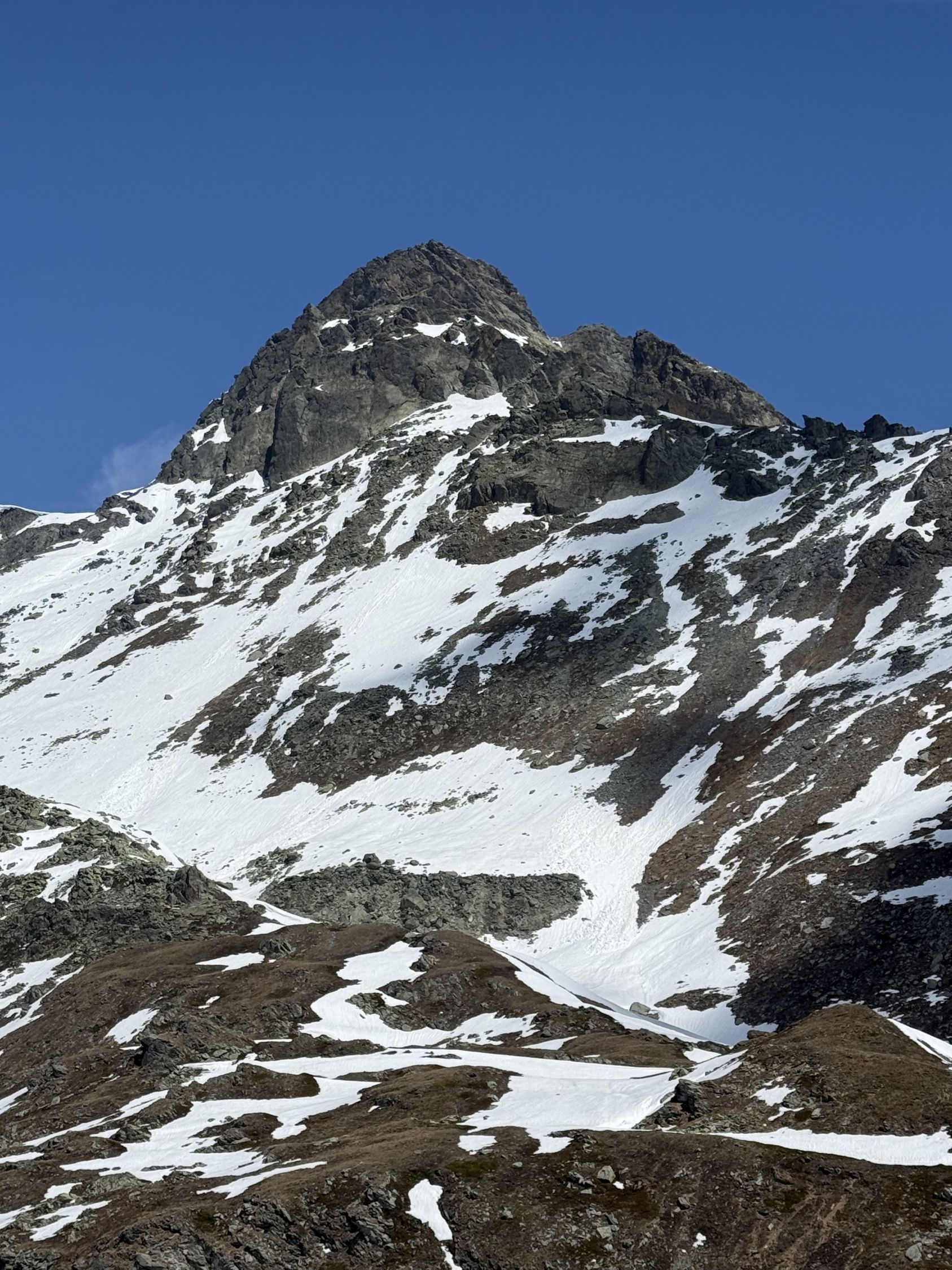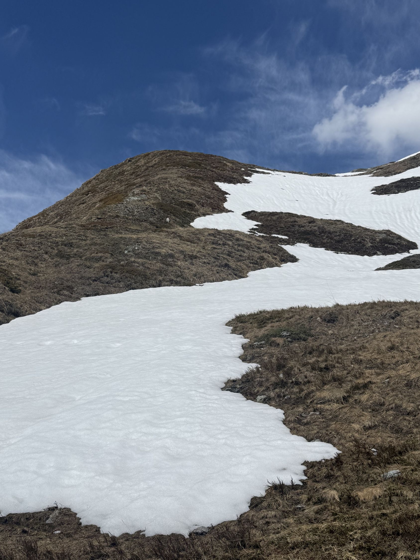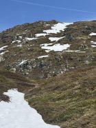 Rundtour auf den Aussichtsgipfel hoch über Bivio (Westflanke, Südflanke), ÖV Tour, T4-. Start Bivio Posta Bushaltestelle 11.20 Uhr, 10 Grad, windstill, leicht bewölkt. Den schönen markierten Wanderweg hoch bis Punkt 2132, Abzweigung Murter. Nun alles weglos die steile Westflanke hoch, die Schneefelder umgangen bis zum Gipfel. Abstieg auf dem markierten Wanderweg, in der Südflanke viel Schnee bis zum Punkt 2132. Jetzt ohne Schnee den Wanderweg runter bis Bivio.