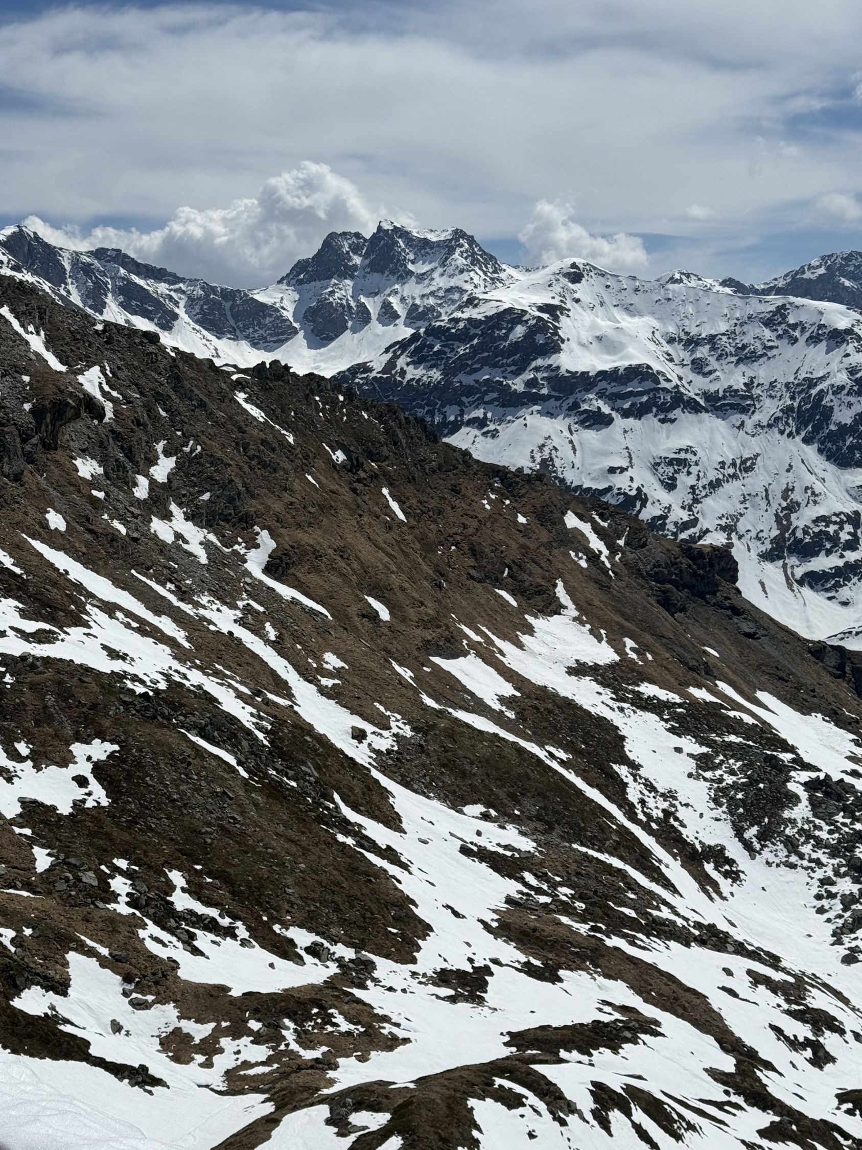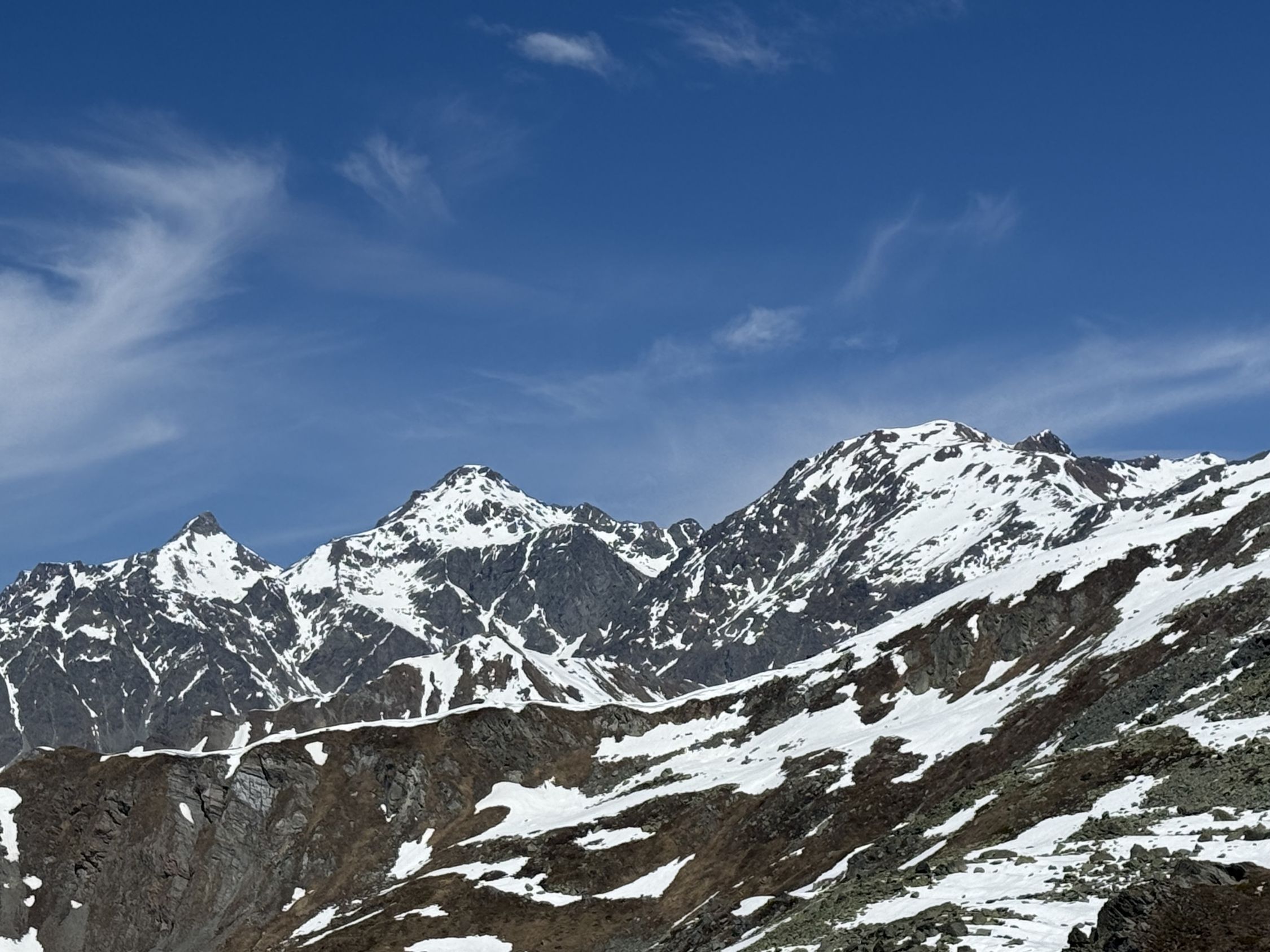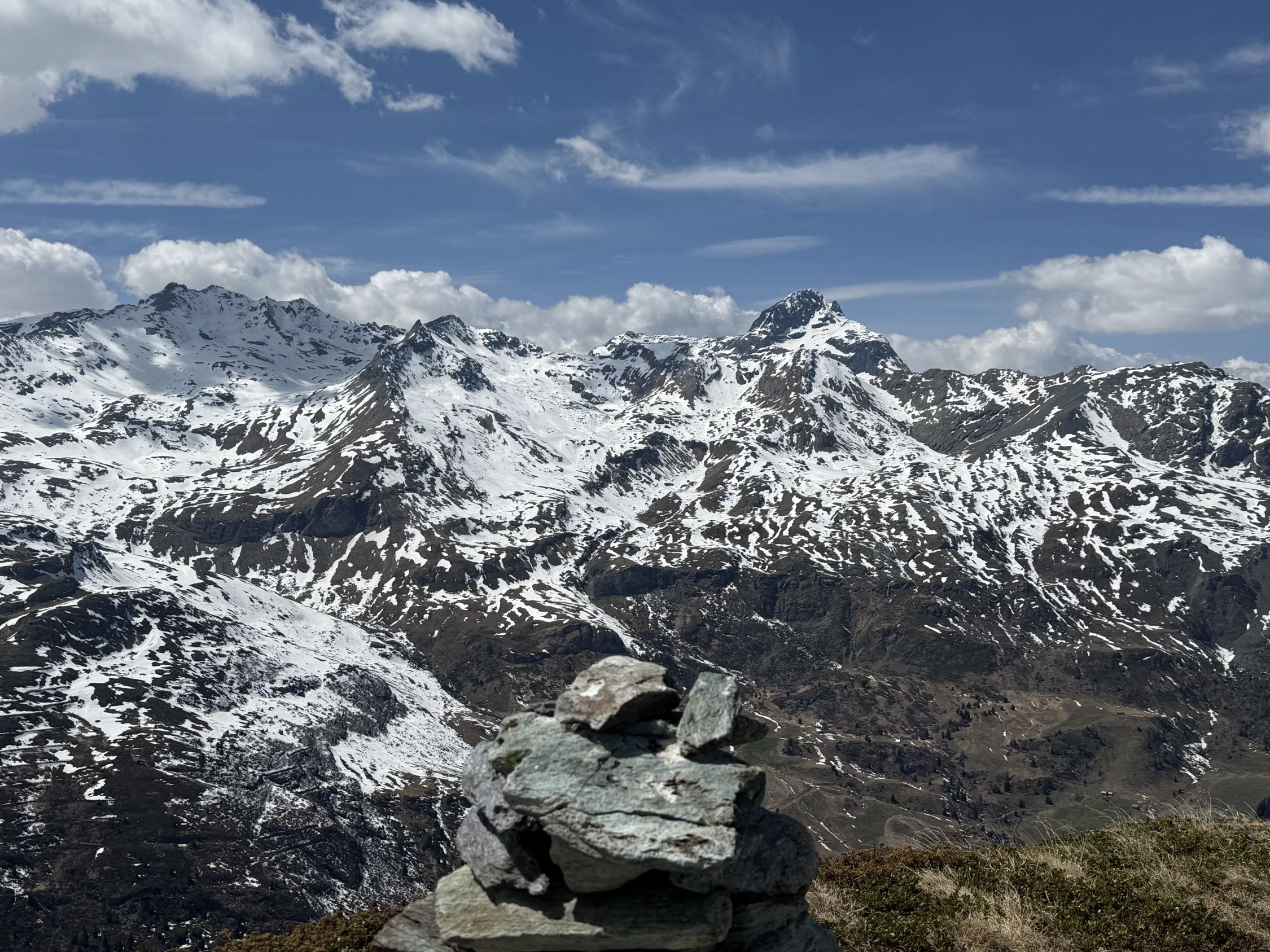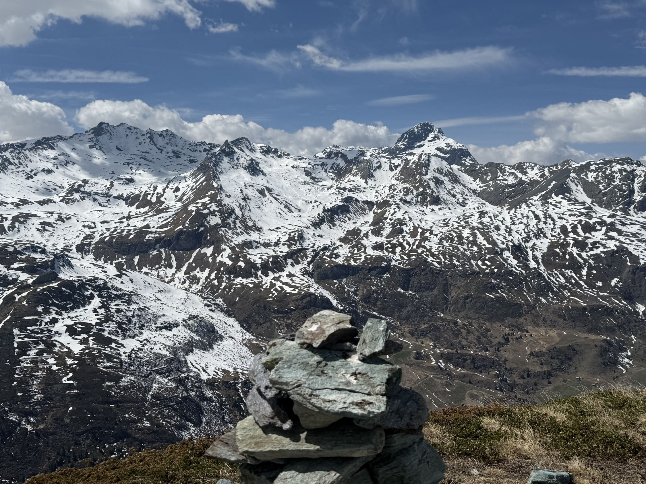 Rundtour auf den Aussichtsgipfel hoch über Bivio (Westflanke, Südflanke), ÖV Tour, T4-. Start Bivio Posta Bushaltestelle 11.20 Uhr, 10 Grad, windstill, leicht bewölkt. Den schönen markierten Wanderweg hoch bis Punkt 2132, Abzweigung Murter. Nun alles weglos die steile Westflanke hoch, die Schneefelder umgangen bis zum Gipfel. Abstieg auf dem markierten Wanderweg, in der Südflanke viel Schnee bis zum Punkt 2132. Jetzt ohne Schnee den Wanderweg runter bis Bivio.