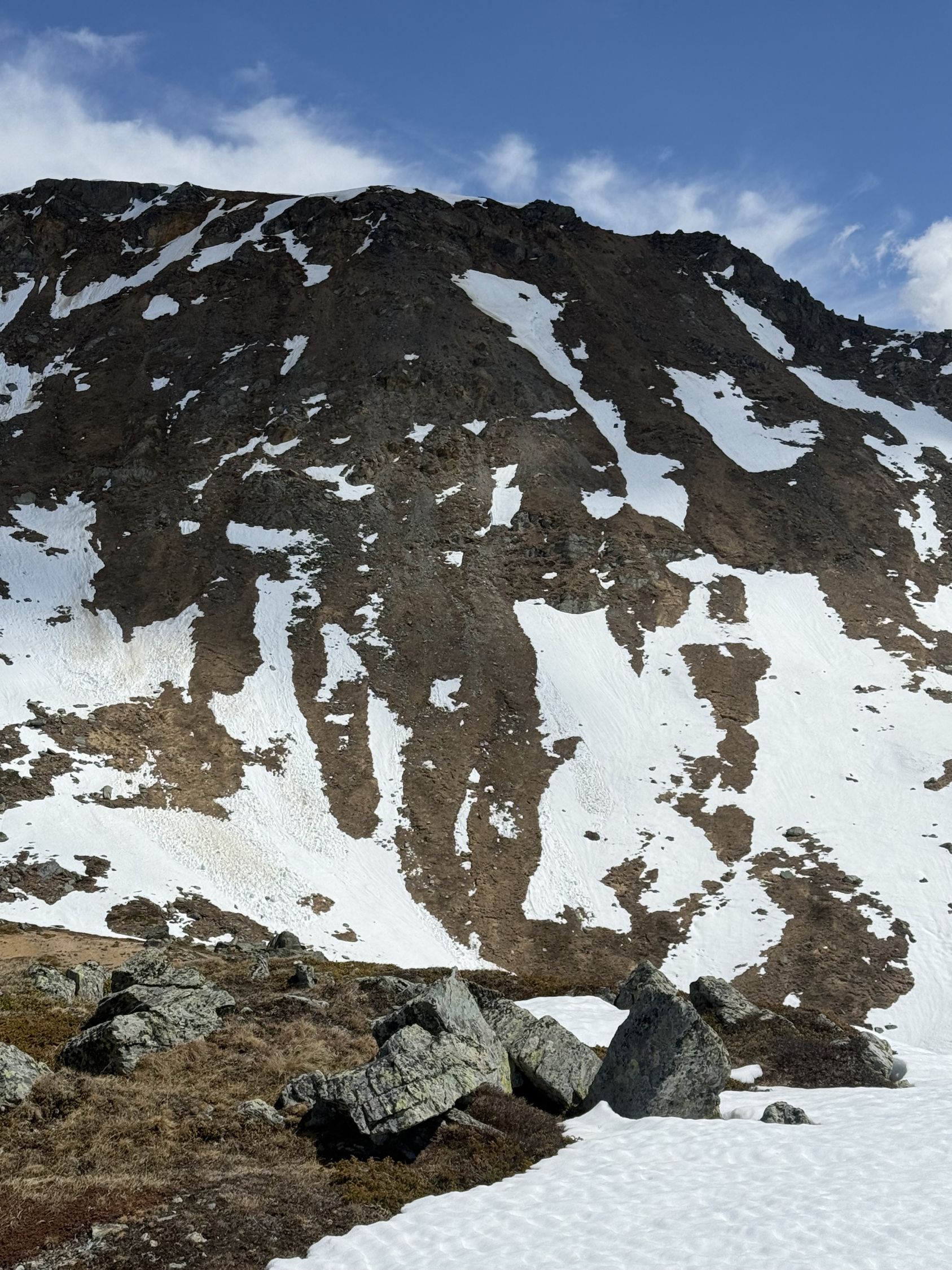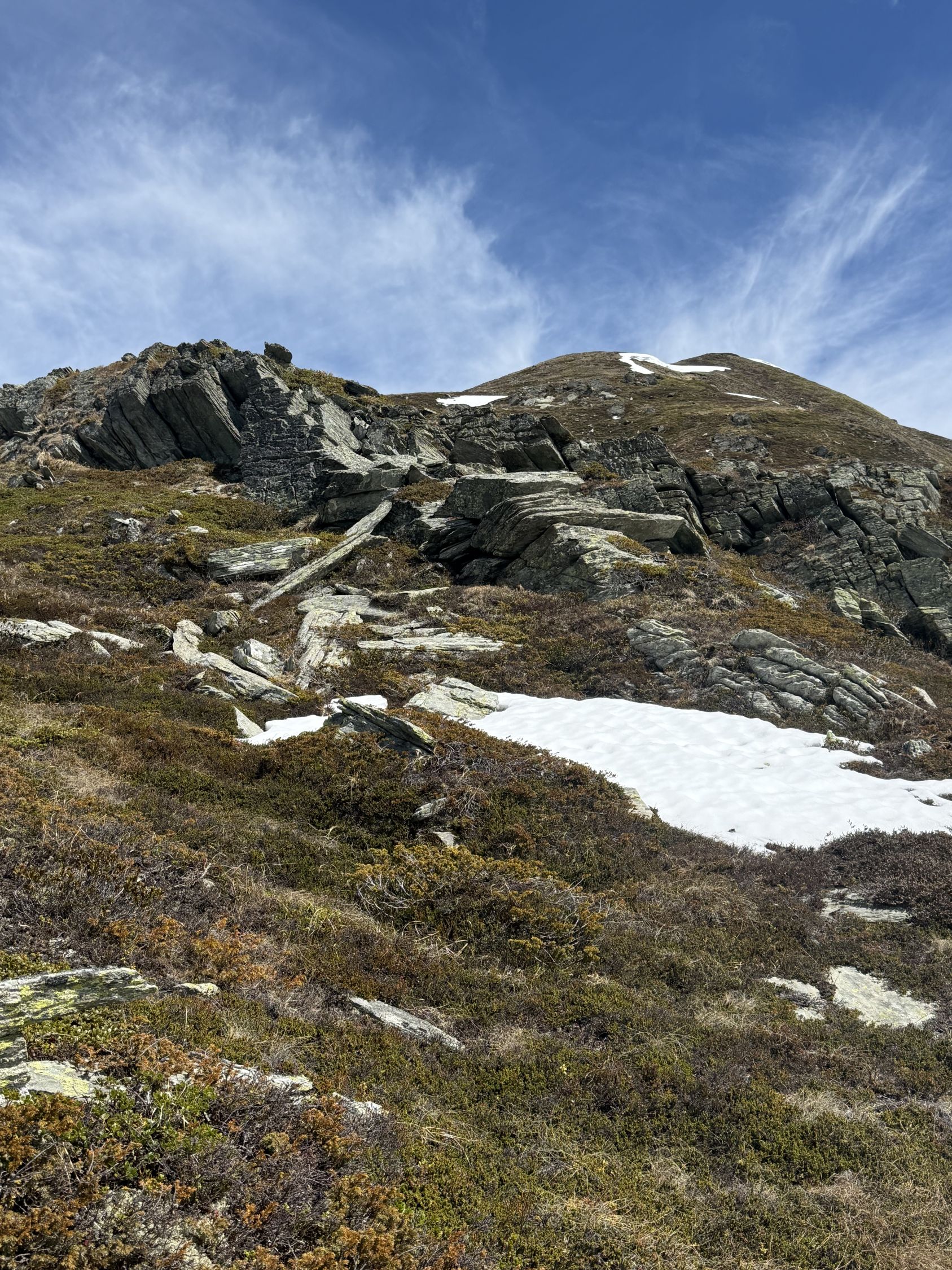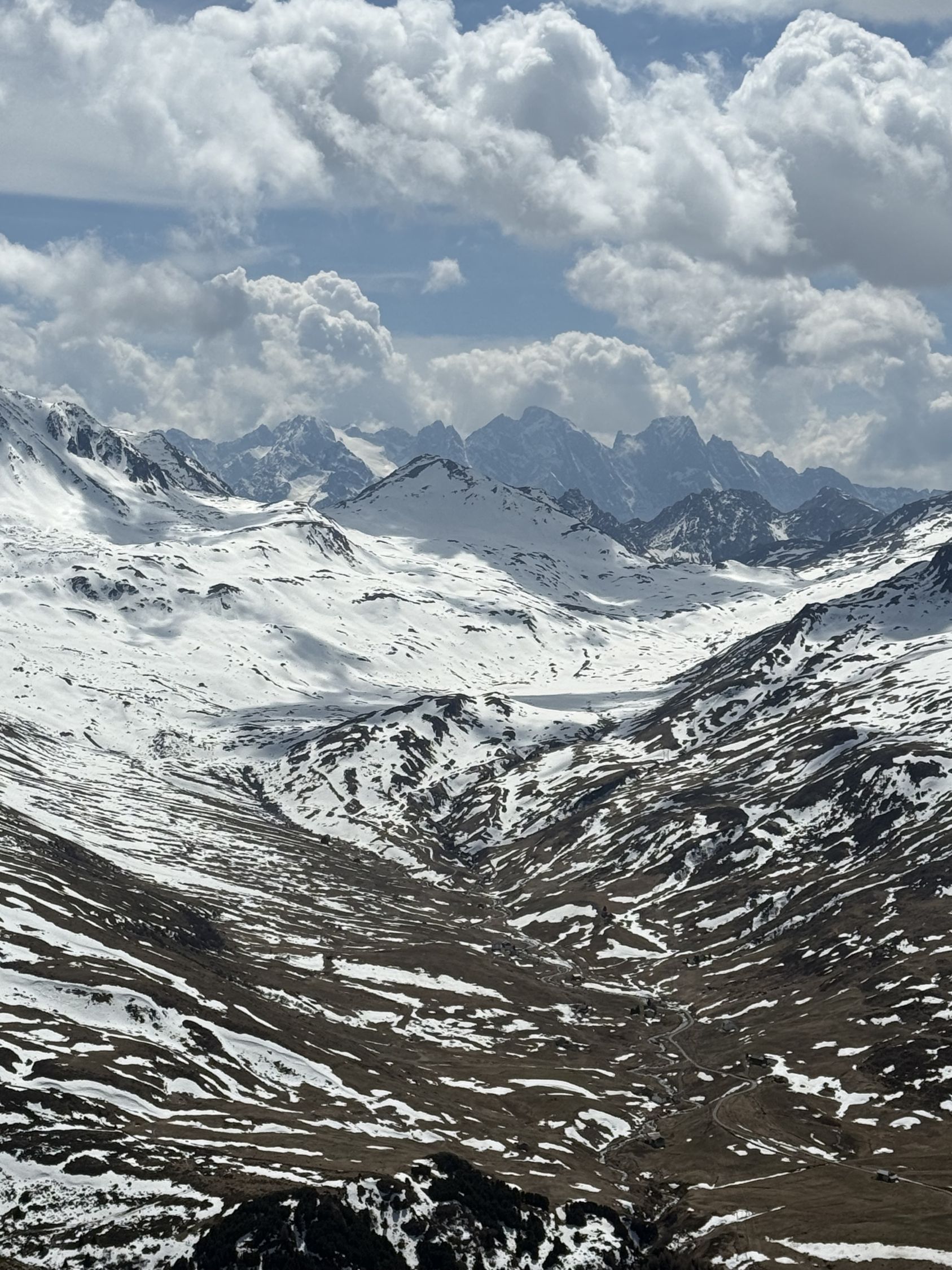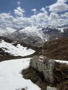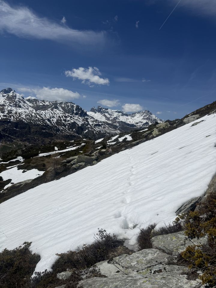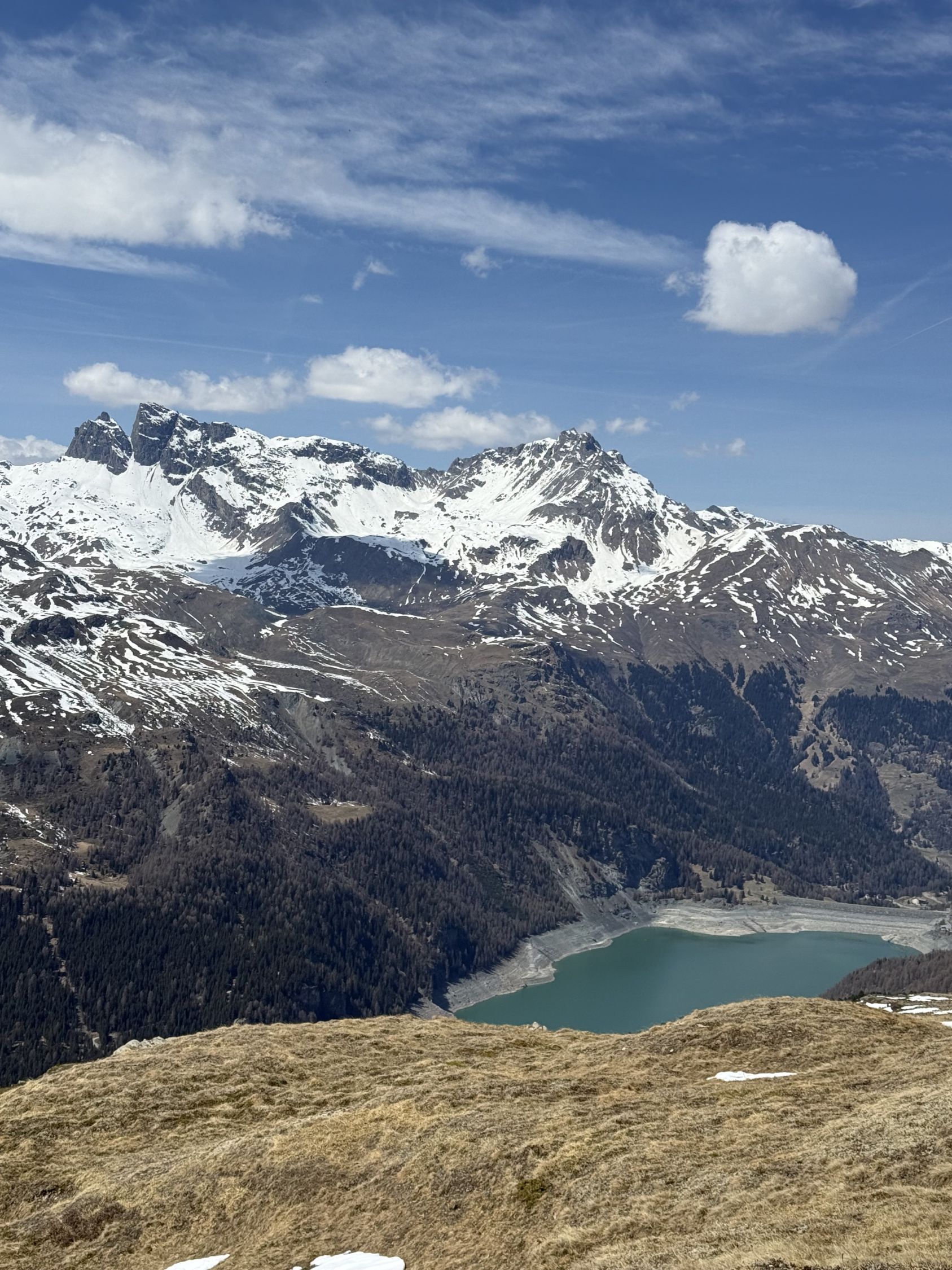 Rundtour auf den Aussichtsgipfel hoch über Bivio (Westflanke, Südflanke), ÖV Tour, T4-. Start Bivio Posta Bushaltestelle 11.20 Uhr, 10 Grad, windstill, leicht bewölkt. Den schönen markierten Wanderweg hoch bis Punkt 2132, Abzweigung Murter. Nun alles weglos die steile Westflanke hoch, die Schneefelder umgangen bis zum Gipfel. Abstieg auf dem markierten Wanderweg, in der Südflanke viel Schnee bis zum Punkt 2132. Jetzt ohne Schnee den Wanderweg runter bis Bivio.