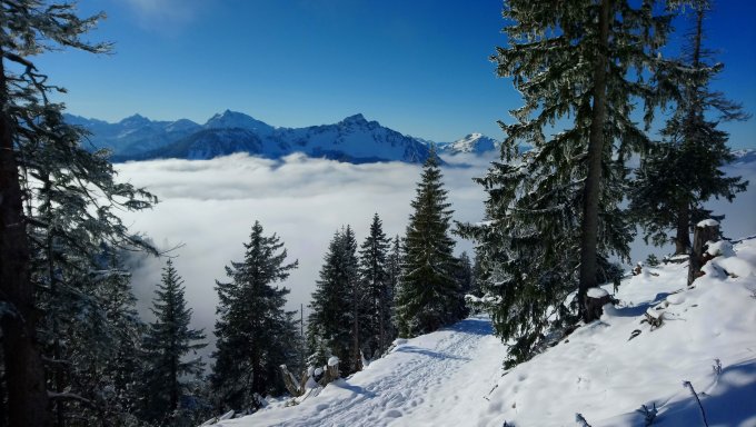 Gerade ausreichend Schnee für die Rodelstrecke. Weg war nicht gewalzt. Obstlerhütte geschlossen. Eingige auch mit Ski unterwegs. Der pulvrige Schnee wird sicher schnell zusammengetreten für eine gute Rodelstrecke.