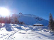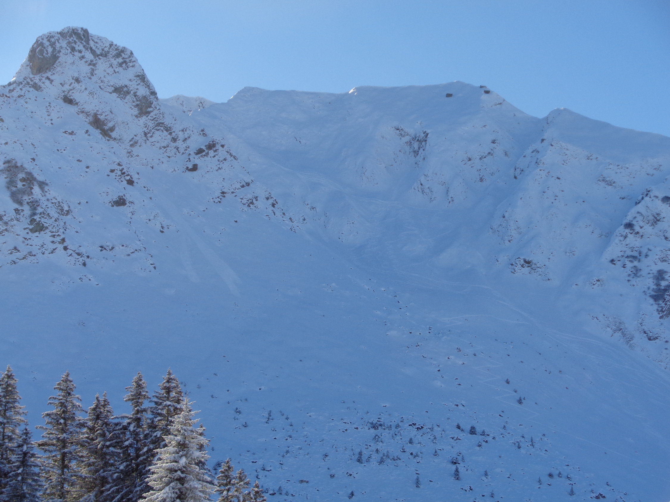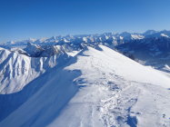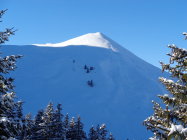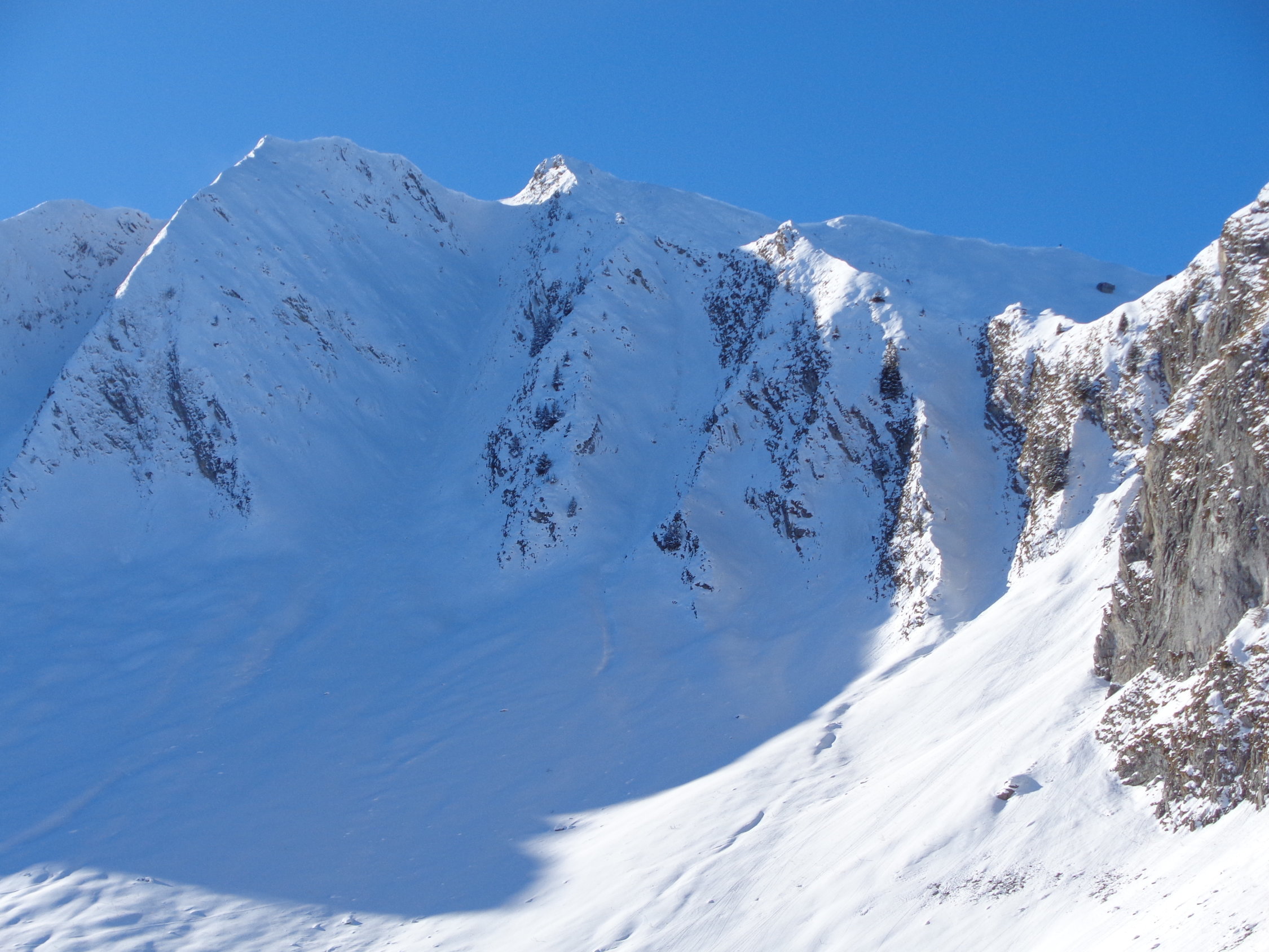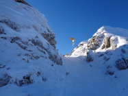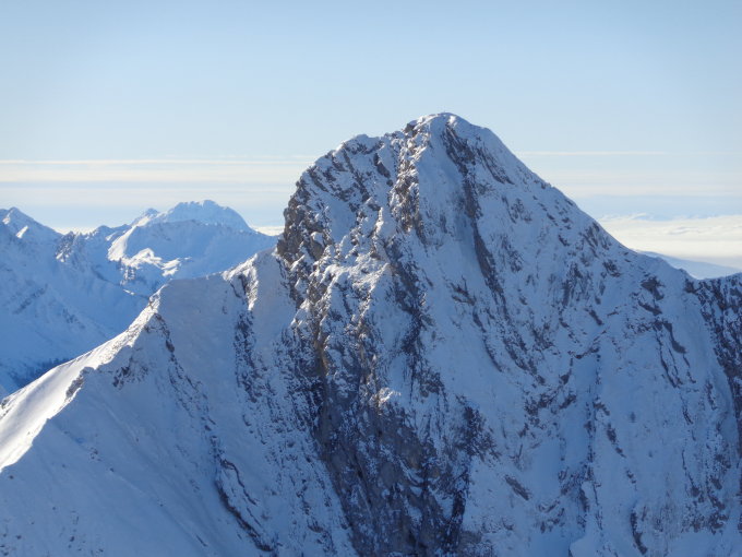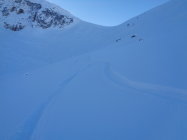 Aufstieg und Abfahrt: 30cm bis 50cm Pulverschnee ohne Unterlage. Die Abfahrt durch die Nordflanke geht bei umsichtiger Fahrweise gut, und ist lohnend. Siehe Film. Es waren ca. 20 Abfahrtsspuren in der Nordflanke.