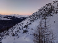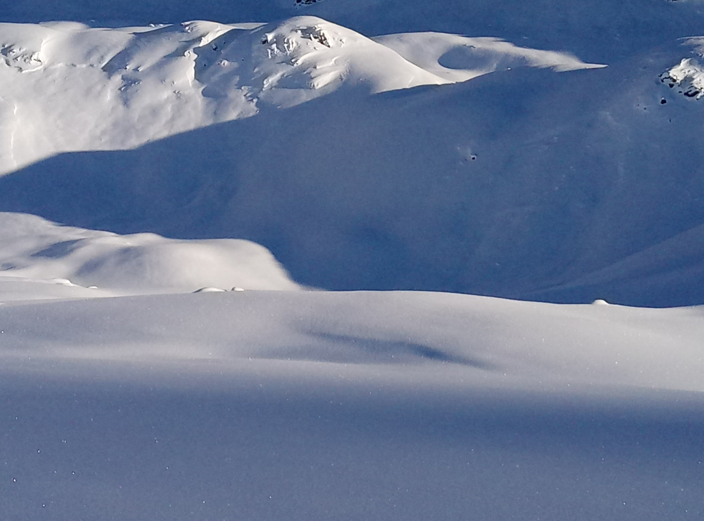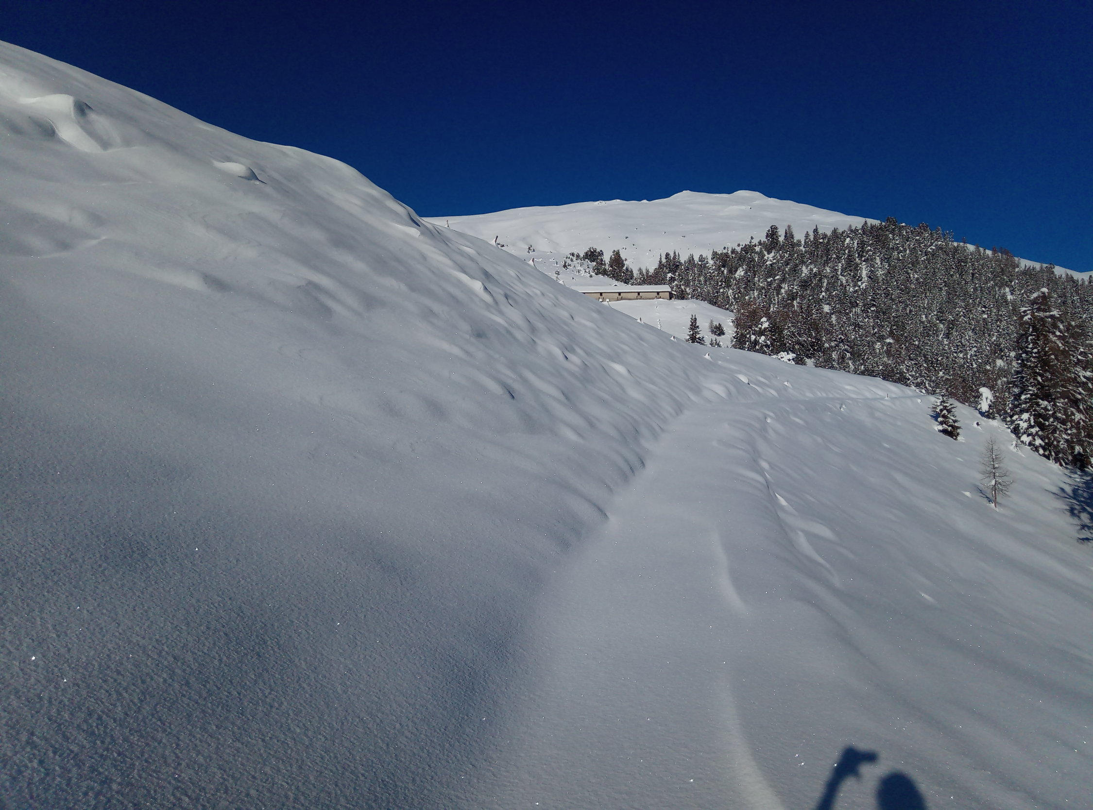 Triebschnee gesehen. Nicht viele (alte) Lawinen gesehen. Wumm Geräusch einmal gehört.