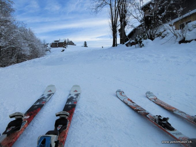 Morgens noch bleiche Sonne, knapp unter dem Gefrierpunkt. Es hat ca 25 cm gut gesetzten Schnee. Die obersten 10 cm schön locker und leicht.