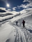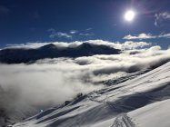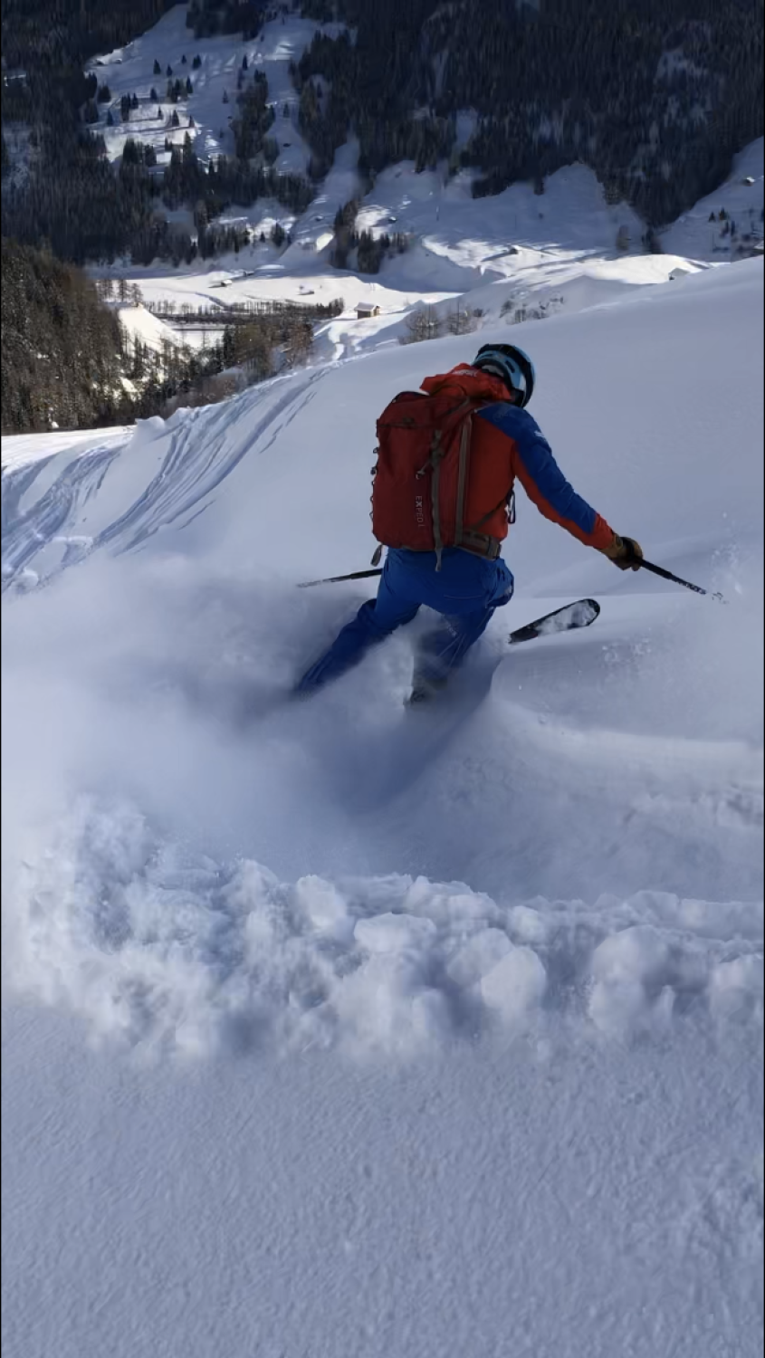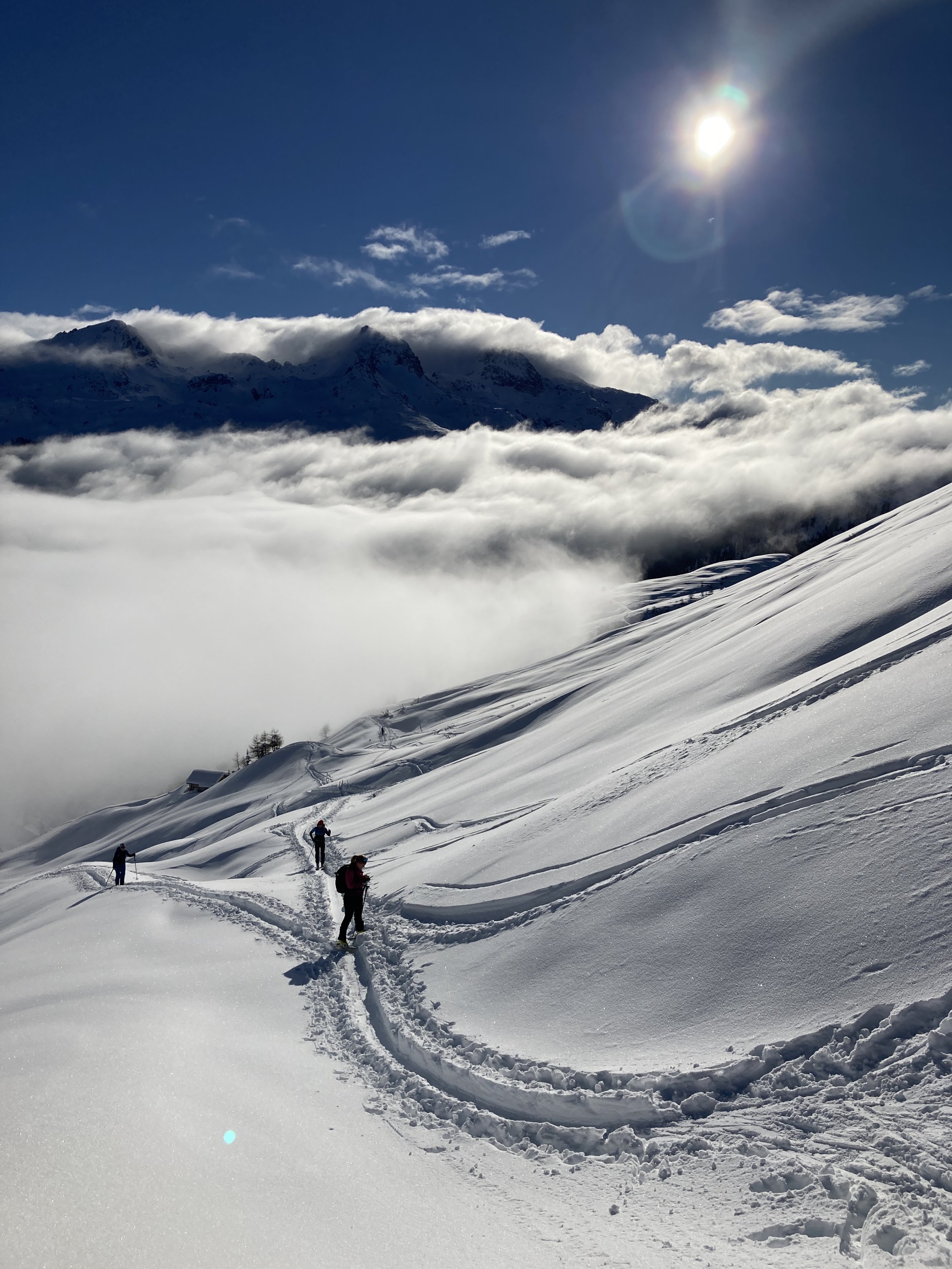 Gute Spur im Aufstieg, super Wetter und Traumpulverschnee in der Abfahrt. Nun sind einige Hänge verfahren, aber es hat noch genügend Platz um eine Line zu ziehen.