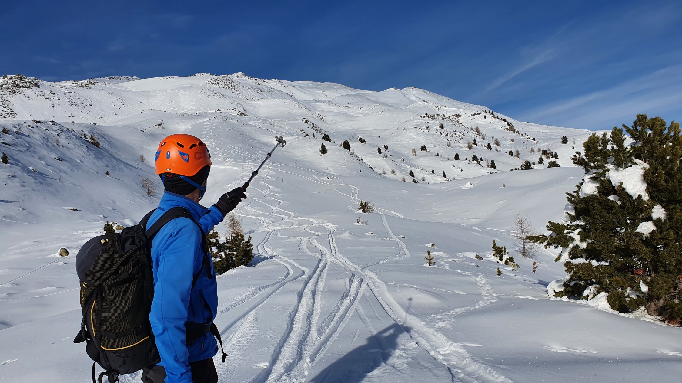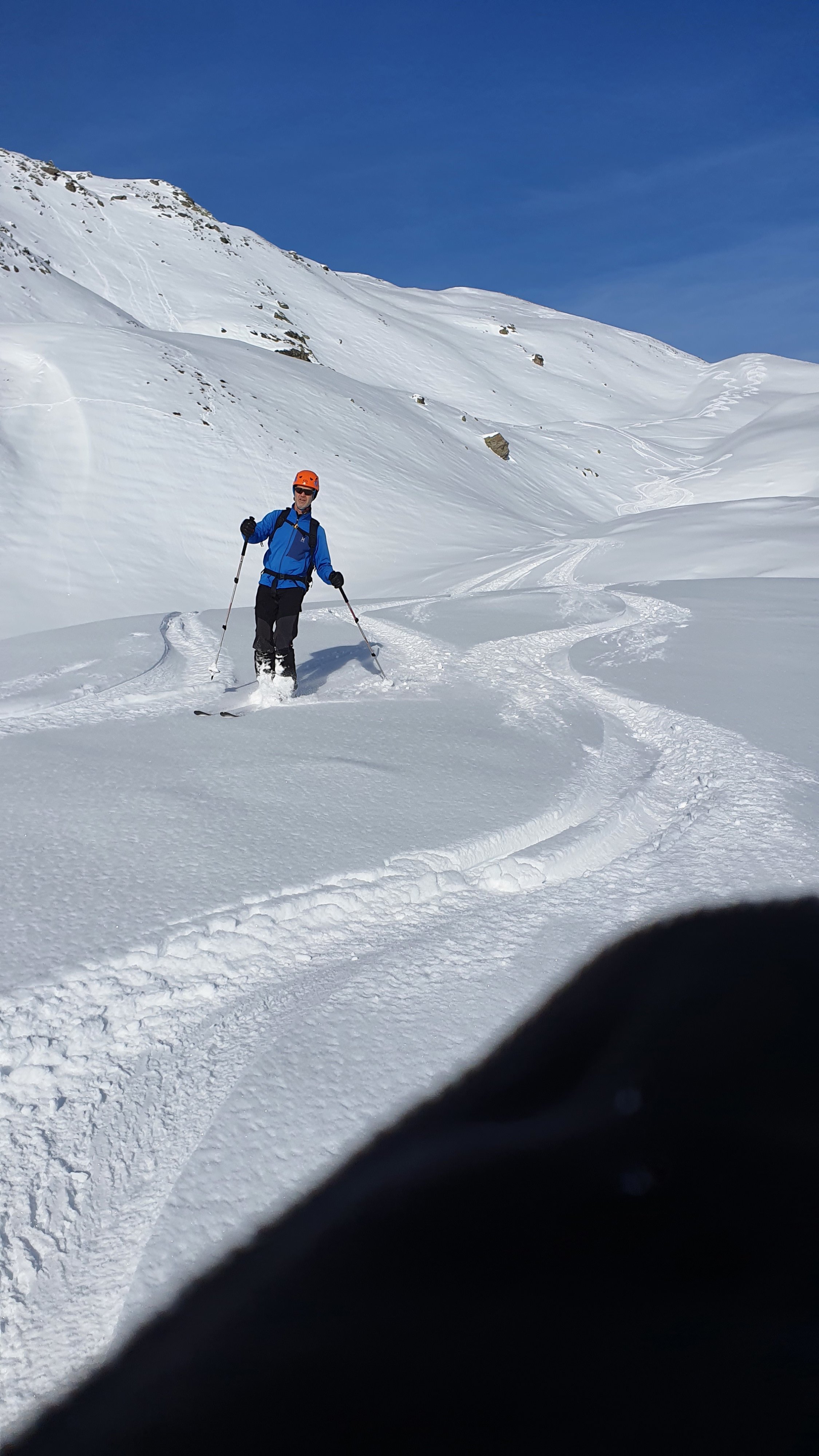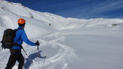 Abfahrt nach Valchava. Obere Hälfte feiner Pulver, unten schon stark angefeuchtet von Sonne und hohen Temperaturen. Wir sind hemdsärmlig aufgestiegen.