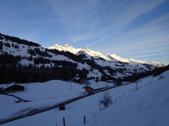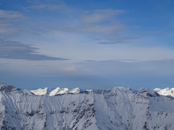 Im unteren Drittel hat der Schnee angezogen, etwas schwer, aber noch gut zu drehen. Hier aber auch ziemlich verfahren. Ab den Hütten war der Schnee heute immer noch recht lockerer Pulverschnee, bis ca. 2200-2300m. Danach zunehmend schwerer aufgrund der Sonneneinstrahlung vom Vortag und heute. Das letzte Stück zum Gipfel hat sehr wenig Schnee, hier müssen die Ski ein Stück abwärts getragen werden (hoch ging). Wunderschöne Gipfelsicht auf die grossen Berner mit stimmungsvollen Wolken. Teils sonnig, teils windig. Bei Sonne angenehm warm.