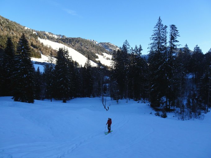 Schneelage recht gut für die niedrige Ausgangshöhe; da sehr kompakt, auch in den Waldpassagen ausreichend. Von Samstag auf Sonntag gab´s nochmal 20-25 cm Neuschnee, allerdings bis oben hin durchfeuchtet. Abfahrt dementsprechend: oben schwerer Pulver, unten klebriger Nassschnee. Kein Genuss, aber passabel.