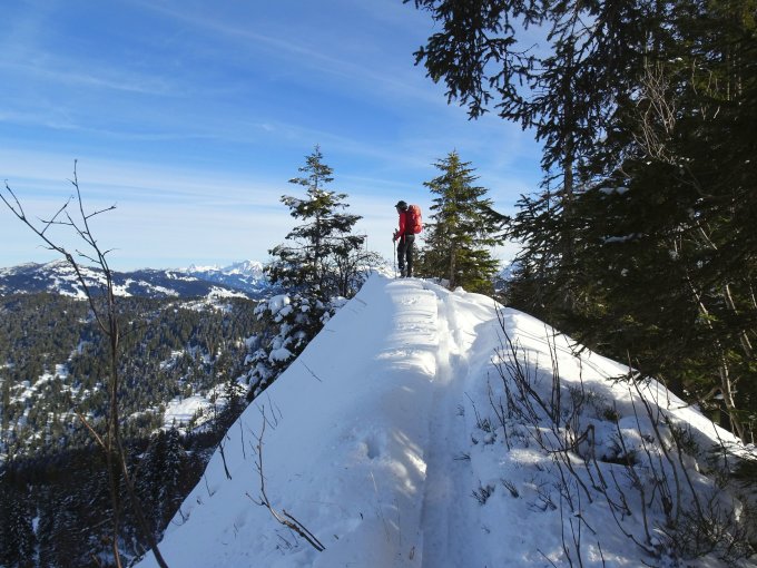 Viele Setzungsgeräusche in unterschiedlichen Expositionen. Der steile Schlusshang zum Feuerstätterkopf war uns daher zu heikel. Statt dessen sind wir über einen Seitenkamm mit Erlengewühle, zuletzt zu Fuß zum Grat gelangt. Überwiegend selbst gespurt, nur zwei andere Tourengeher getroffen heute.