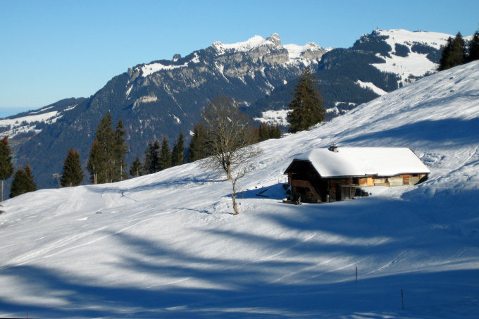 Der Lift lief nicht mehr und die Piste wurde deswegen auch nicht mehr gepflegt und war auch hart. Zudem mussten wir ein paar mal die Strasse (ohne Schnee, da frisch geräumt) überqueren.